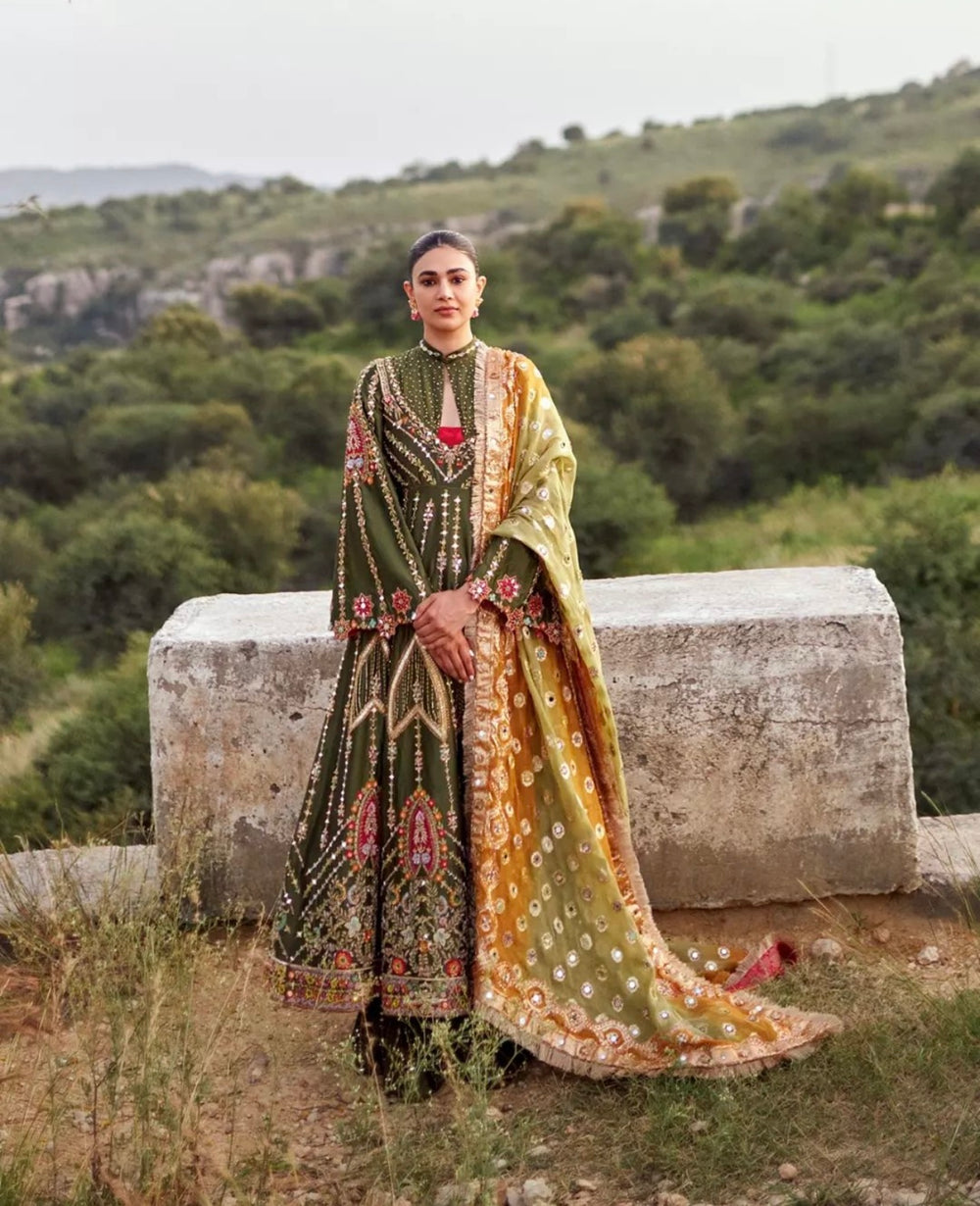 Ahmad Sultan’s “Antara” is a luxurious bridal suit known for its intricate detailing, rich fabrics, and fusion of traditional and modern designs. It features heavy embroidery, embellishments, and a palette of deep, regal colors, perfect for brides seeking opulence and elegance.