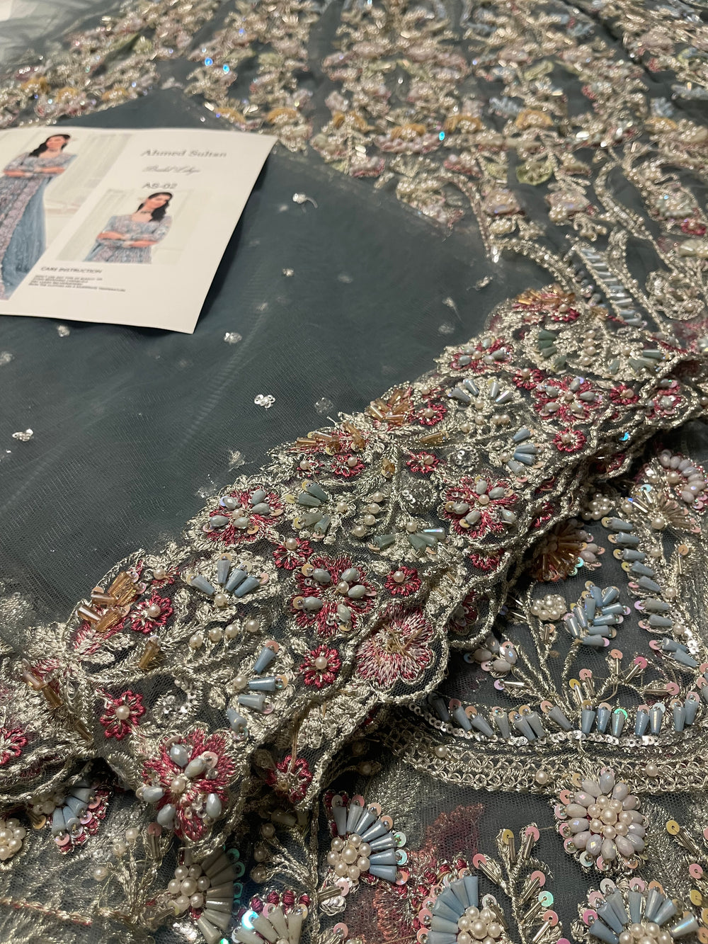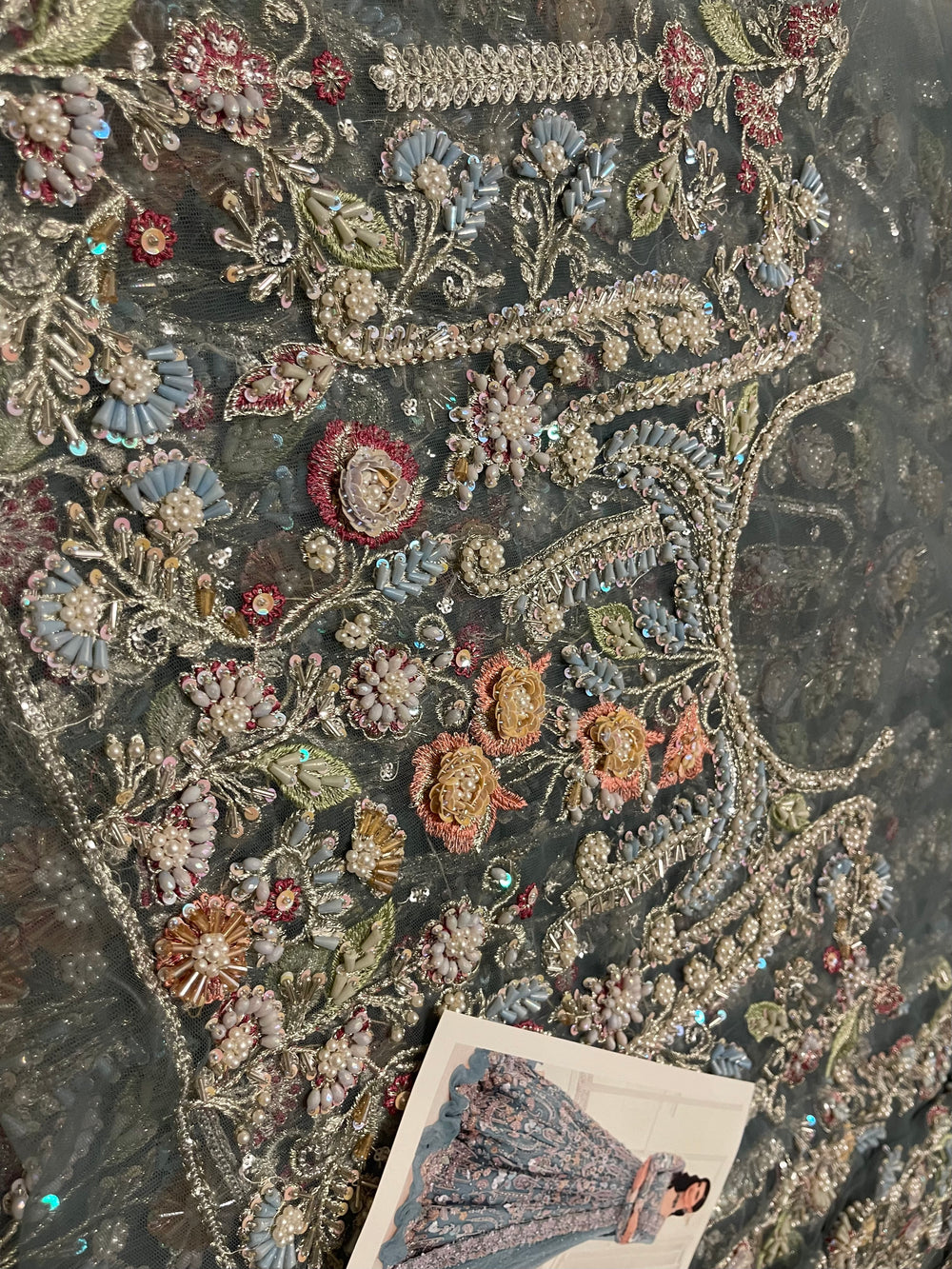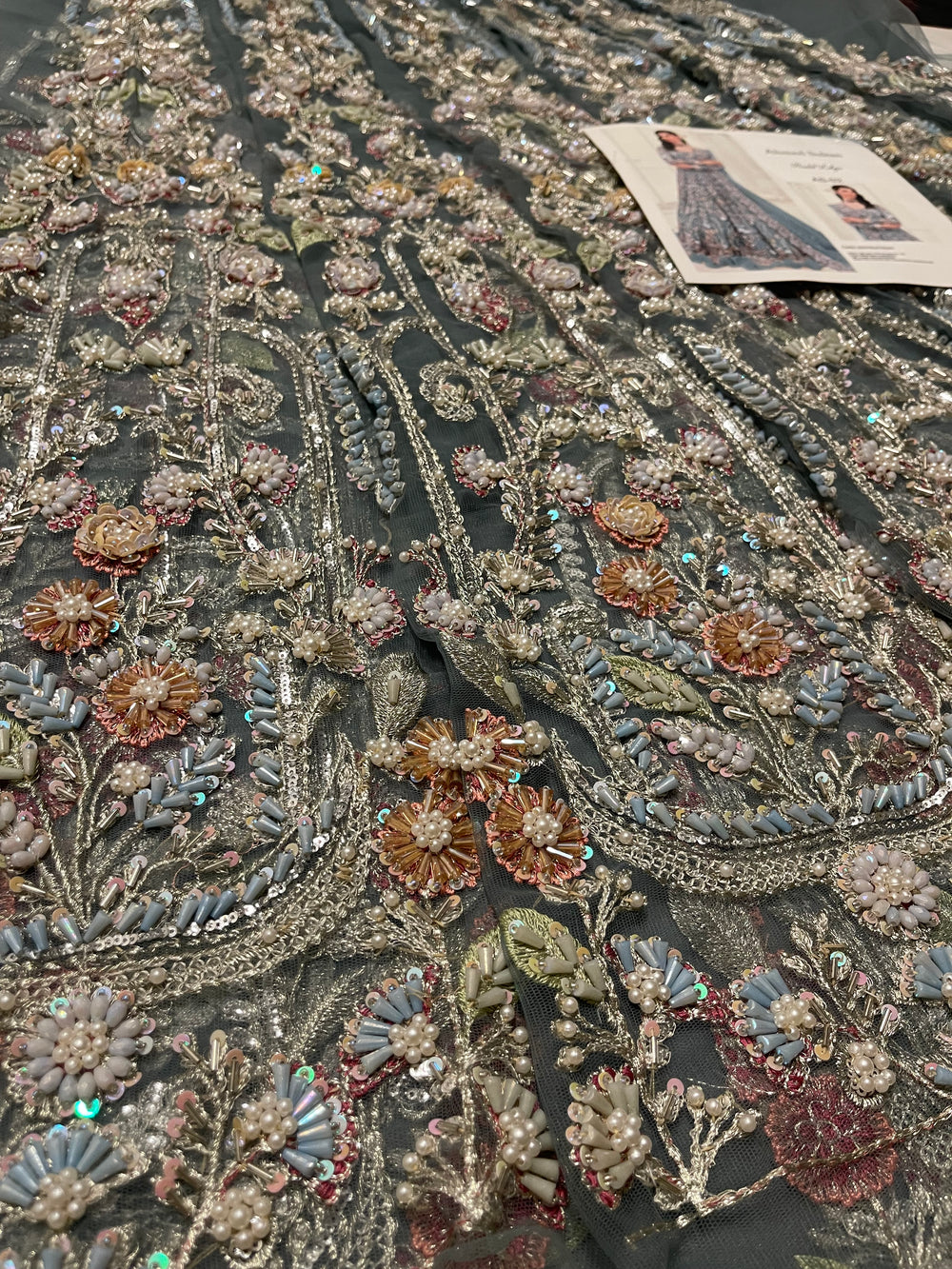 Orchid radiates the charm of a harmonious color palette with the artistic blend of accents of rose pink, dull yellow, and heavy detailing of sequenced handwork on a sheer canvas.