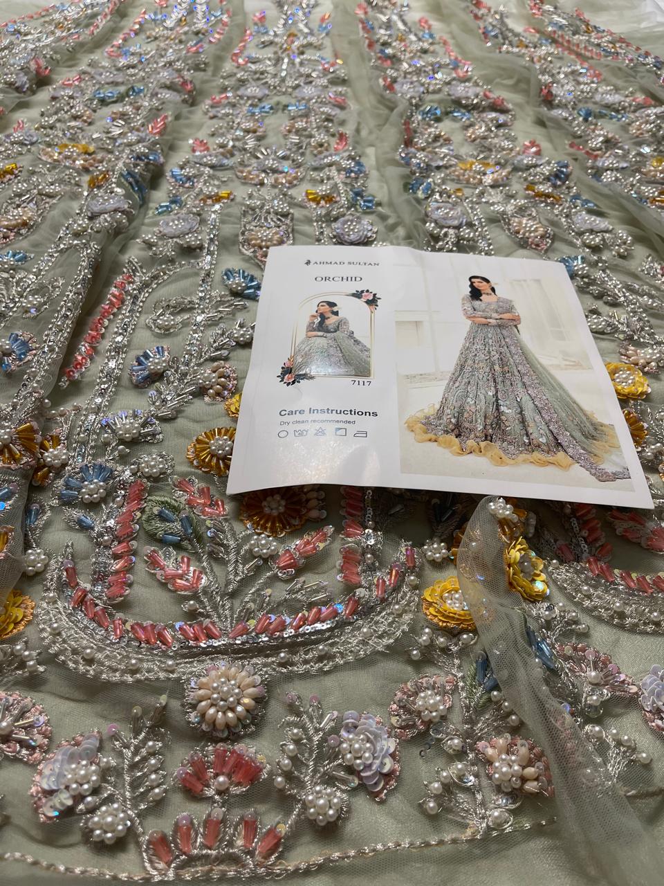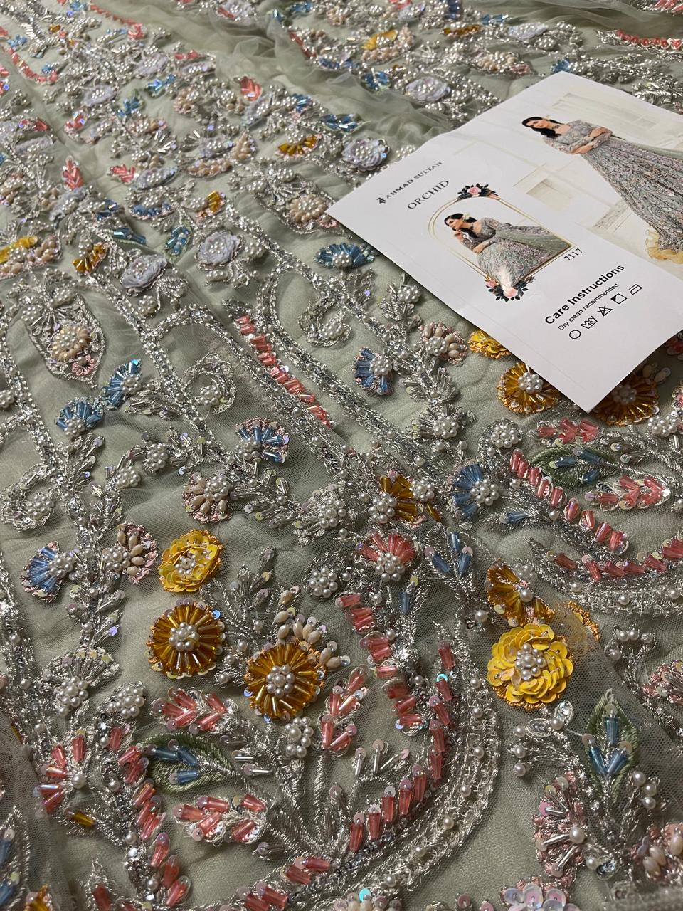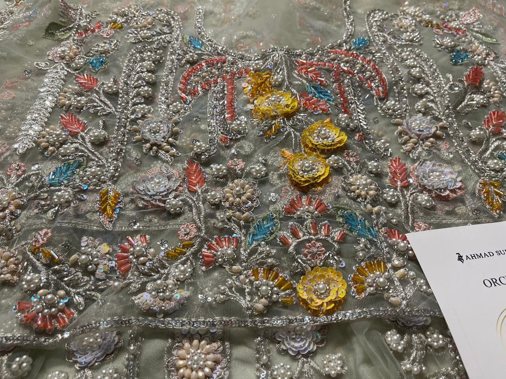 Orchid radiates the charm of a harmonious color palette with the artistic blend of accents of rose pink, dull yellow, and heavy detailing of sequenced handwork on a sheer pistachio green canvas.