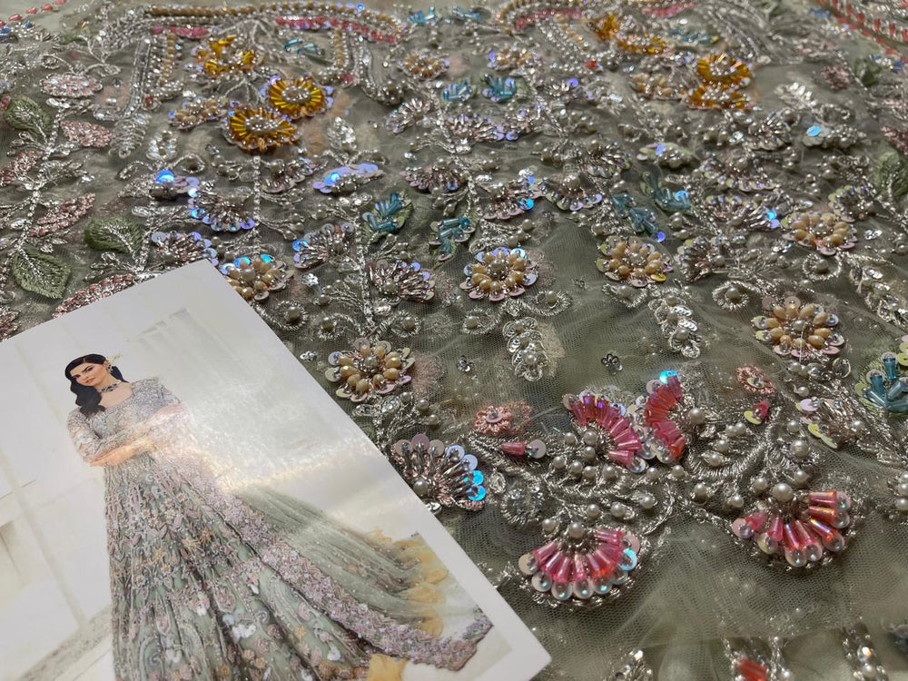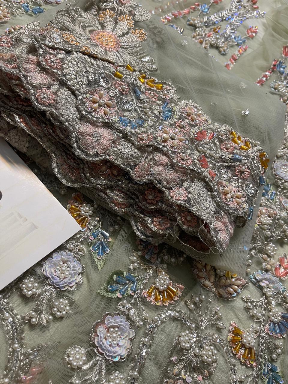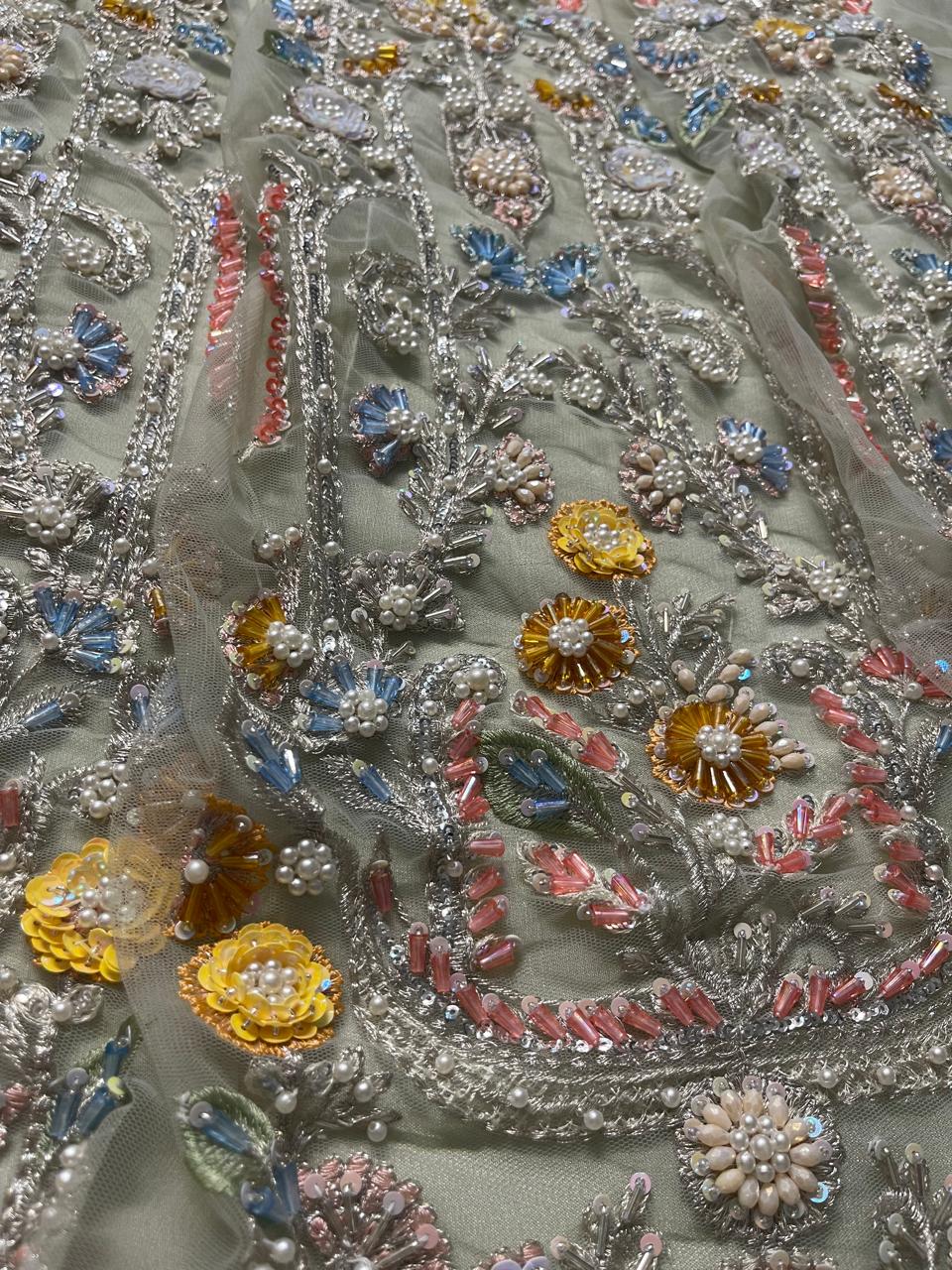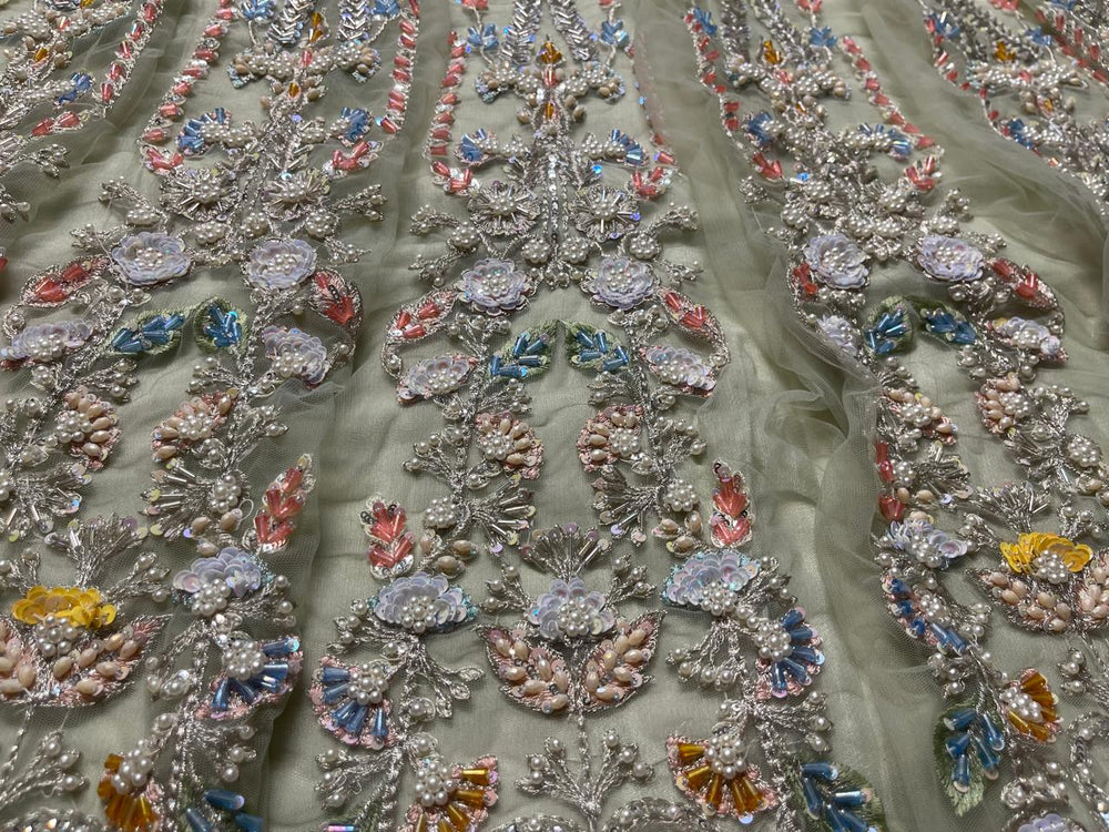 Orchid radiates the charm of a harmonious color palette with the artistic blend of accents of rose pink, dull yellow, and heavy detailing of sequenced handwork on a sheer pistachio green canvas.