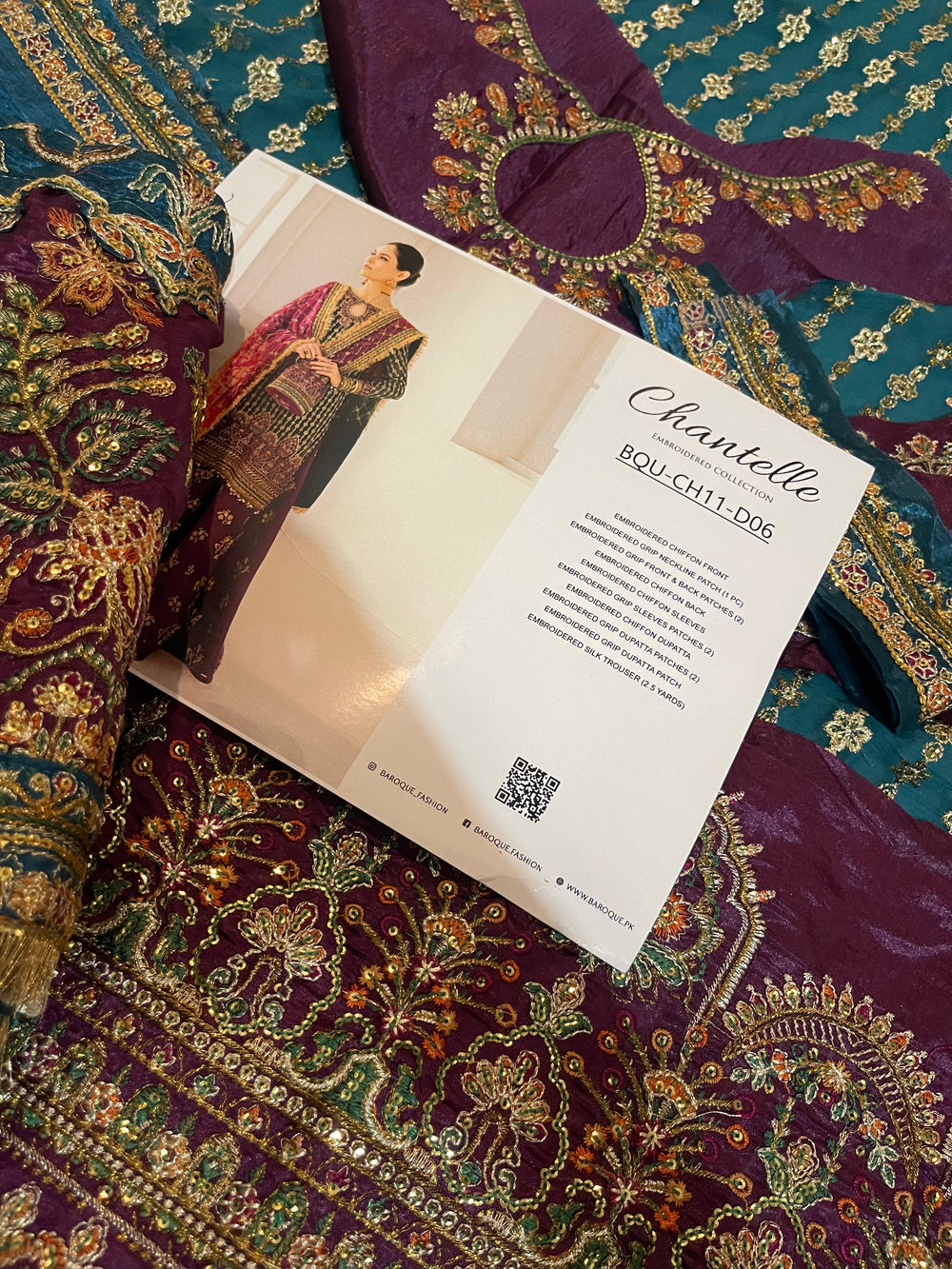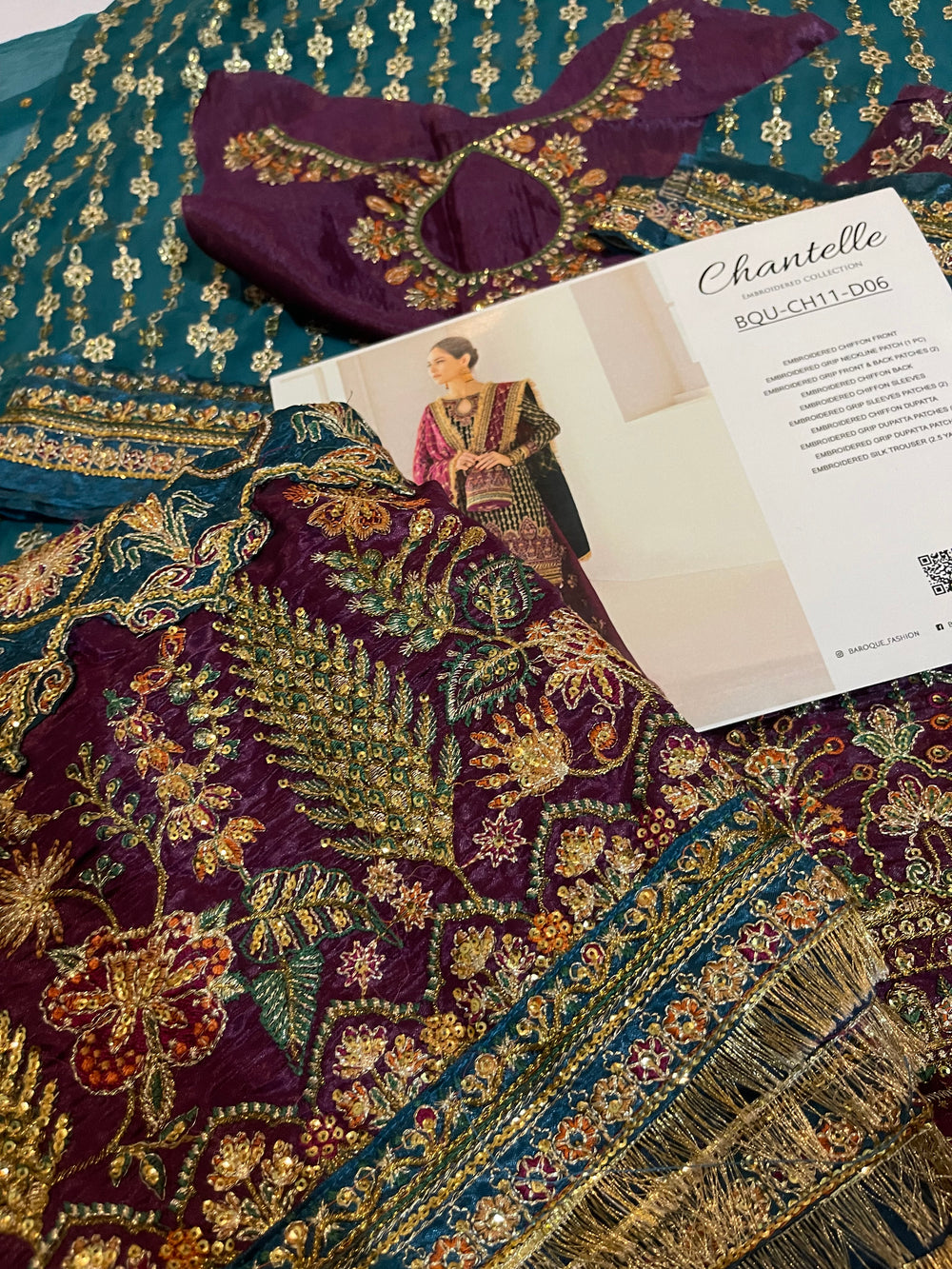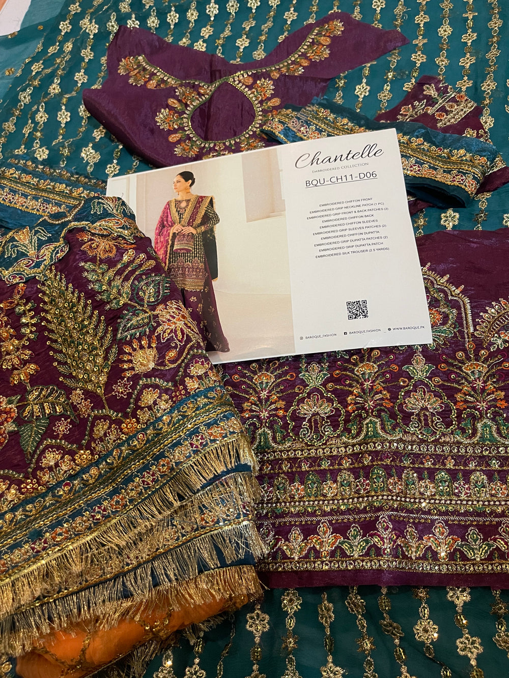 Experience sheer luxury with our exquisite chiffon ensemble, where the shirt boasts a captivating combination of gleaming green and magenta purple. Opulence is defined by intricate embroidery adorning the front, back, and sleeves. The chiffon dupatta is a masterpiece of appealing hues and expertly crafted embroidery, complemented by a threaded border. Accompanied by a silk trouser, you have the choice to curate your own style statement, opt for the unstitched option for a personal touch or let us stitch the perfect dress for you. Choose between a short shirt with shararah or a long shirt with churi-dar pajama to suit your individual style.