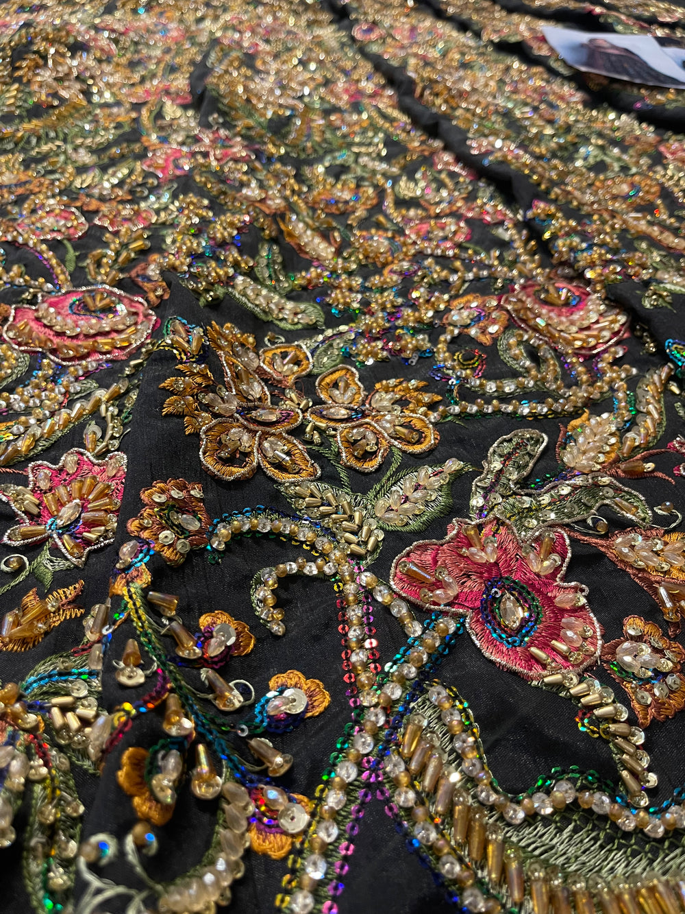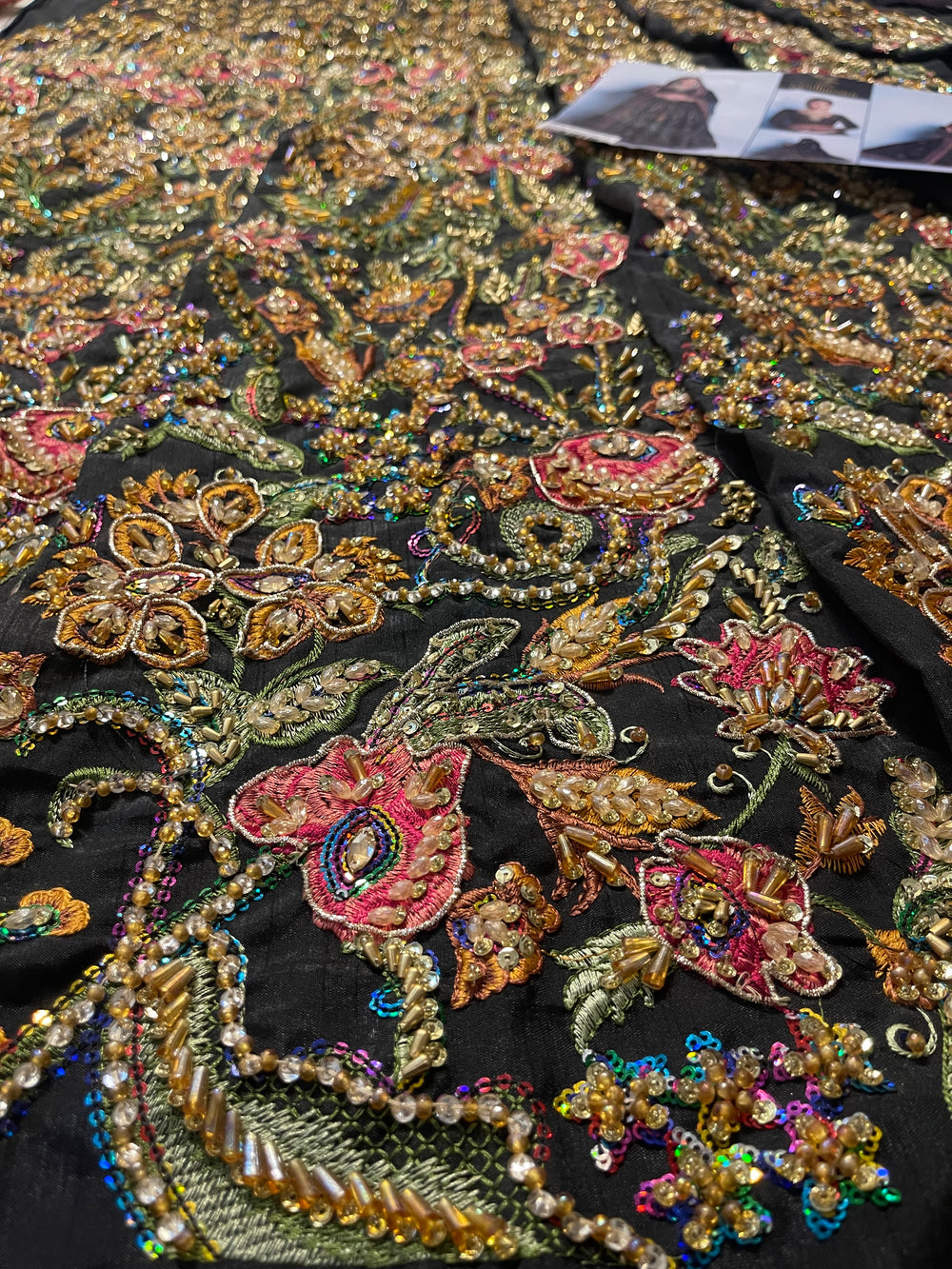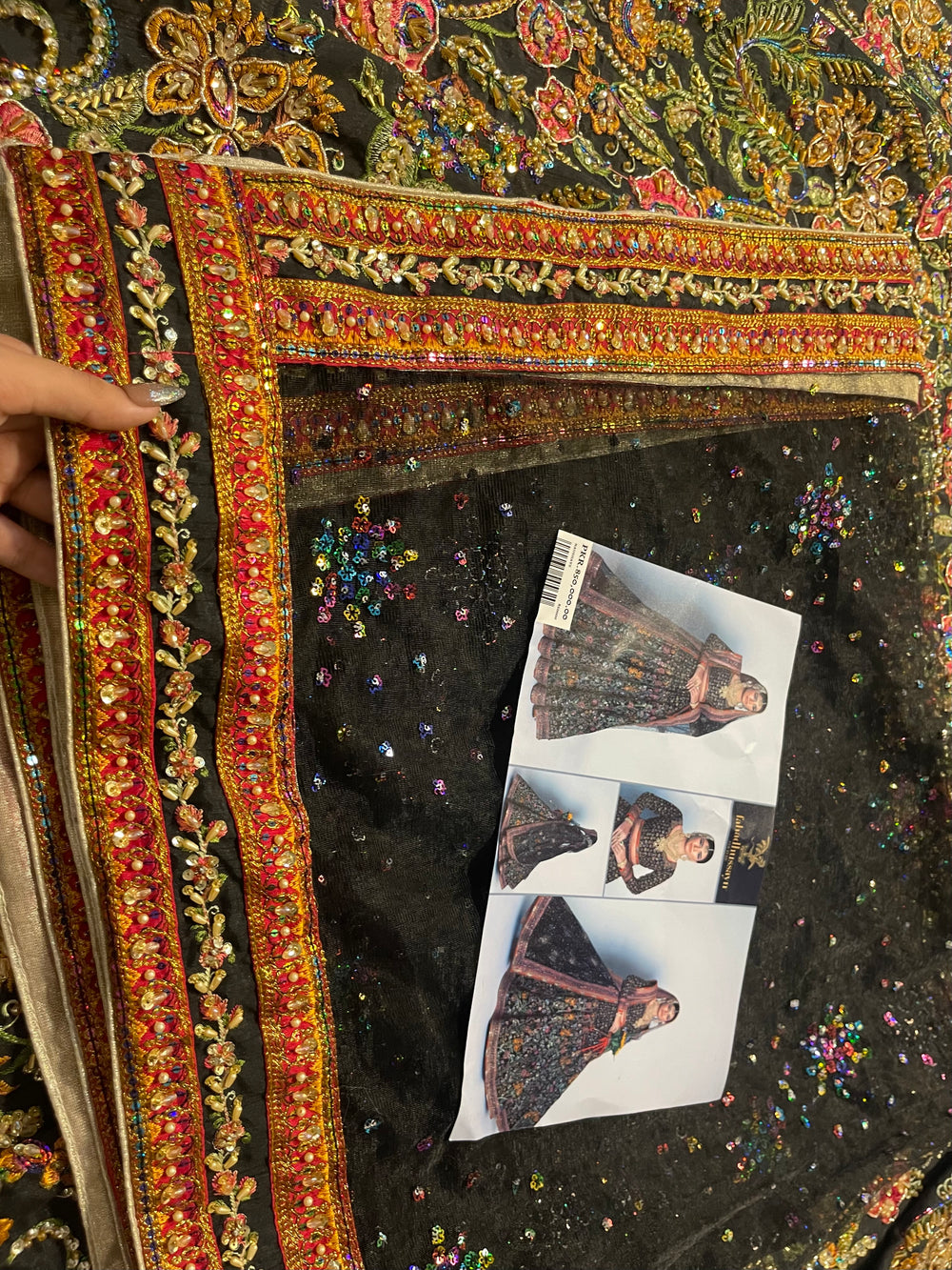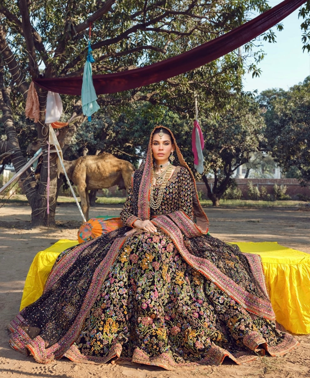 A striking ode to couture artistry, our inspired Naushayz ensemble captures the bold elegance and dramatic charm of the original Fahad Hussayn creation. Designed in a rich, statement black canvas, the outfit is adorned with intricate artisanal embellishments that add depth, vibrancy, and a touch of regal glamour.