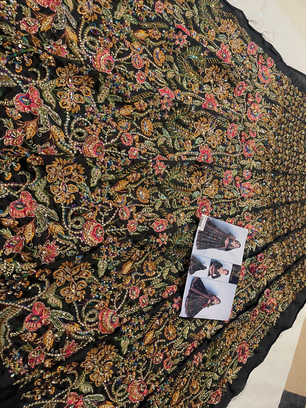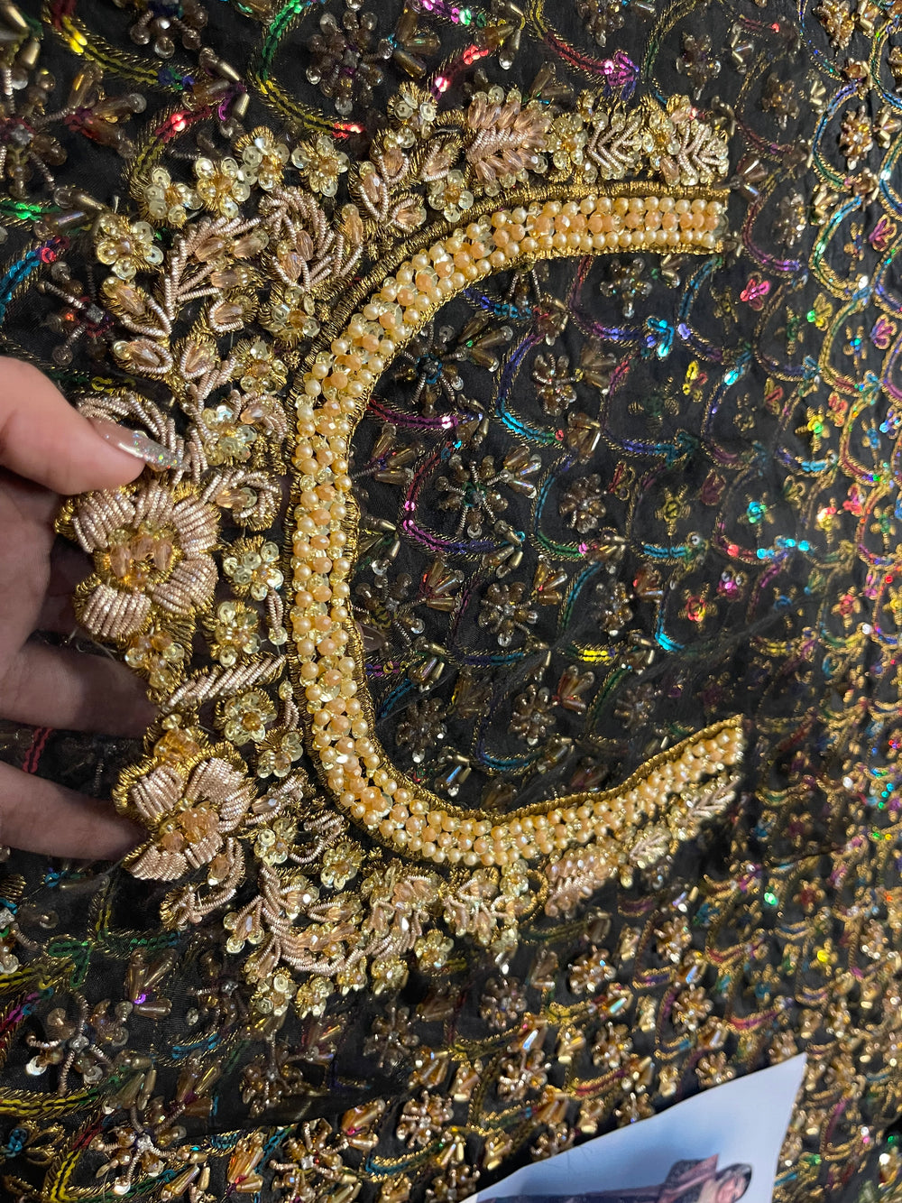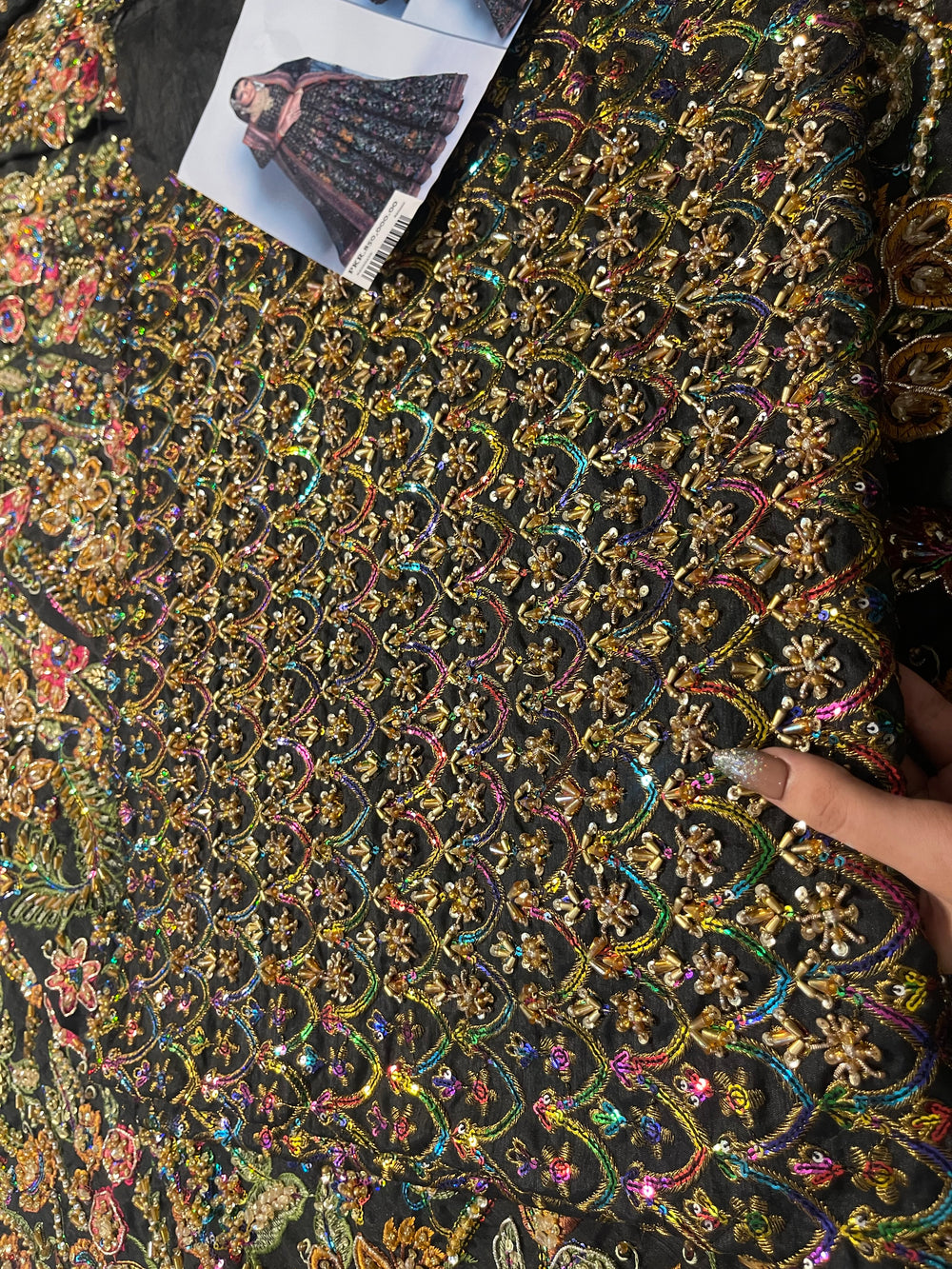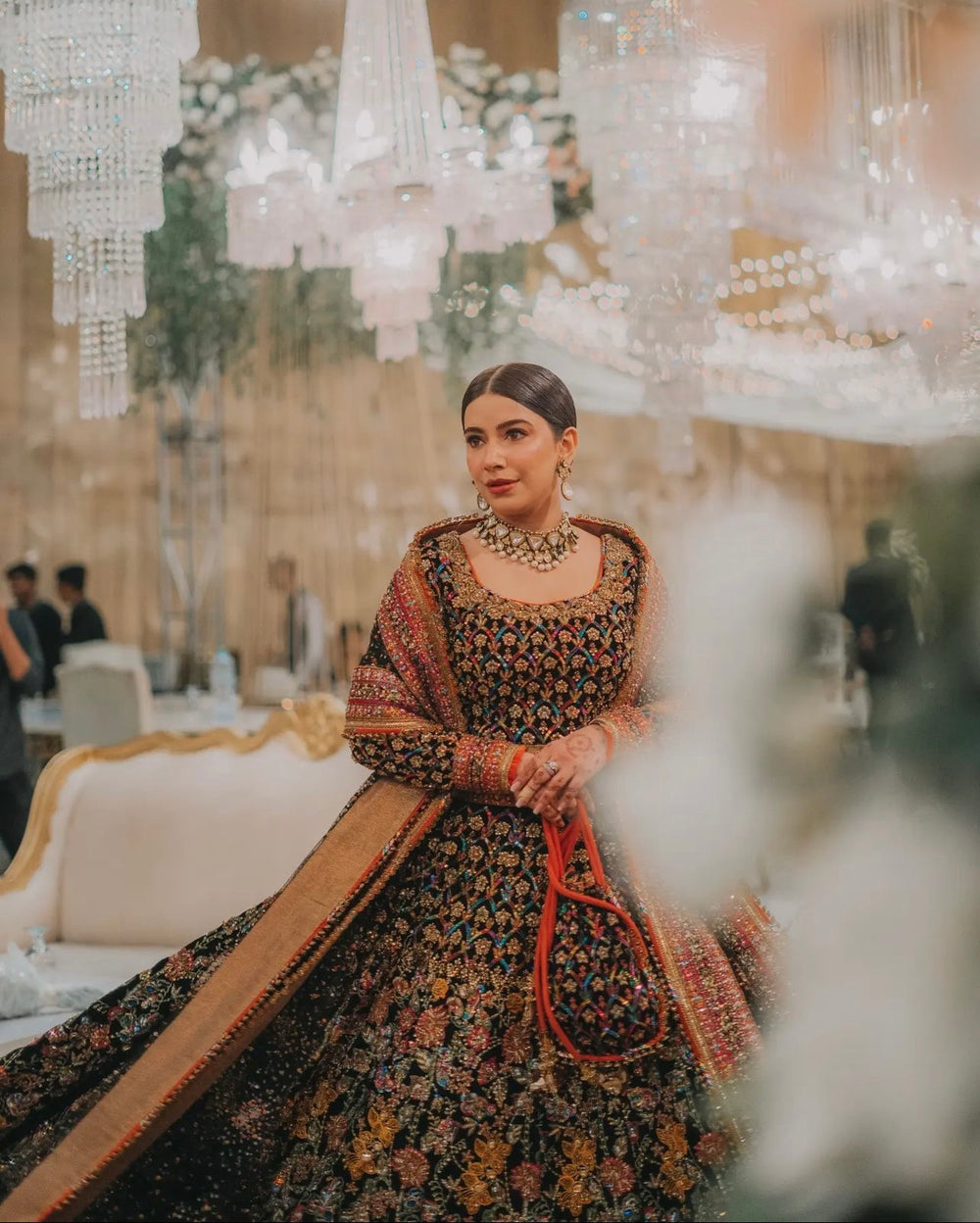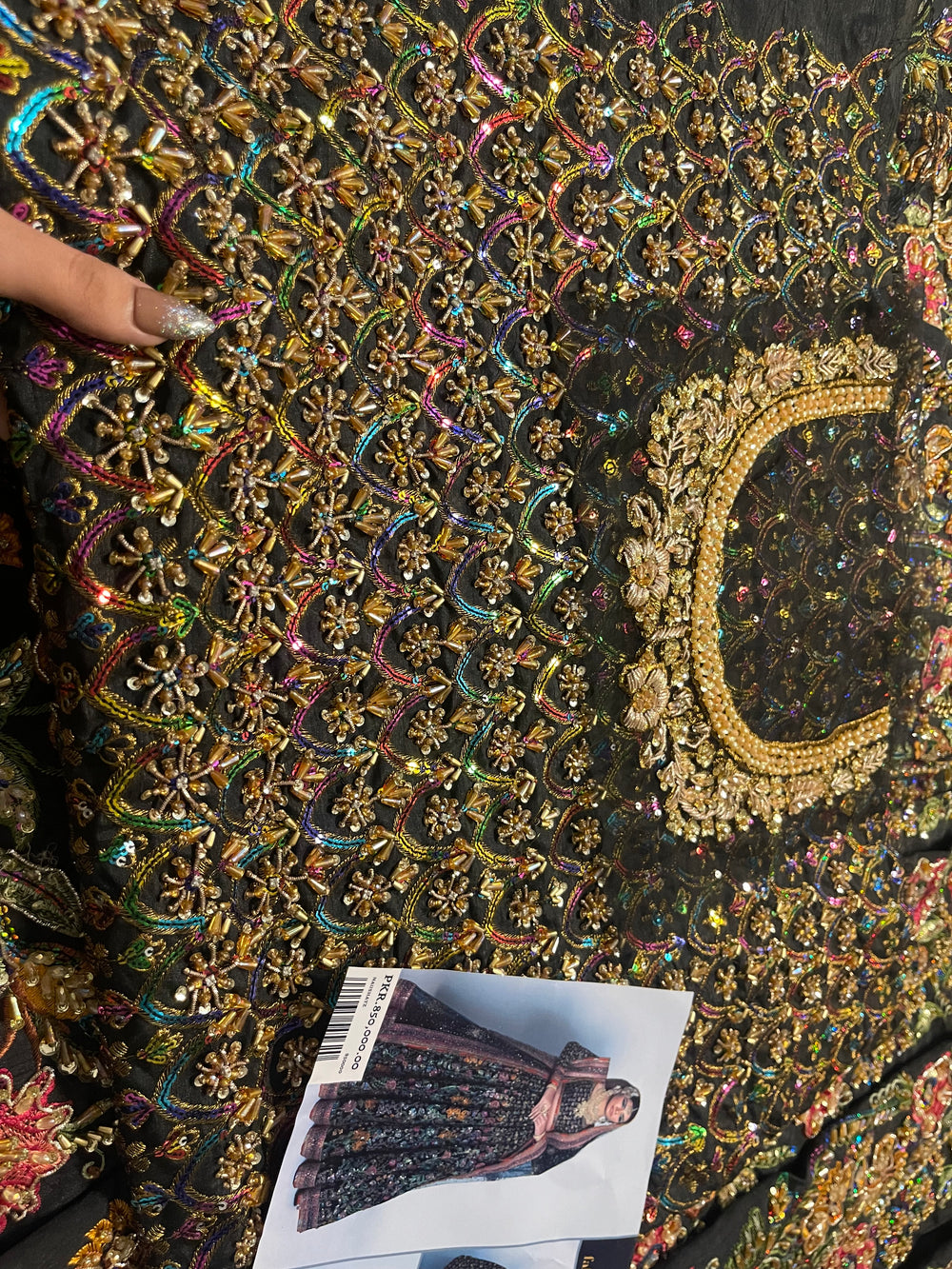 Delicate handcrafted detailing, ornate patterns, and thoughtfully balanced colour accents come together to create a look that’s powerful yet exquisitely feminine. The silhouette falls beautifully, offering both structure and grace—perfect for weddings, evening festivities, and luxe formal events.
