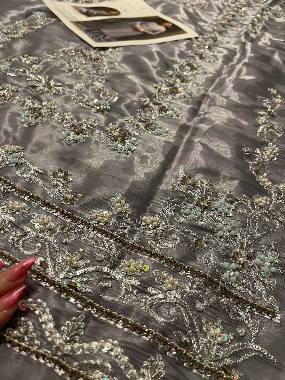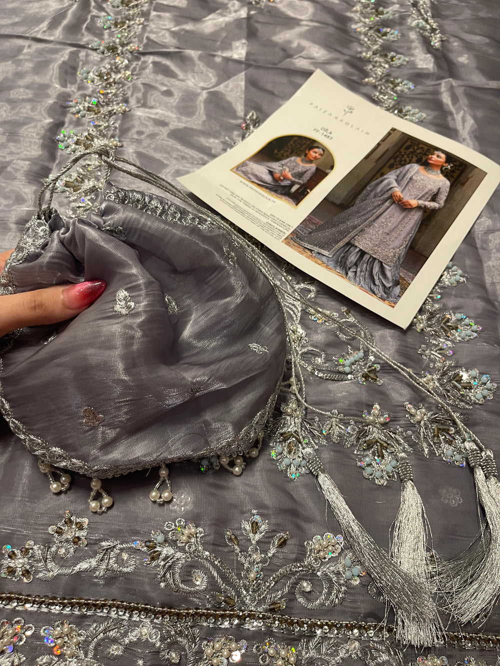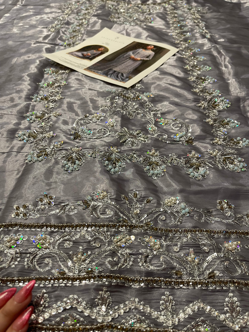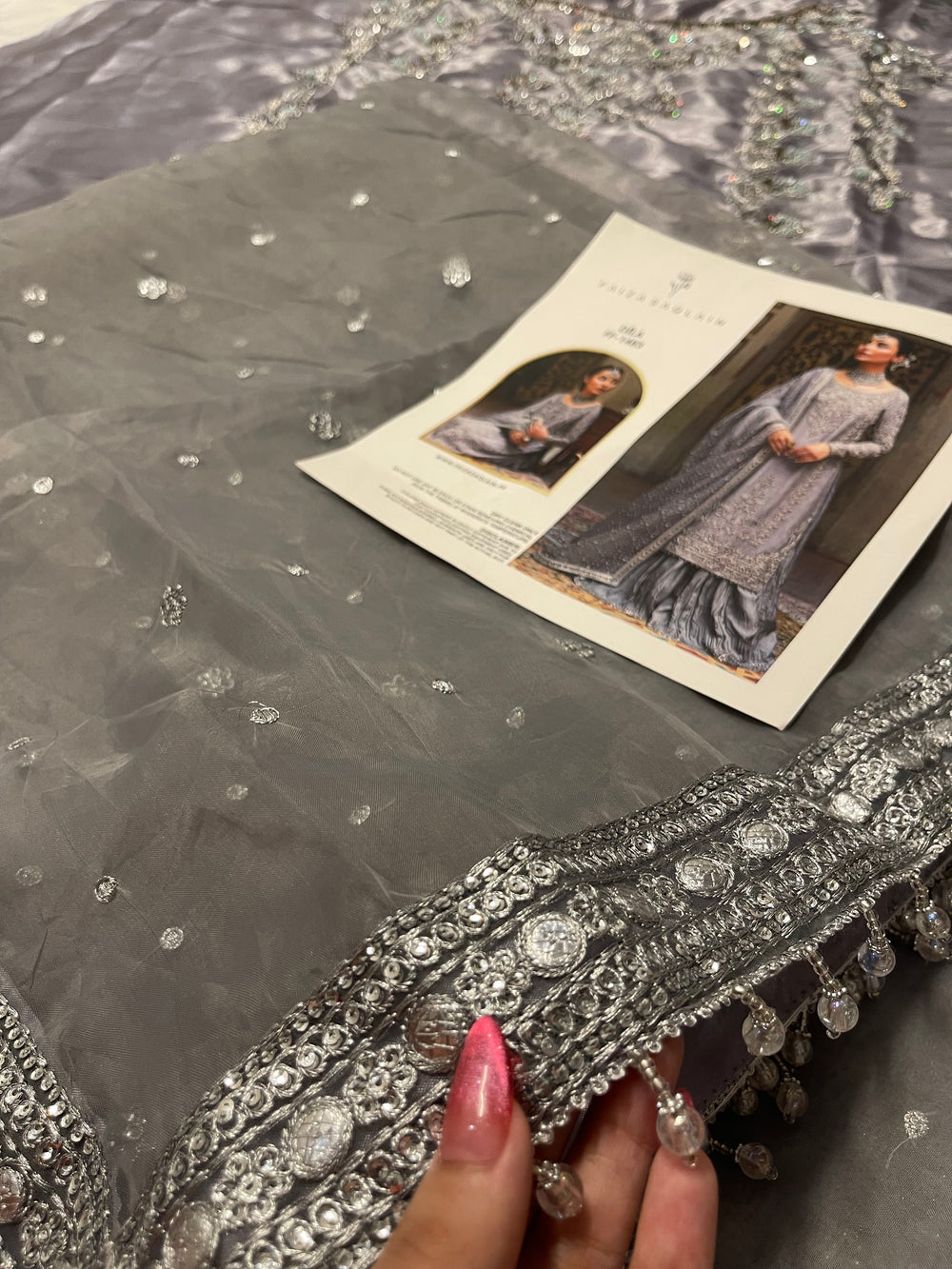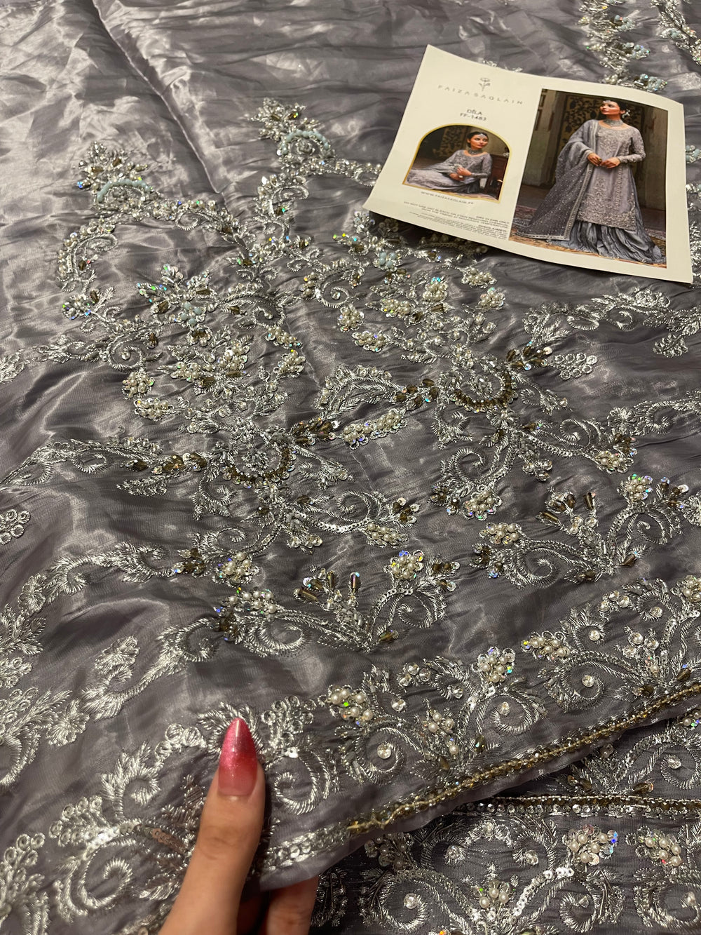 The Dila ensemble by Faiza Saqlain comes in a serene grey tone, adorned with intricate embellishments that enhance its graceful appeal. The delicate dupatta with subtle detailing perfectly complements the outfit, giving it a timeless and refined charm.