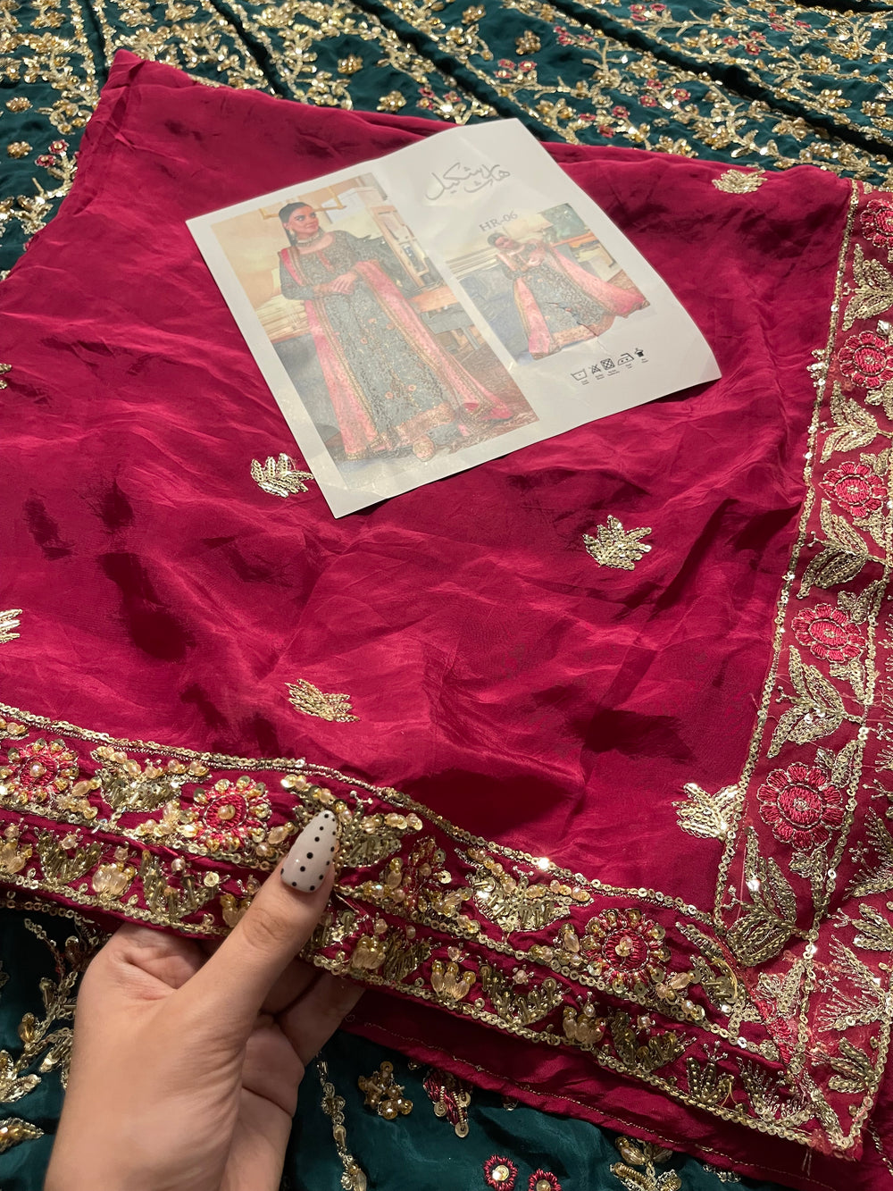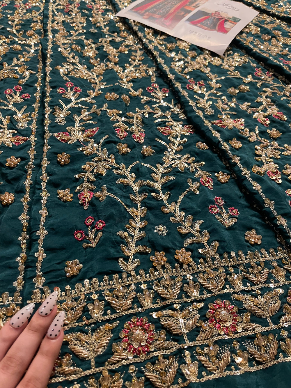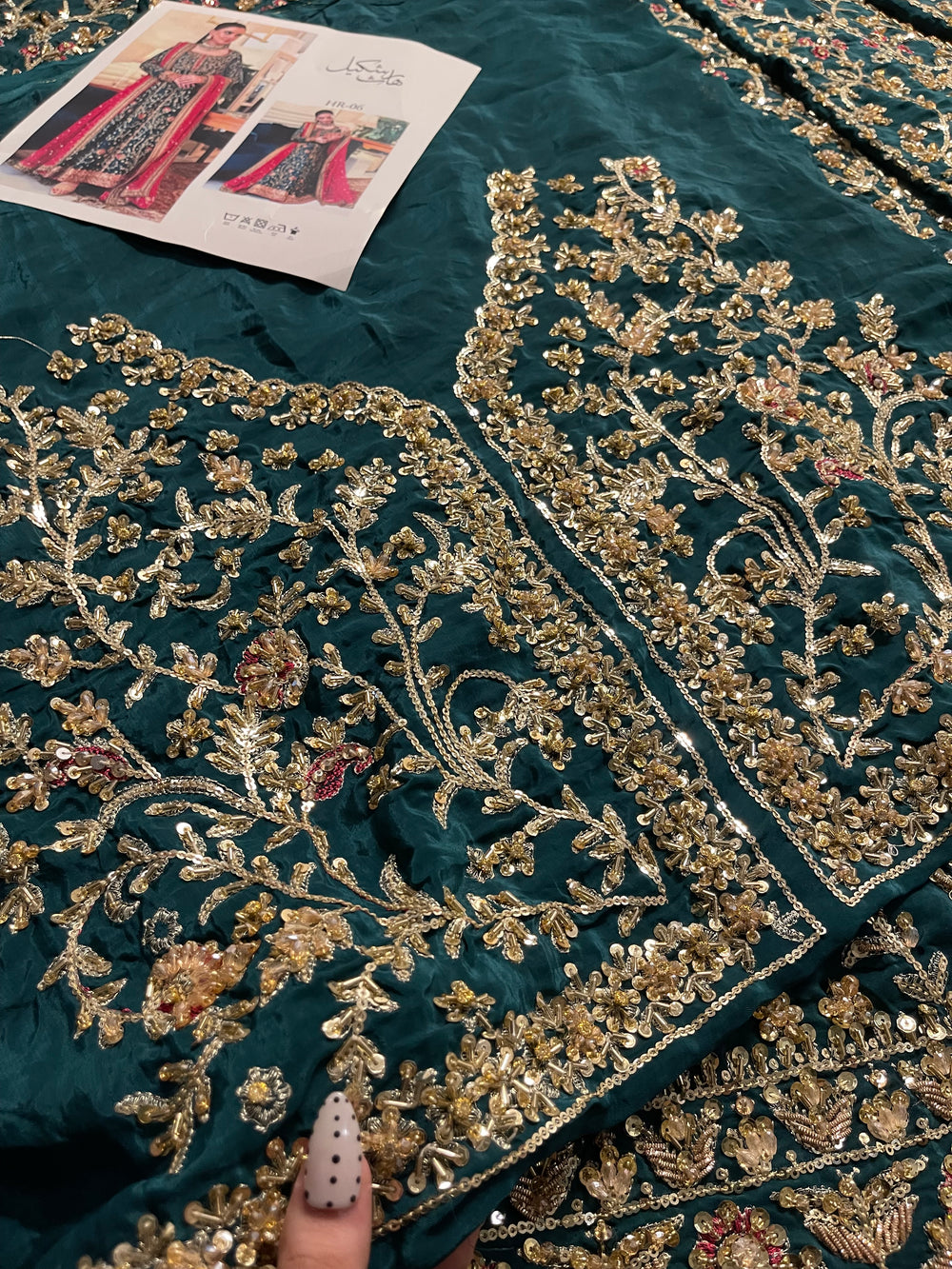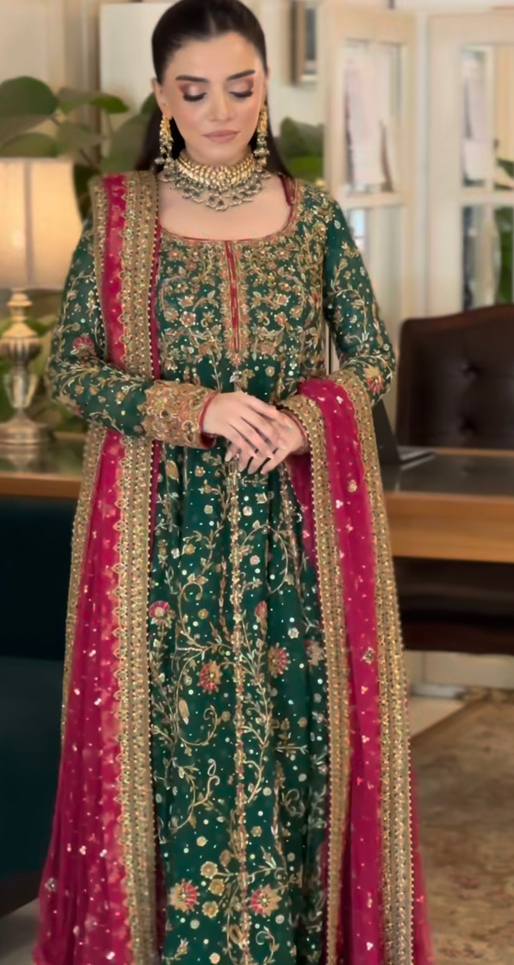 A regal ode to timeless elegance, this inspired Aimen Ensemble features a deep emerald base beautifully adorned with intricate gold and rose-toned embellishments. The look is completed with a contrasting magenta dupatta, delicately bordered and enriched with handwork details — radiating classic Haris Shakeel grandeur. Perfect for festive occasions and wedding soirées, this piece blends traditional craftsmanship with contemporary grace.