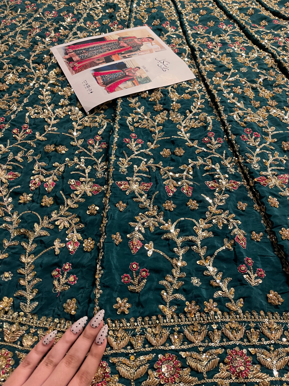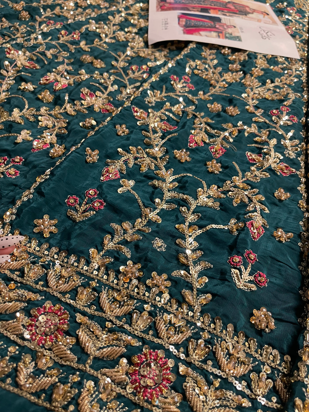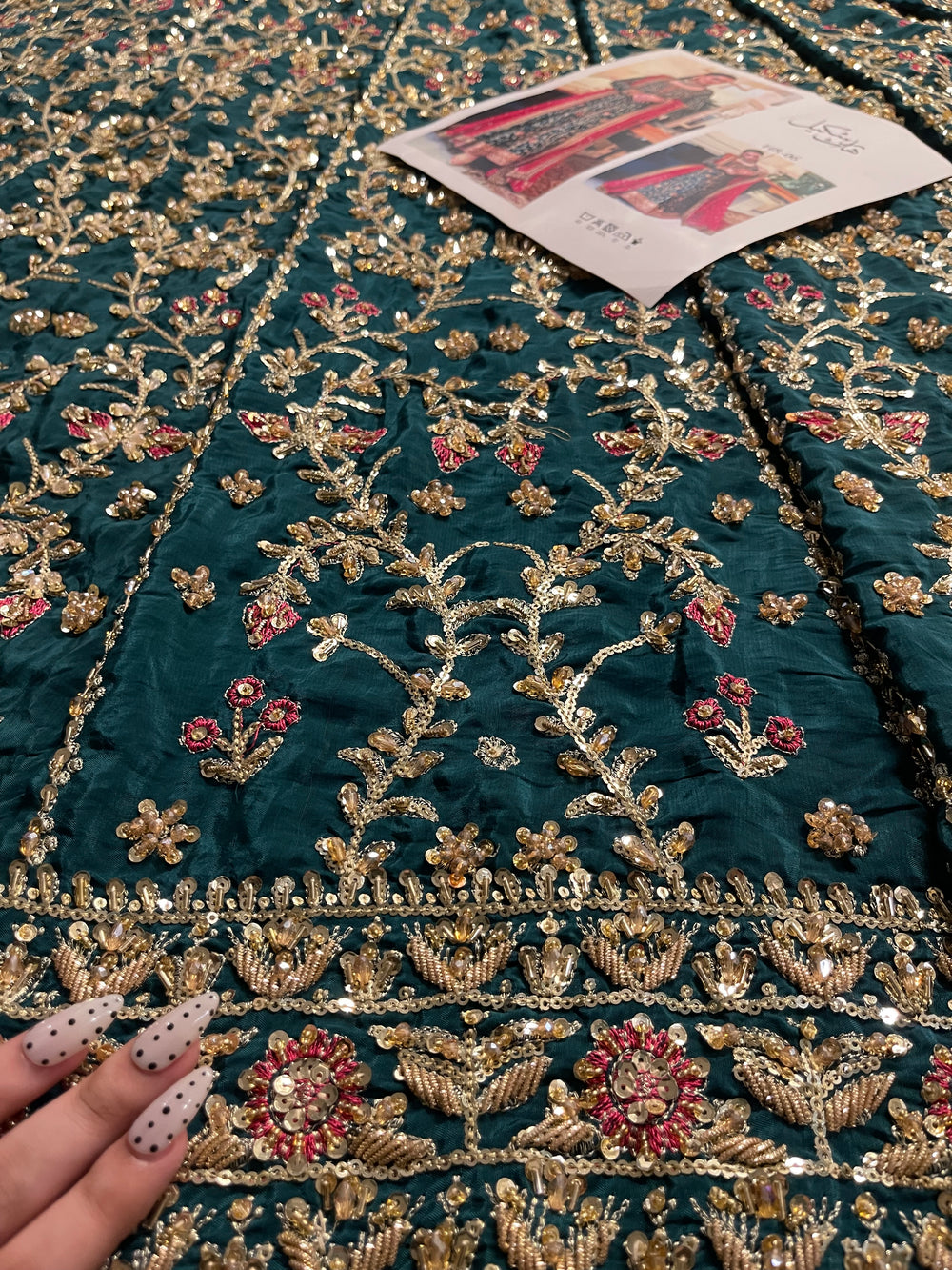 A regal ode to timeless elegance, this inspired Aimen Ensemble features a deep emerald base beautifully adorned with intricate gold and rose-toned embellishments. The look is completed with a contrasting magenta dupatta, delicately bordered and enriched with handwork details — radiating classic Haris Shakeel grandeur. Perfect for festive occasions and wedding soirées, this piece blends traditional craftsmanship with contemporary grace.