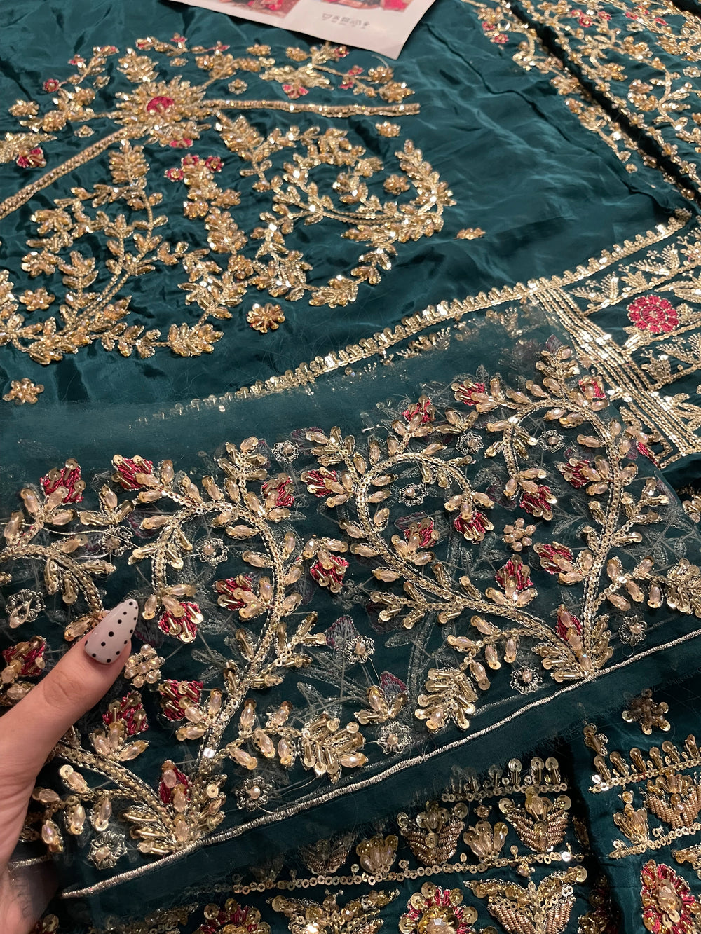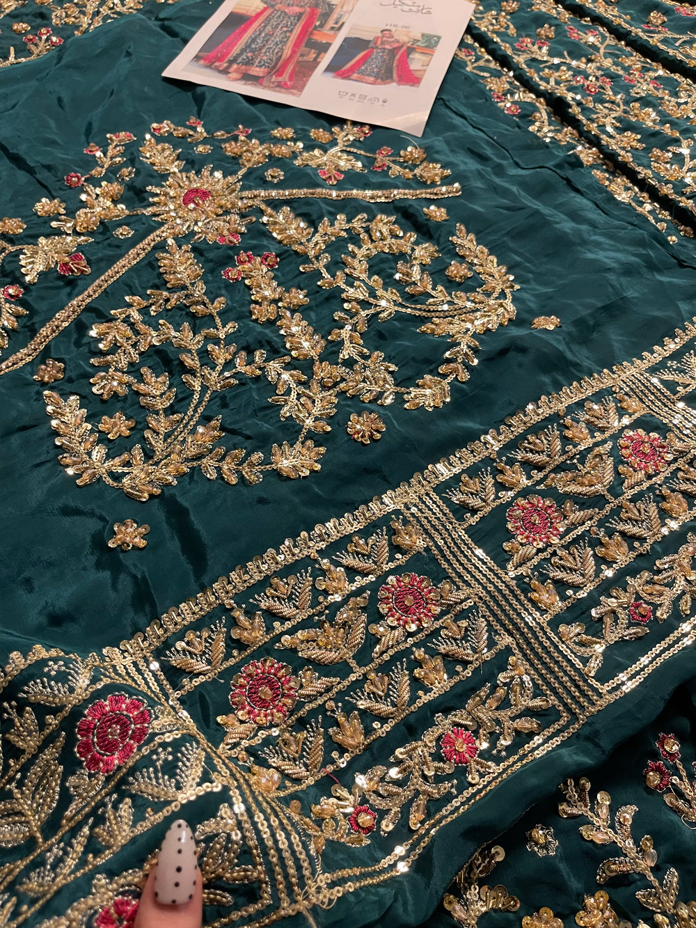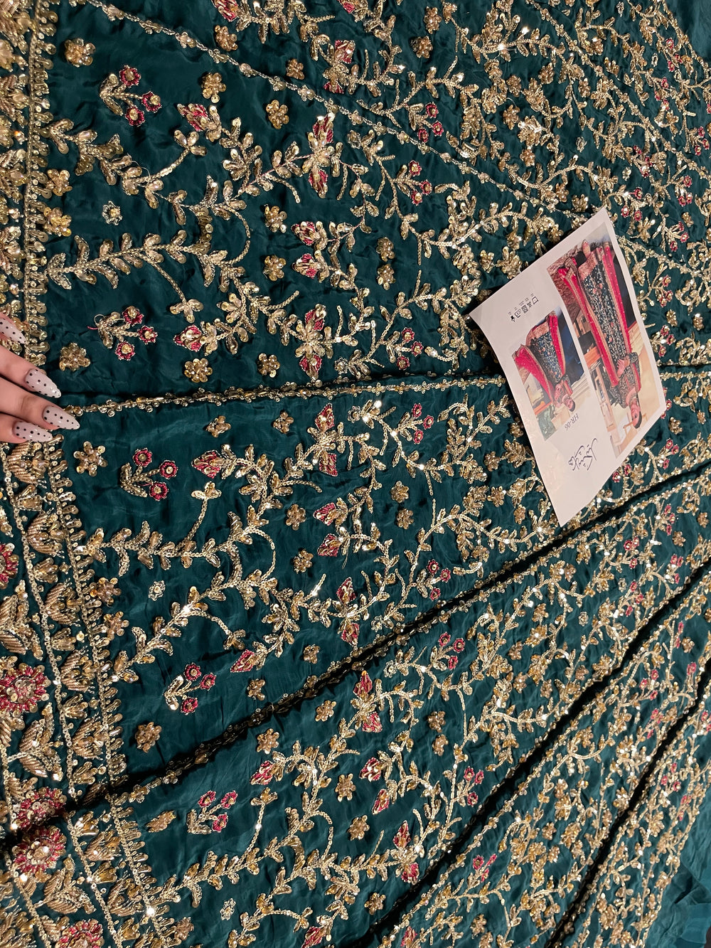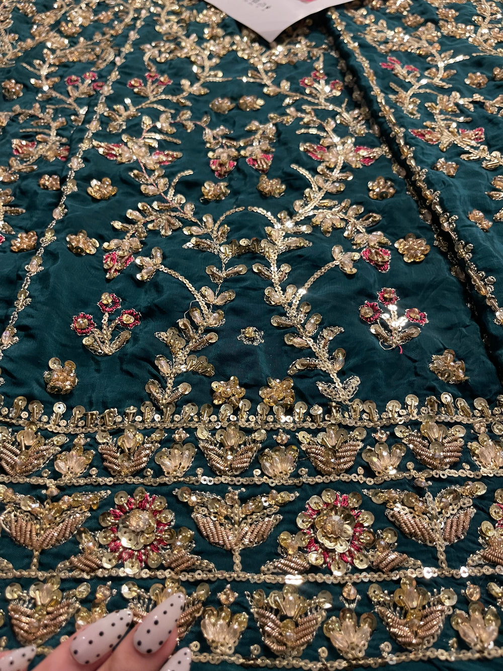 A regal ode to timeless elegance, this inspired Aimen Ensemble features a deep emerald base beautifully adorned with intricate gold and rose-toned embellishments. The look is completed with a contrasting magenta dupatta, delicately bordered and enriched with handwork details — radiating classic Haris Shakeel grandeur. Perfect for festive occasions and wedding soirées, this piece blends traditional craftsmanship with contemporary grace.