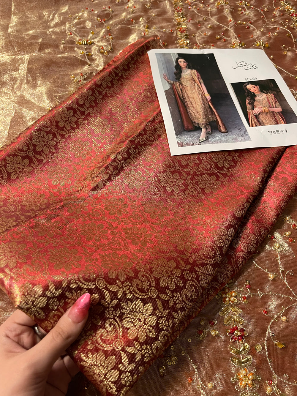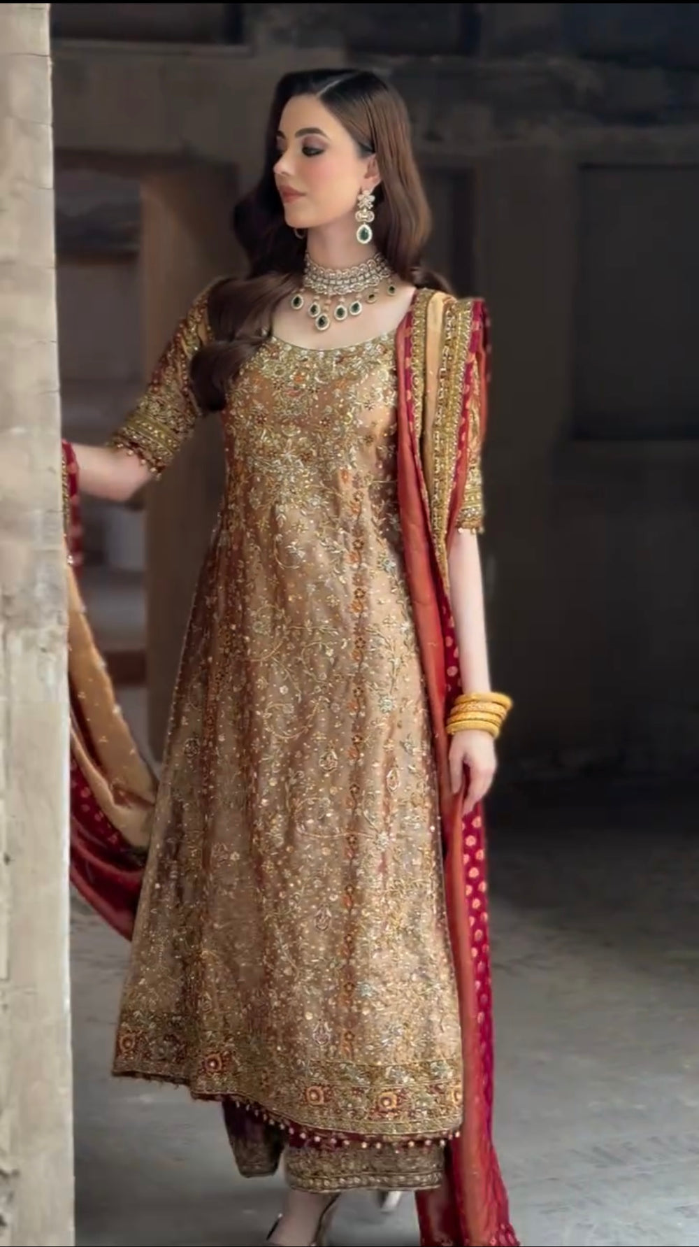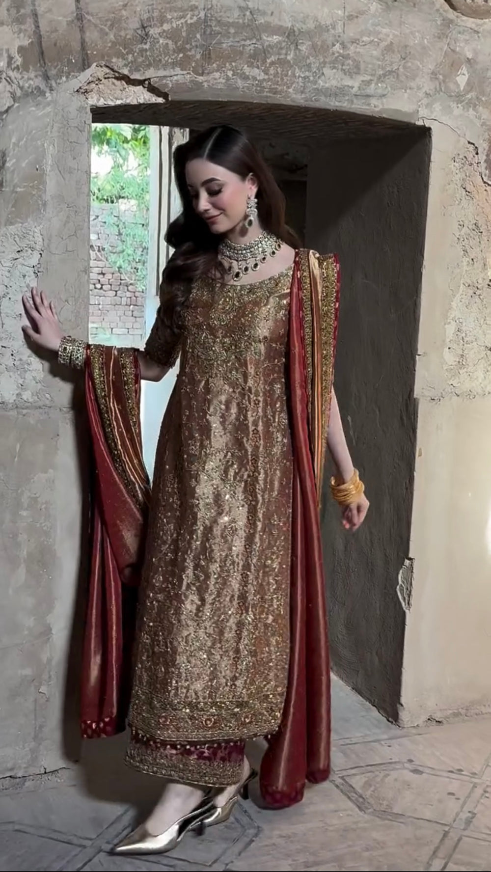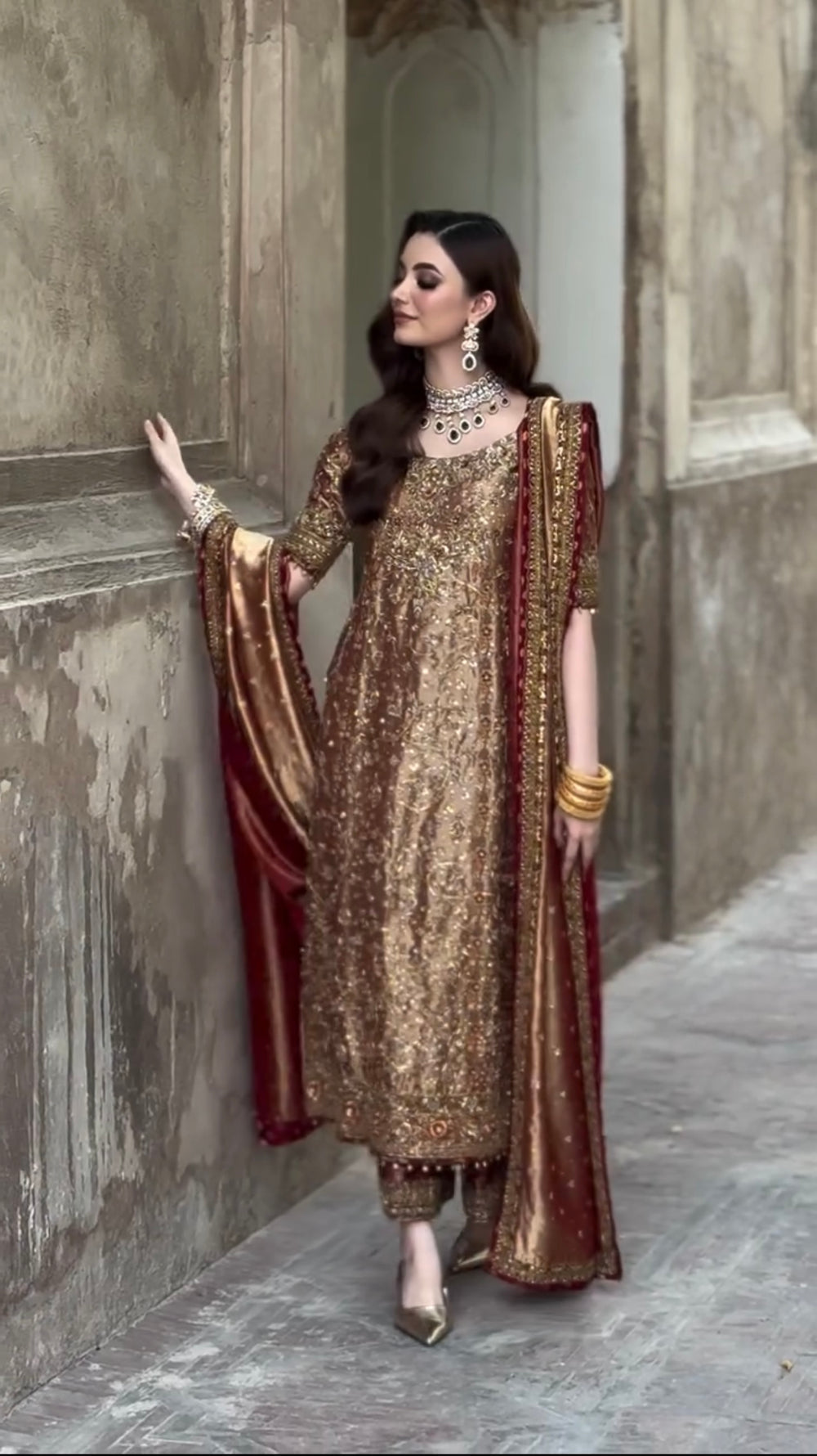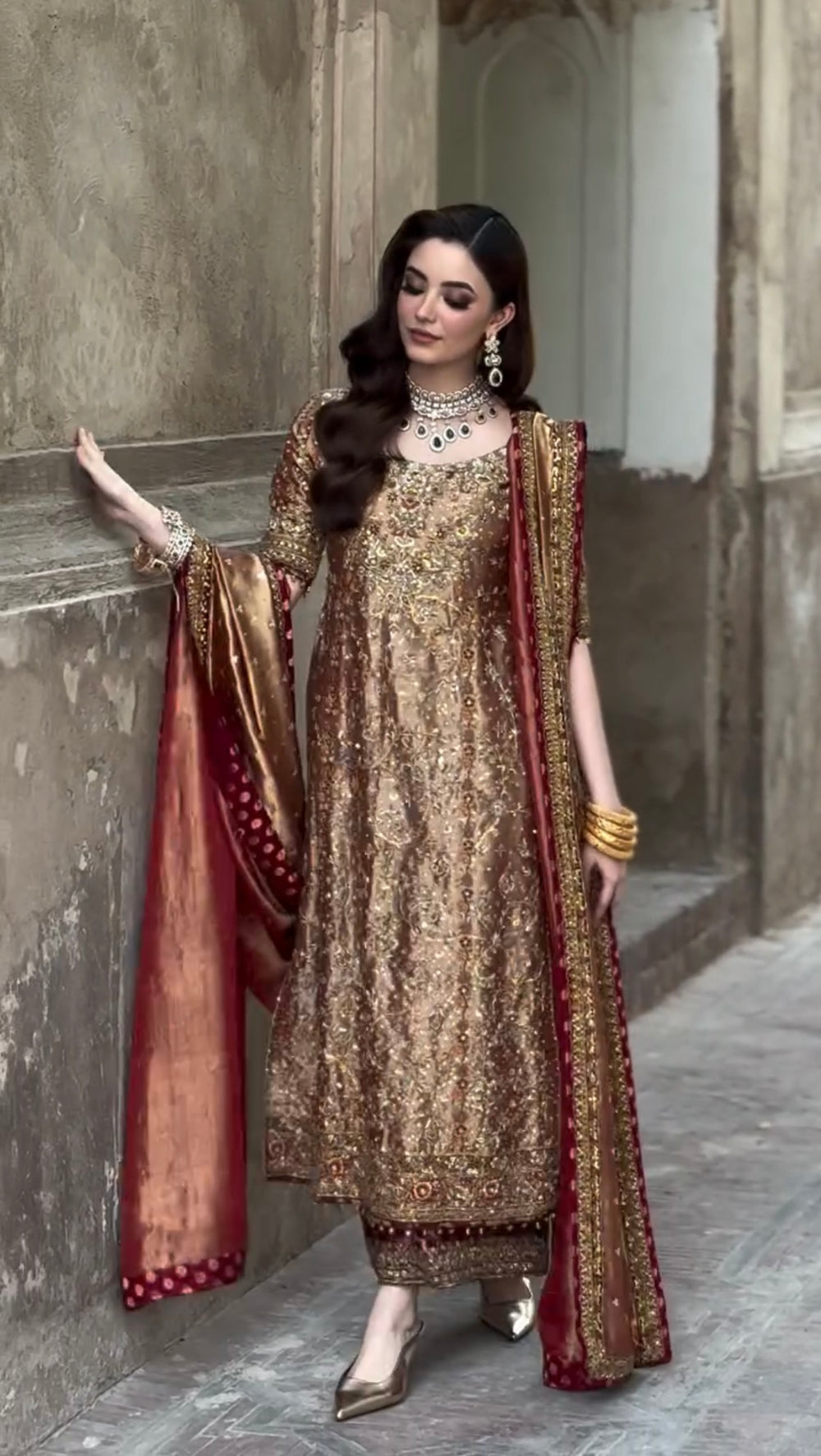 Our Meerub Ensemble, inspired by Haris Shakeel, radiates timeless elegance with its rich craftsmanship and regal charm. Intricately adorned with delicate embellishments and refined threadwork, this piece captures the essence of traditional luxury. The warm golden tones and contrasting dupatta create a perfect harmony of grace and grandeur, making it ideal for festive and wedding occasions. A beautifully inspired creation that celebrates heritage artistry and contemporary sophistication.