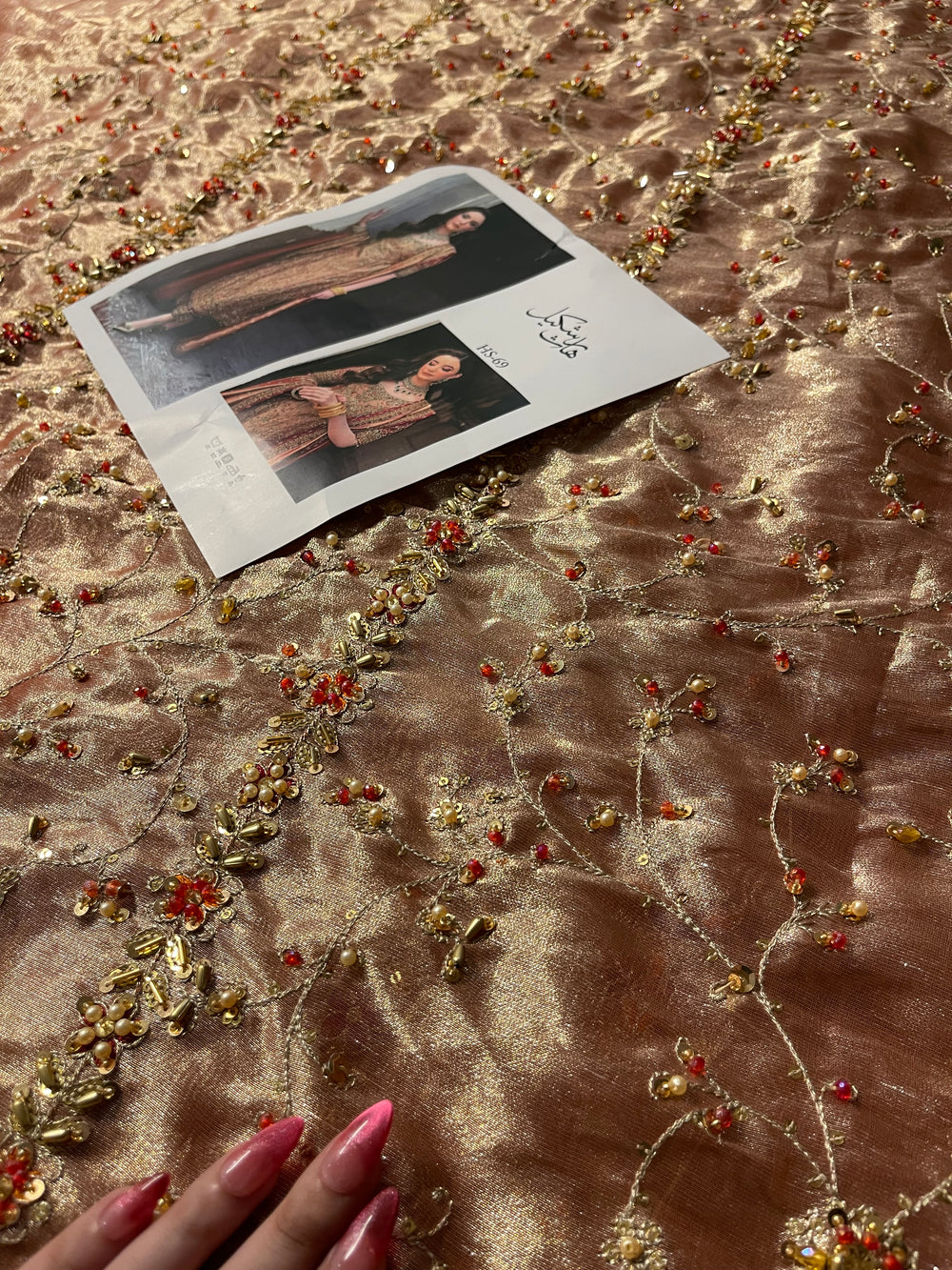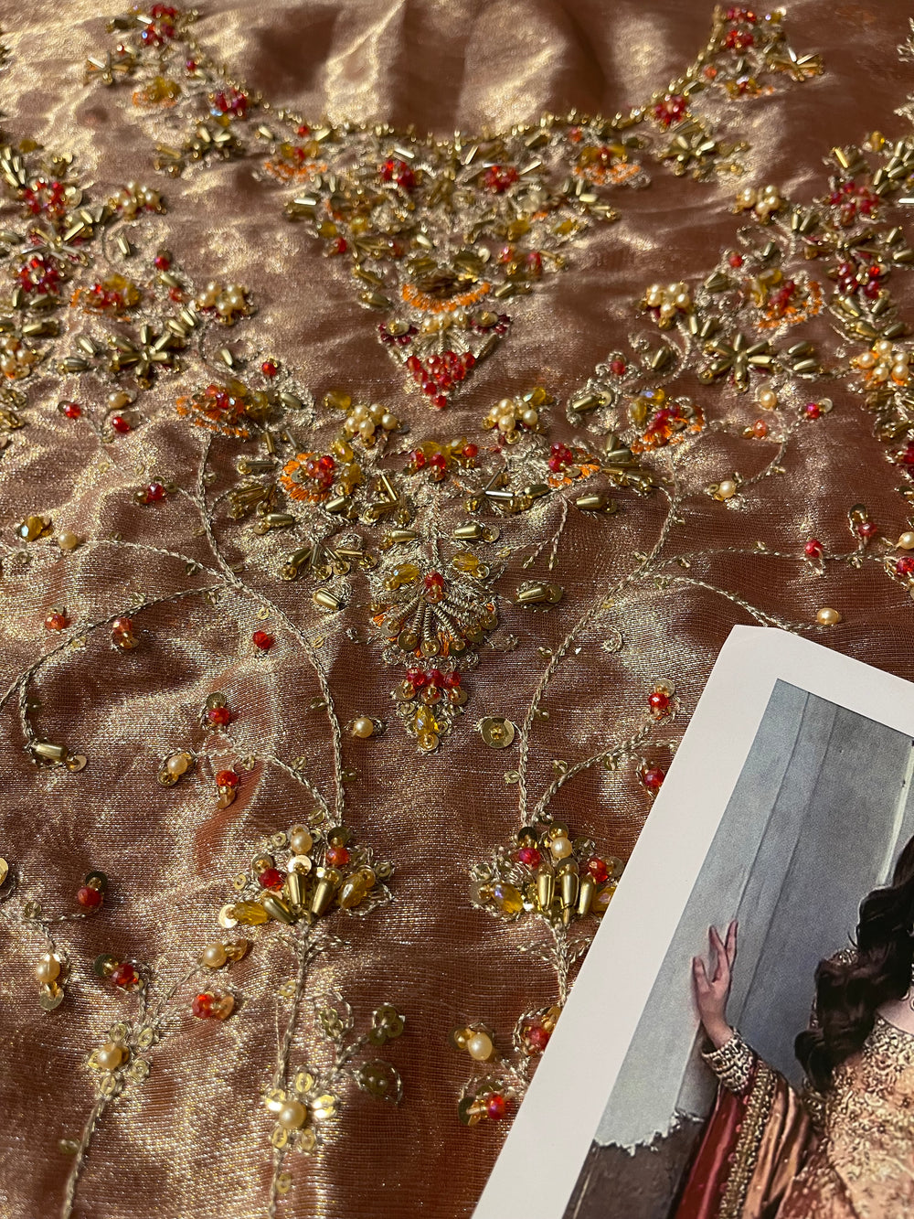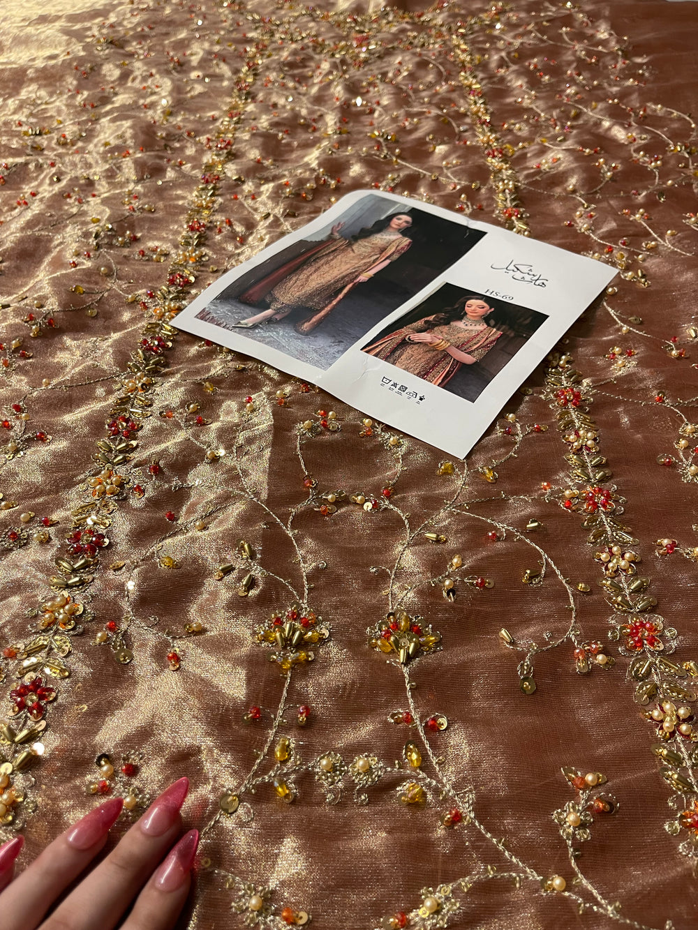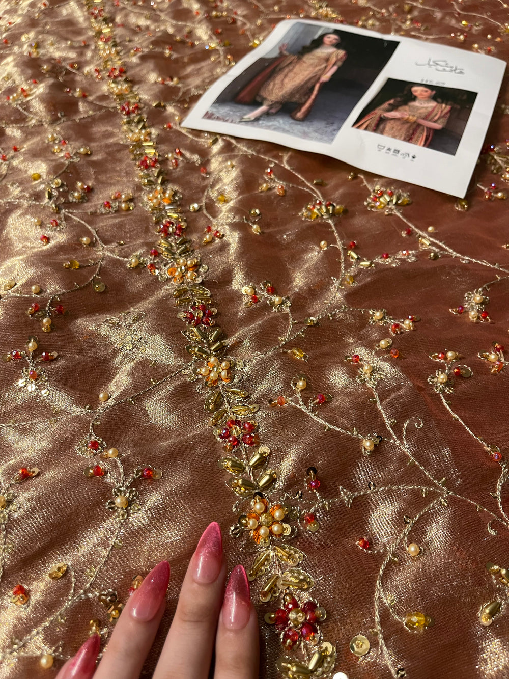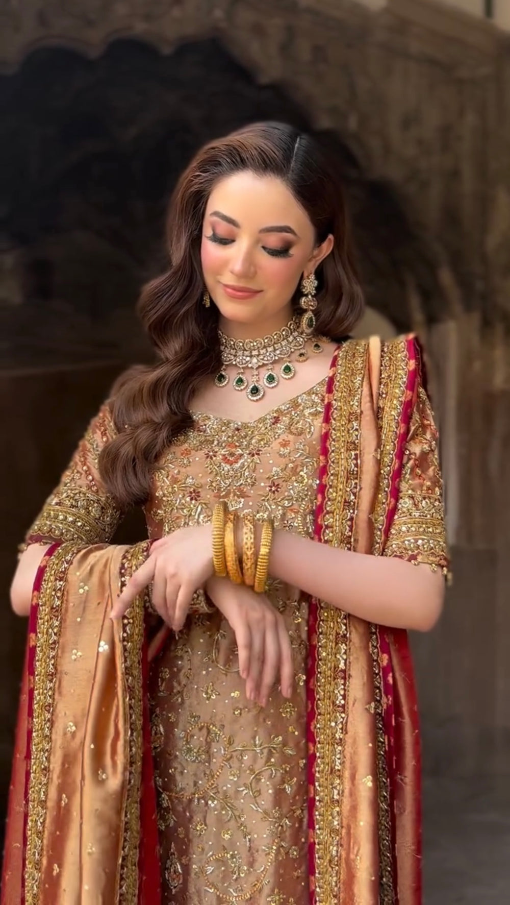 Our Meerub Ensemble, inspired by Haris Shakeel, radiates timeless elegance with its rich craftsmanship and regal charm. Intricately adorned with delicate embellishments and refined threadwork, this piece captures the essence of traditional luxury. The warm golden tones and contrasting dupatta create a perfect harmony of grace and grandeur, making it ideal for festive and wedding occasions. A beautifully inspired creation that celebrates heritage artistry and contemporary sophistication.