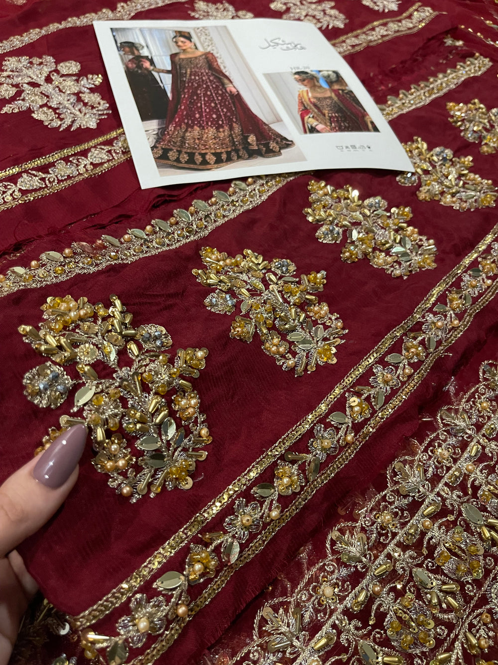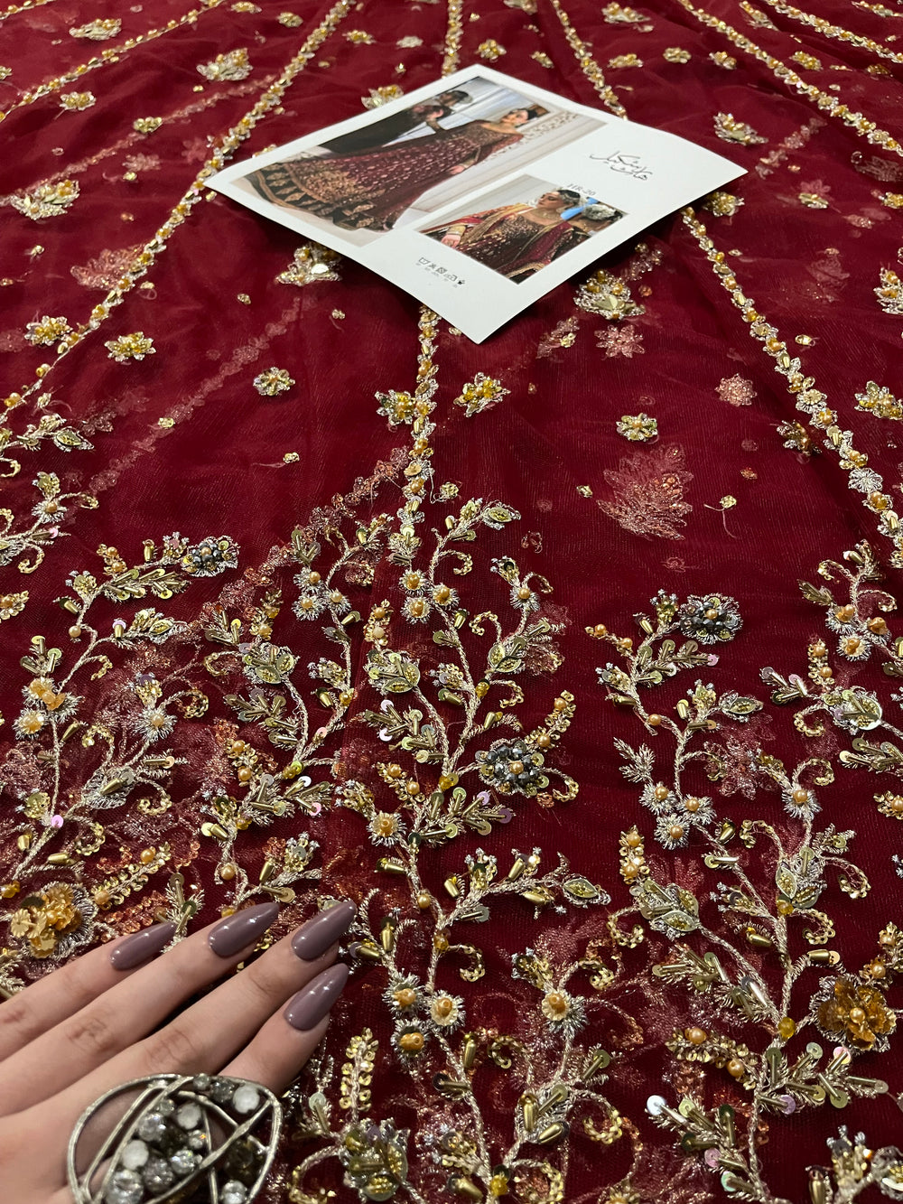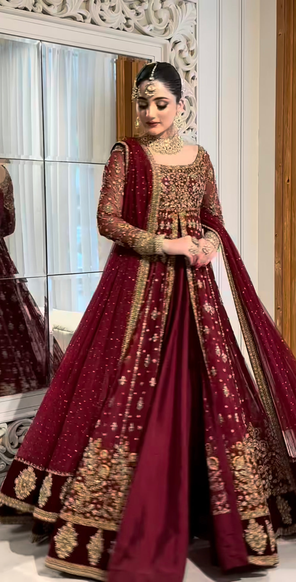 Step into timeless elegance with our luxurious maroon bridal ensemble, inspired by the iconic Shifa outfit by Haris Shakeel. This masterpiece features a richly detailed silhouette that flows with effortless grace, bringing together traditional charm and modern refinement. The deep maroon tone creates an opulent canvas, beautifully enhanced with intricate gold accents, delicate motifs, and a regal flare that adds volume without overwhelming the frame.