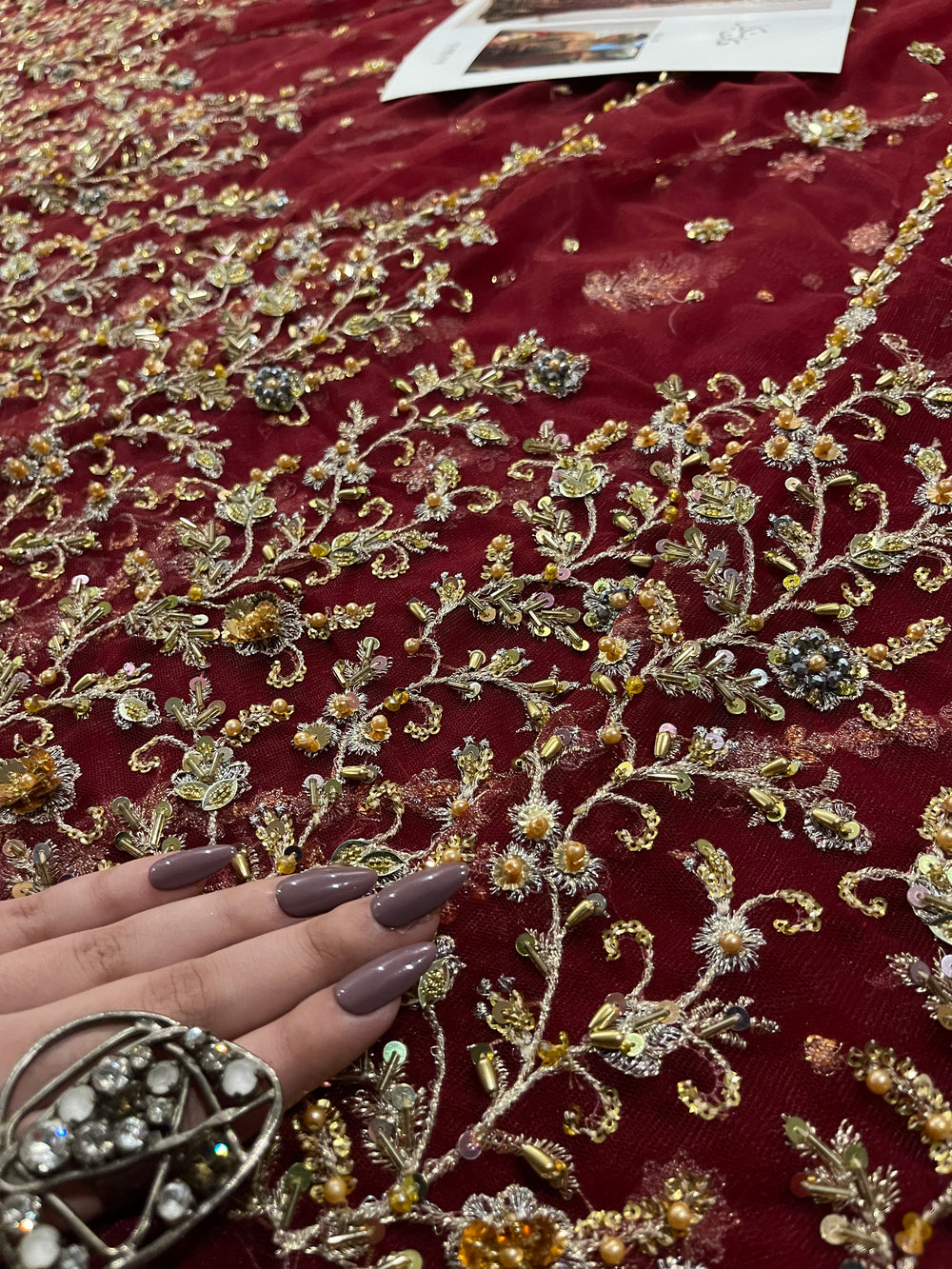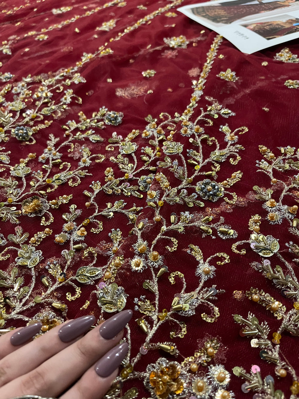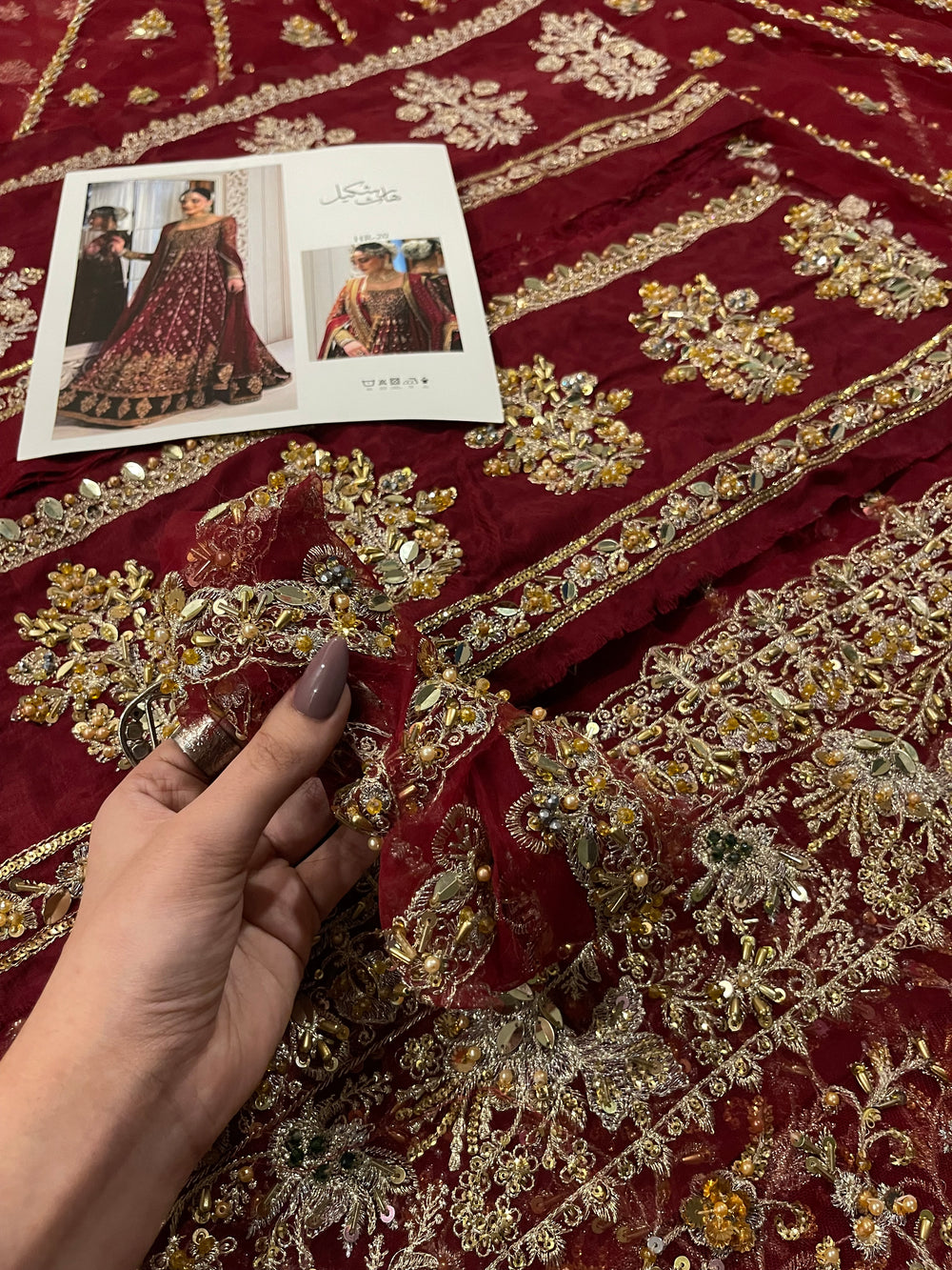 Step into timeless elegance with our luxurious maroon bridal ensemble, inspired by the iconic Shifa outfit by Haris Shakeel. This masterpiece features a richly detailed silhouette that flows with effortless grace, bringing together traditional charm and modern refinement. The deep maroon tone creates an opulent canvas, beautifully enhanced with intricate gold accents, delicate motifs, and a regal flare that adds volume without overwhelming the frame.