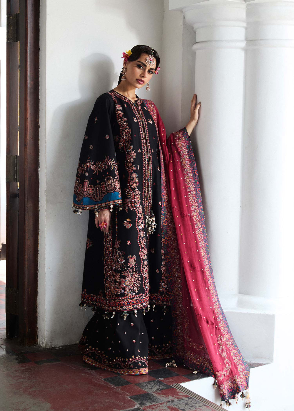 Embrace the elegance of summer season with this Black with intricate floral embroidery adorns the outfit, creating a timeless and elegant look with black trousers with an embroidered border adds a touch of sophistication. A beautifully embroidered chiffon dupatta in red with the same pattern as the outfit adds a romantic touch. The lightweight, breathable fabric and elegant design make this outfit perfect for summer evenings.