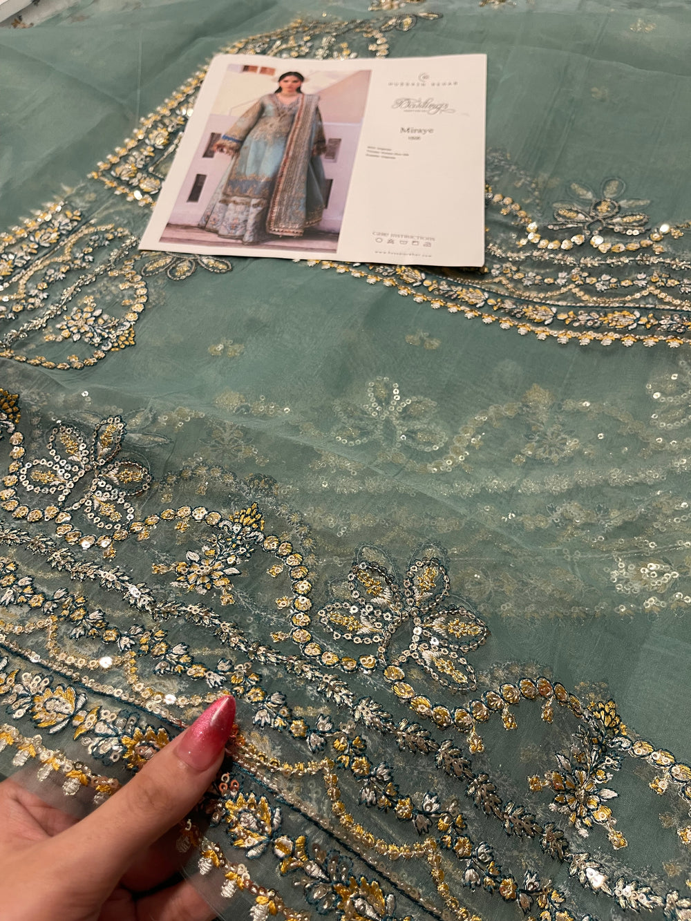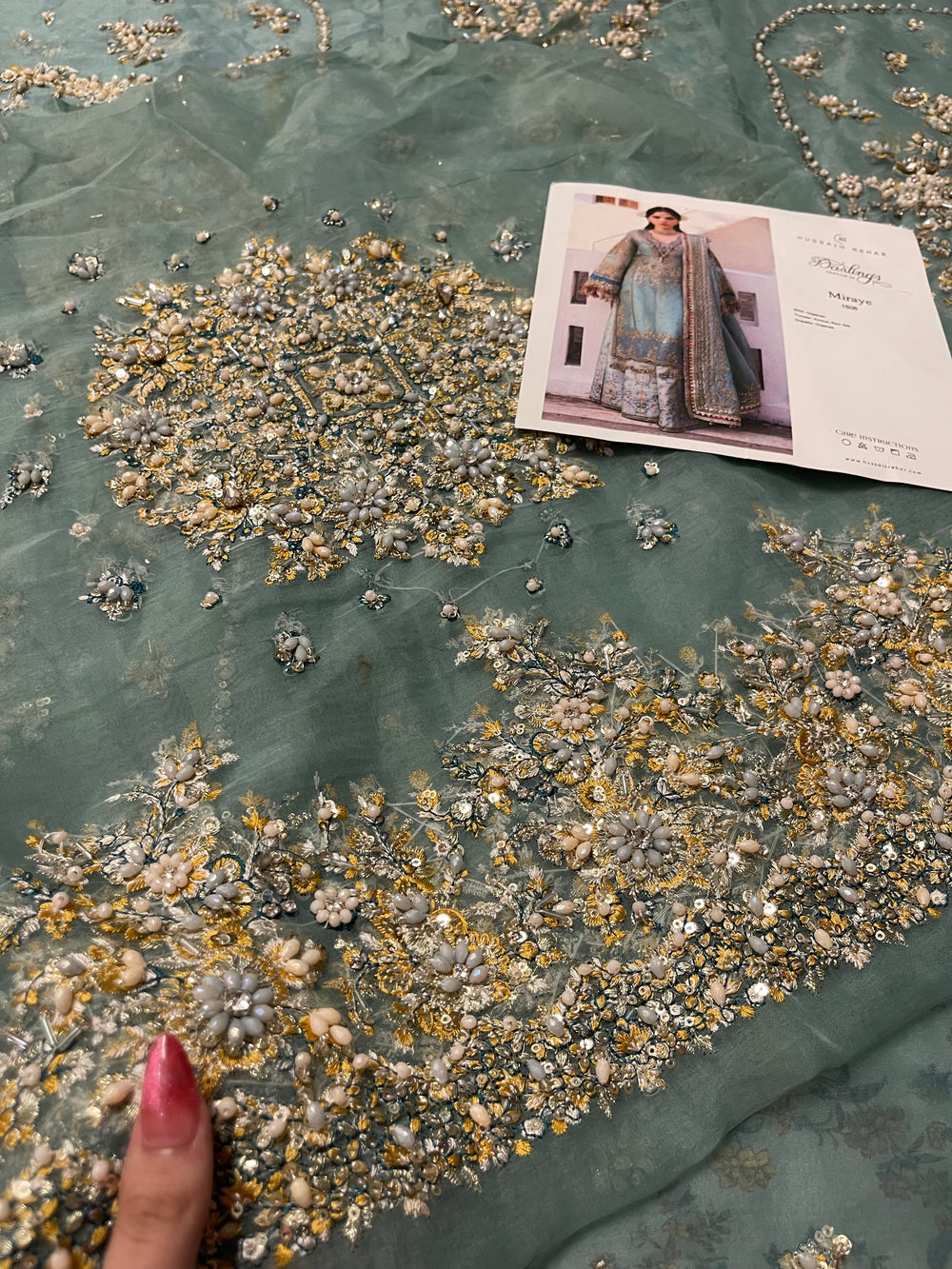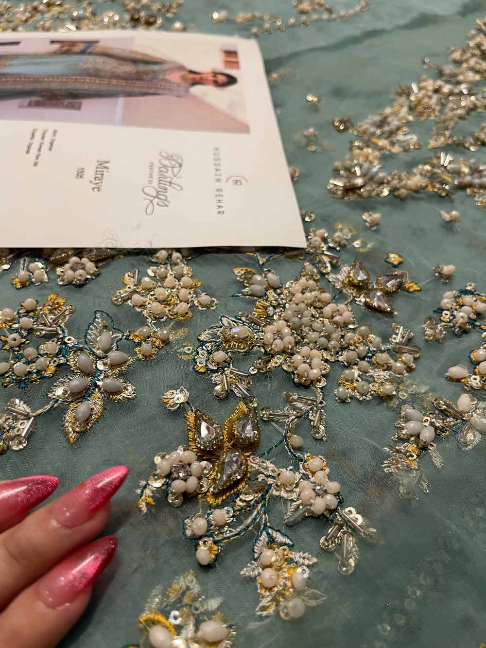 “Miraye” by Hussain Rehar is a statement ensemble that reflects timeless artistry with its fluid silhouette, intricate embellishments, and graceful detailing. The outfit carries a delicate charm with ornate work scattered across the fabric, while its flowing dupatta and finely worked borders add depth and regality. Subtle hints of contrast bring a refined balance, making it a perfect blend of elegance and grandeur.