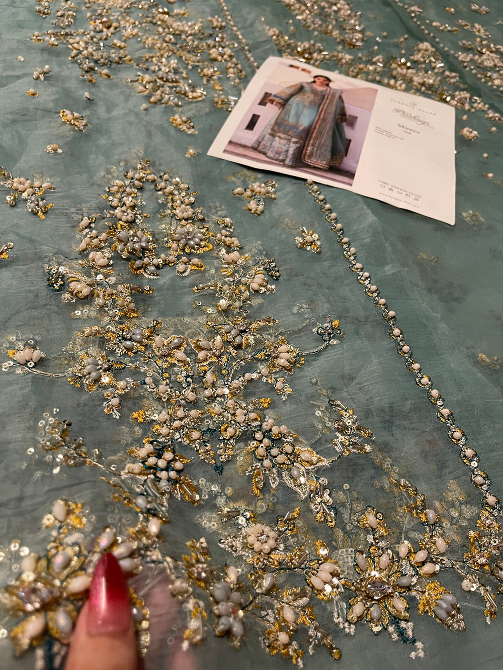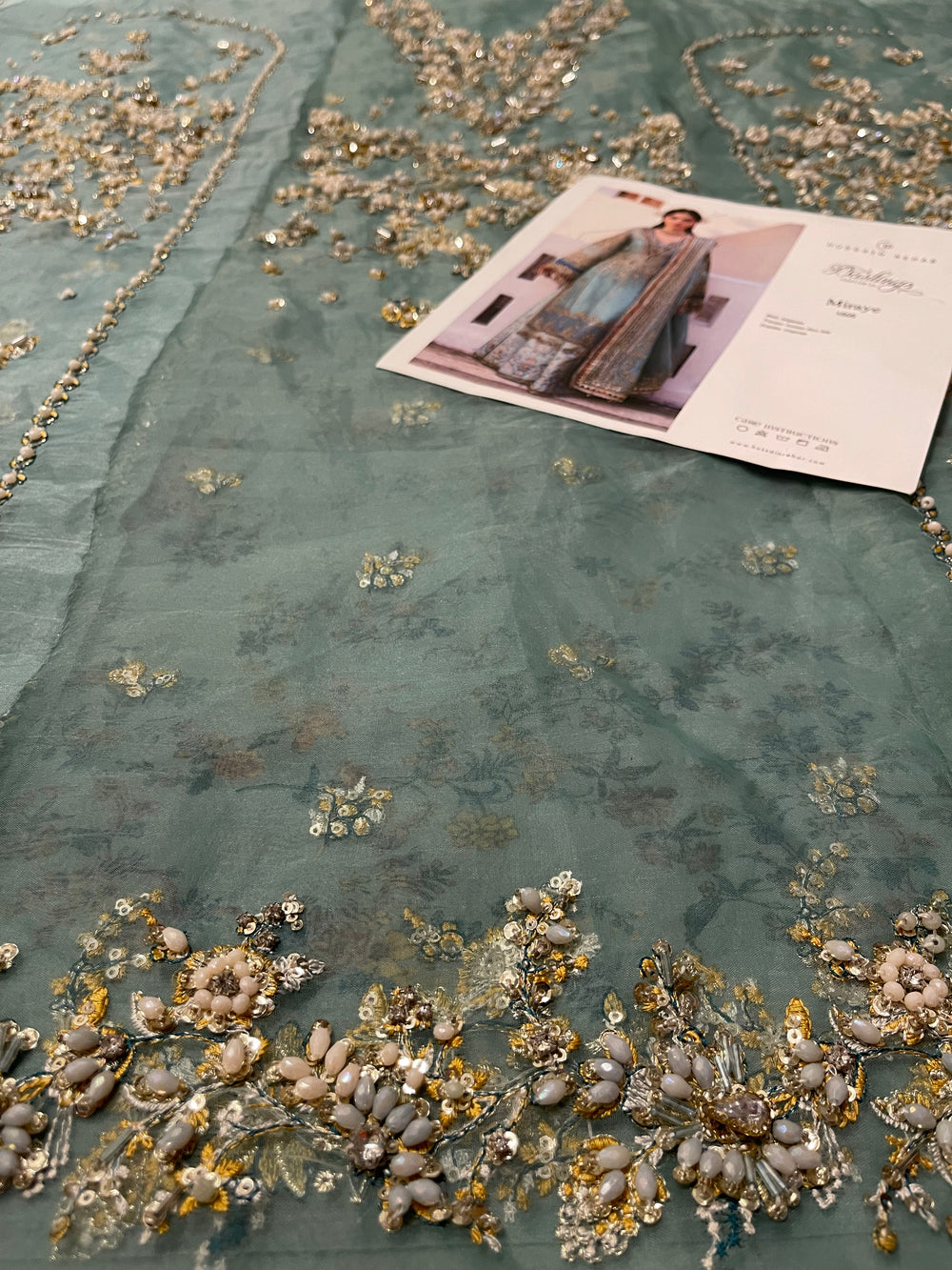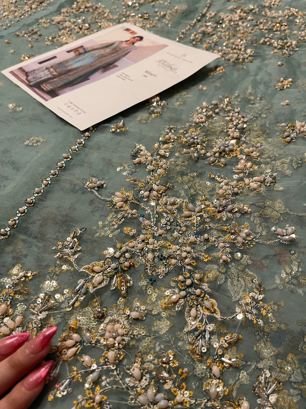 “Miraye” by Hussain Rehar is a statement ensemble that reflects timeless artistry with its fluid silhouette, intricate embellishments, and graceful detailing. The outfit carries a delicate charm with ornate work scattered across the fabric, while its flowing dupatta and finely worked borders add depth and regality. Subtle hints of contrast bring a refined balance, making it a perfect blend of elegance and grandeur.