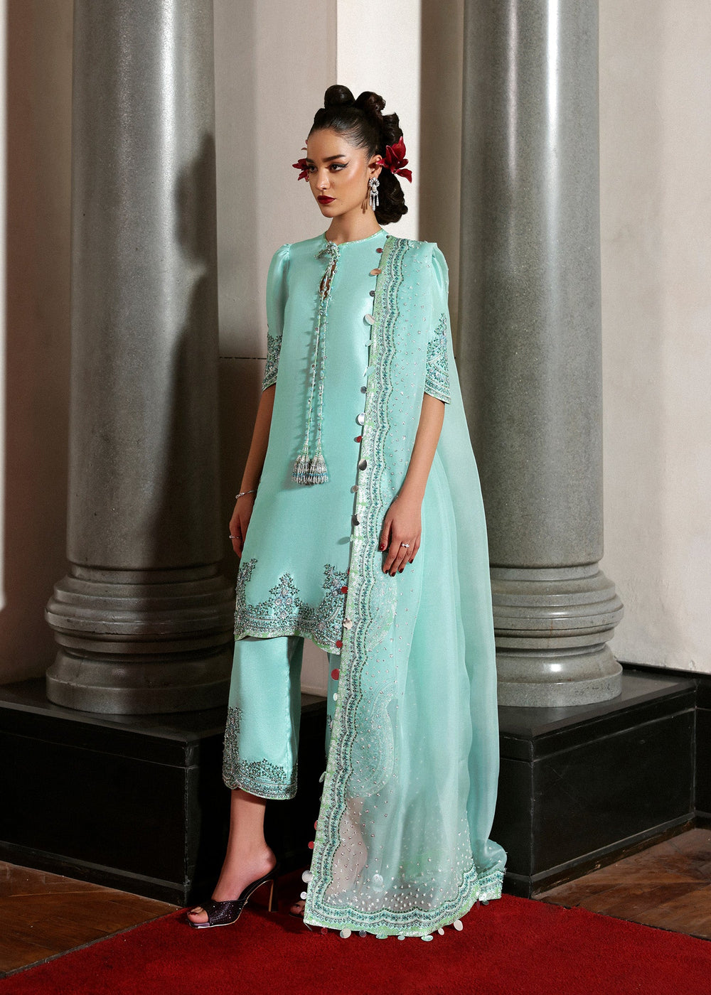The Mynt Ensemble is a refreshing blend of elegance and modern allure. Crafted from luxurious fabric, it features delicate embellishments that highlight its refined tailoring and graceful flow. The soothing tones are elevated with intricate detailing, while the accompanying dupatta completes the look with understated sophistication. Mynt is the perfect choice for those who seek timeless beauty with a contemporary edge.