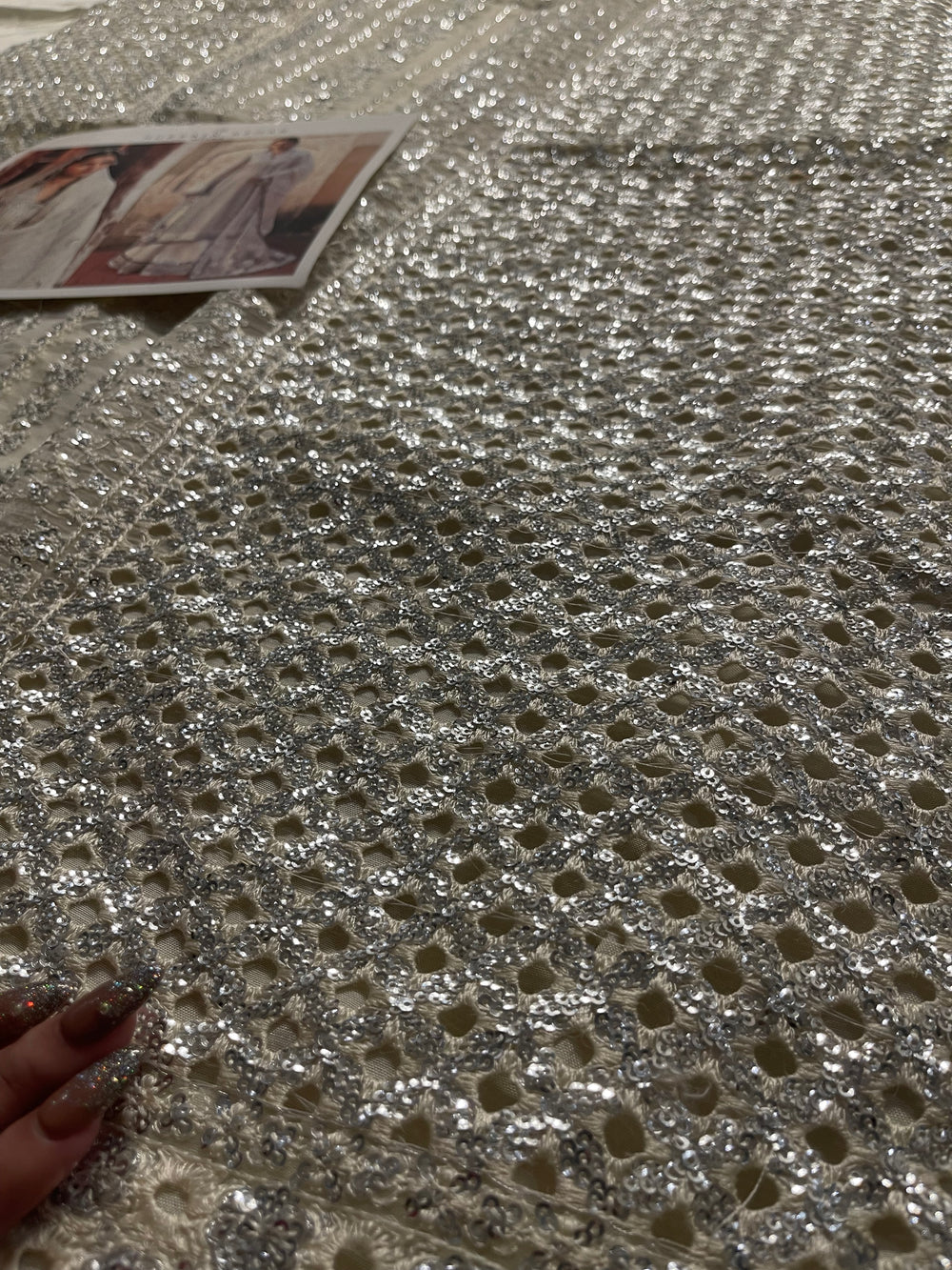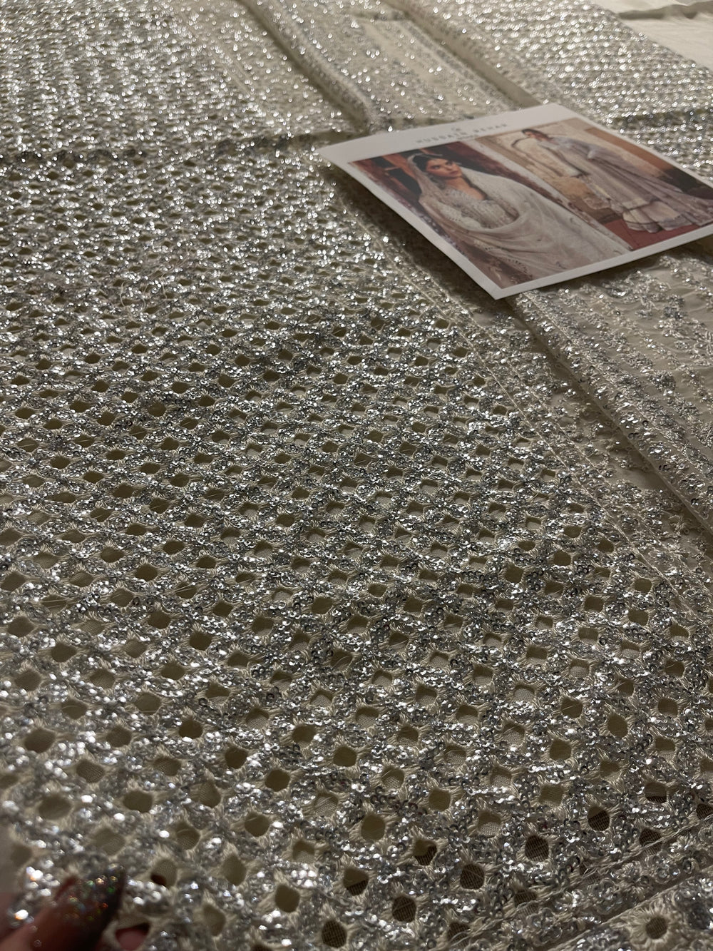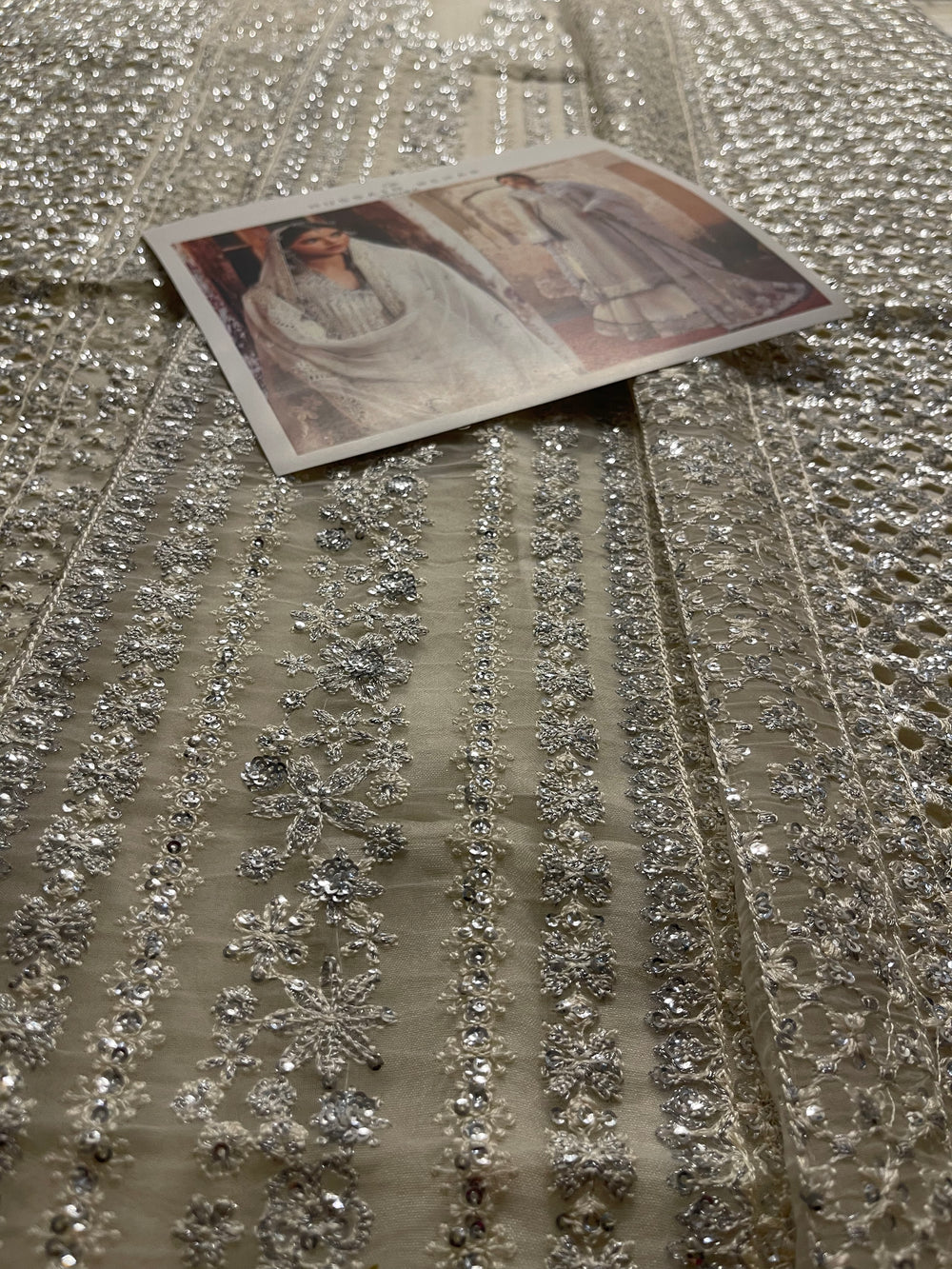 Our inspired piece captures the soft, moonlit charm of the original with its serene ivory tones and beautifully detailed patterns that create a quietly luxurious look. The silhouette drapes with effortless grace, featuring intricate textures and a sophisticated flow that feels timeless yet modern.