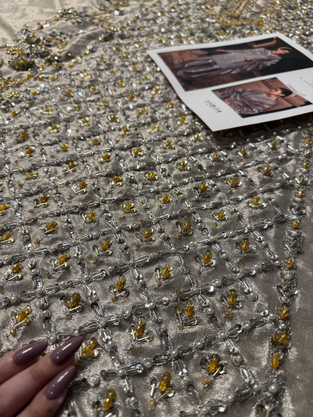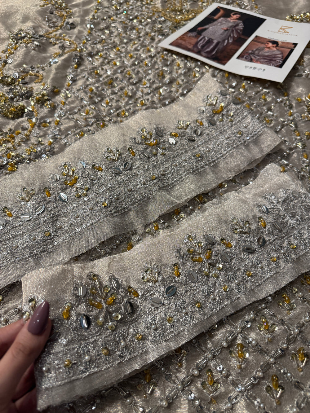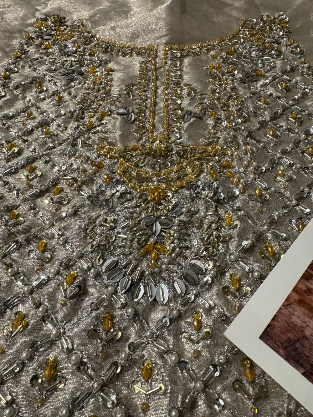 The Gulnaar ensemble exudes timeless allure with its rich, romantic tones and intricate craftsmanship. Delicately adorned with handworked details, the outfit blends heritage artistry with modern finesse. The graceful silhouette, paired with refined embellishments and a fluid dupatta, creates an aura of regal sophistication — perfect for festive and wedding soirées.