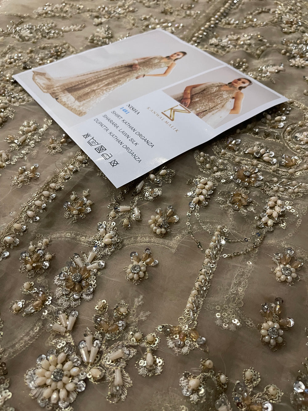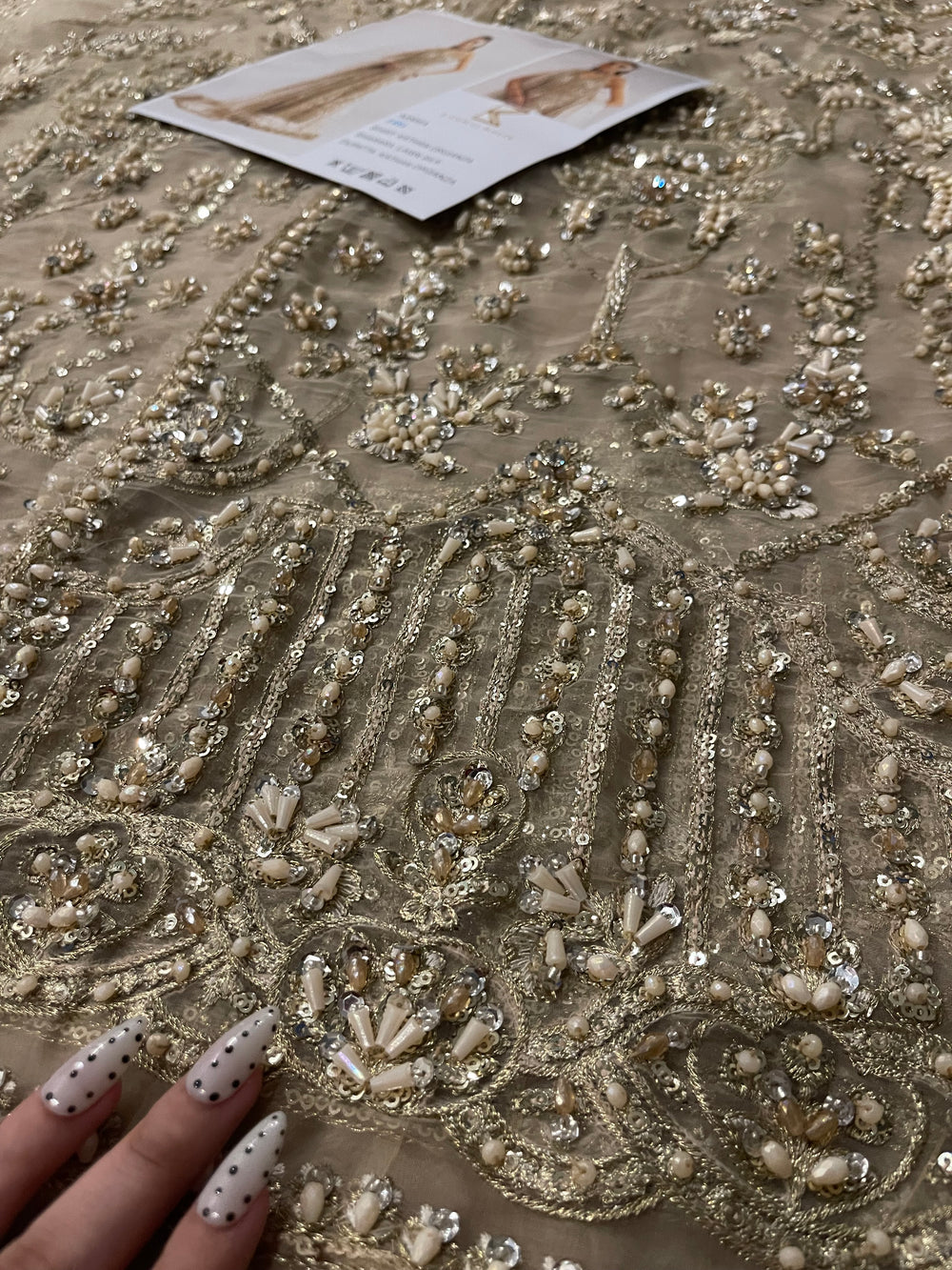 A vision of timeless elegance, this ethereal ivory ensemble is adorned with delicate gold embellishments and intricate detailing. Flowing layers, dreamy textures, and a regal silhouette come together to create a piece that speaks of quiet grandeur and refined charm. Perfect for those who wish to embody grace with a hint of opulence.