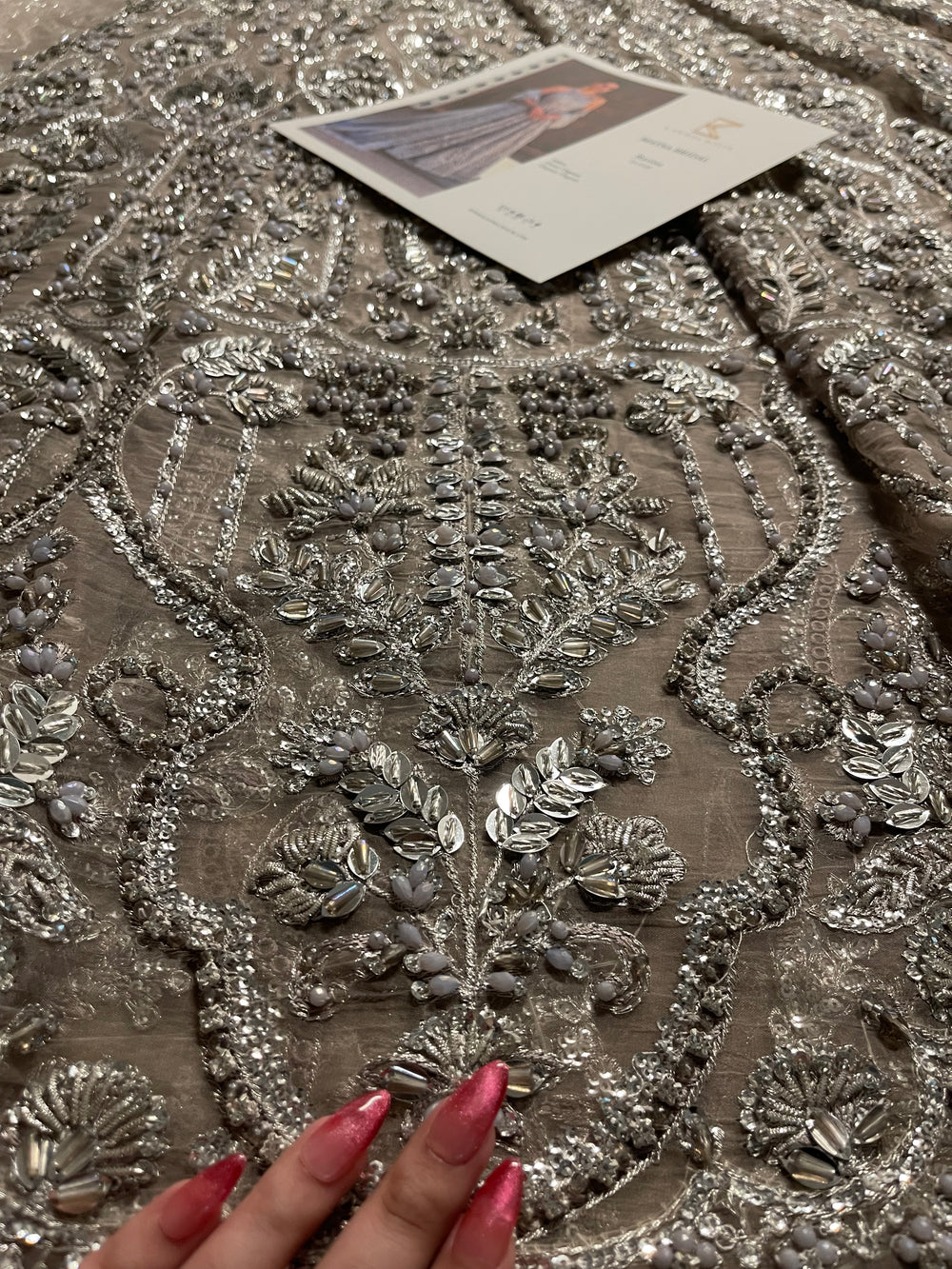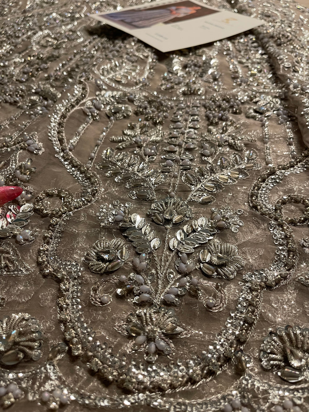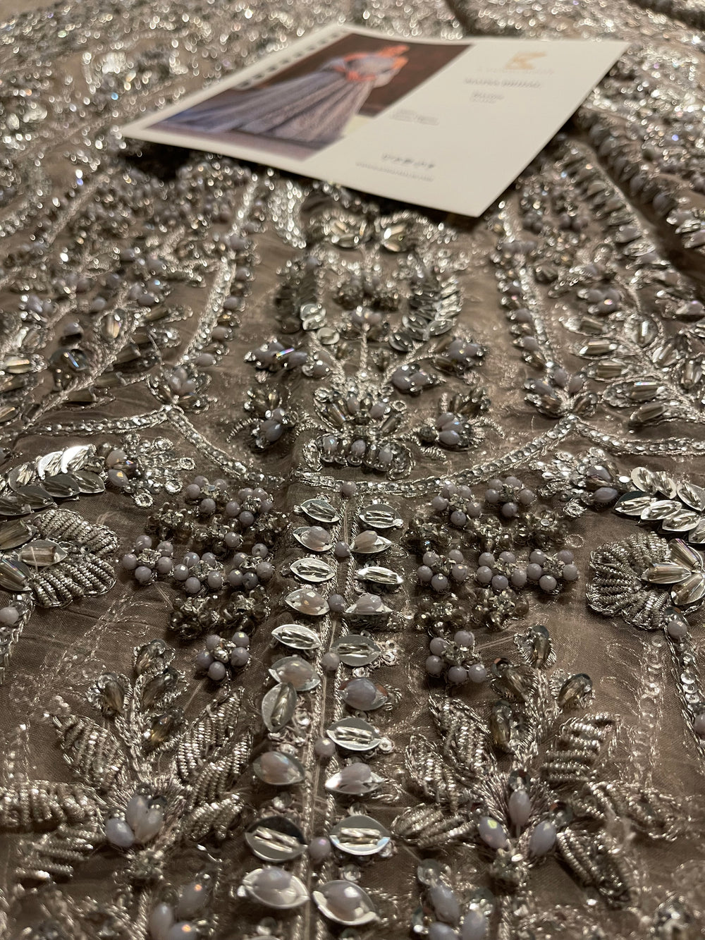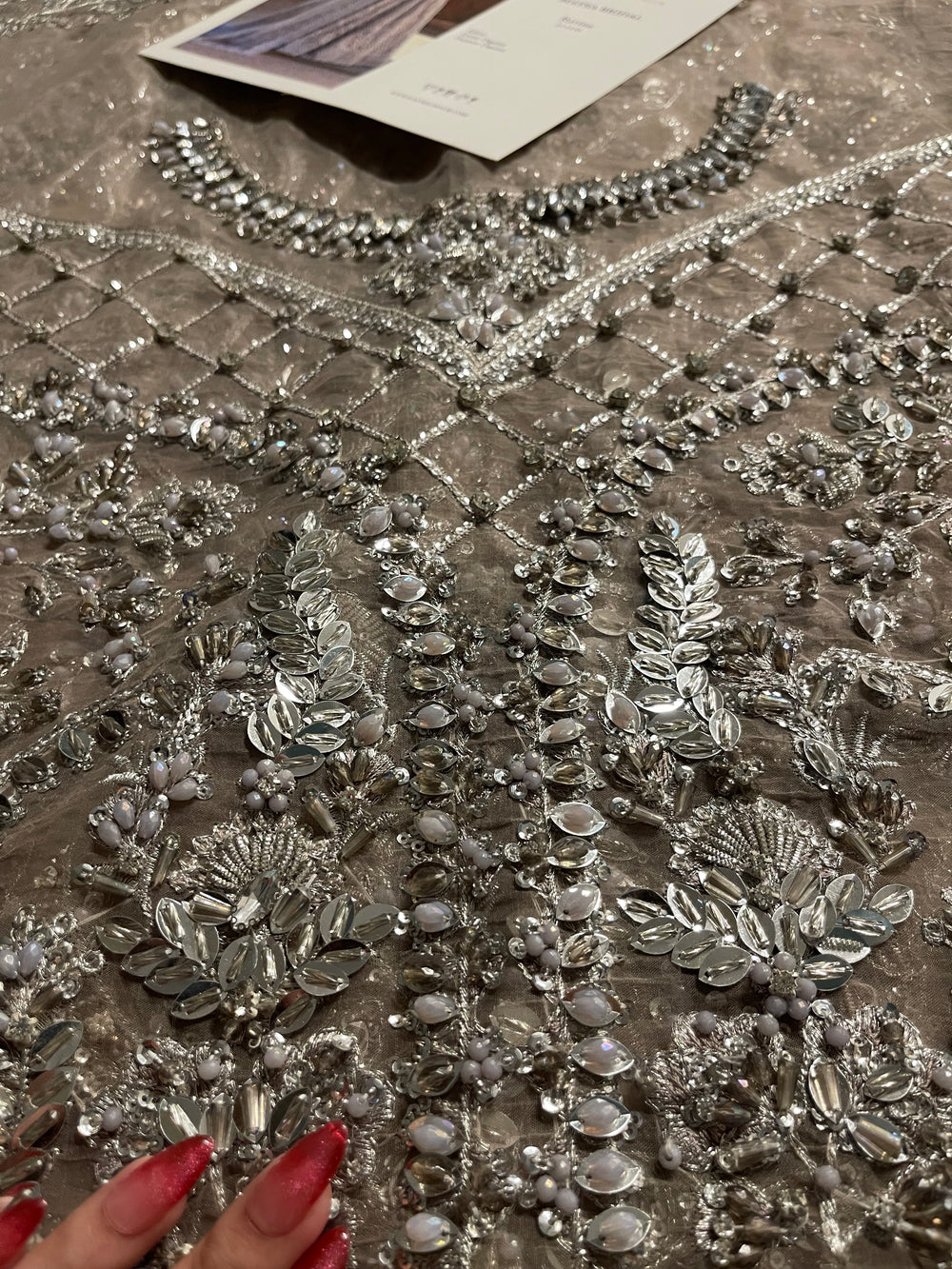 A mesmerising creation crafted in soft, glimmering tones, this ensemble embodies timeless sophistication. The silhouette is adorned with delicate handworked embellishments that flow seamlessly across the fabric, creating an ethereal, light-catching charm. Intricate detailing on the neckline and panels adds a touch of regal finesse, while the paired drape completes the look with effortless grace. Perfect for bridesmaids, wedding guests, and anyone wishing to make a refined yet captivating statement, this design blends luxury craftsmanship with modern elegance.