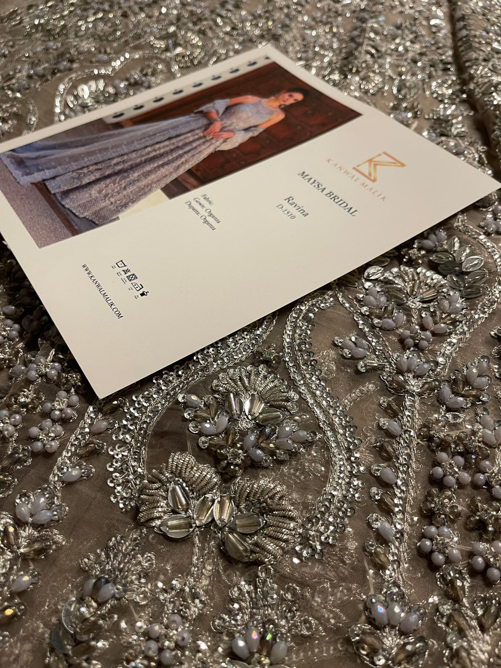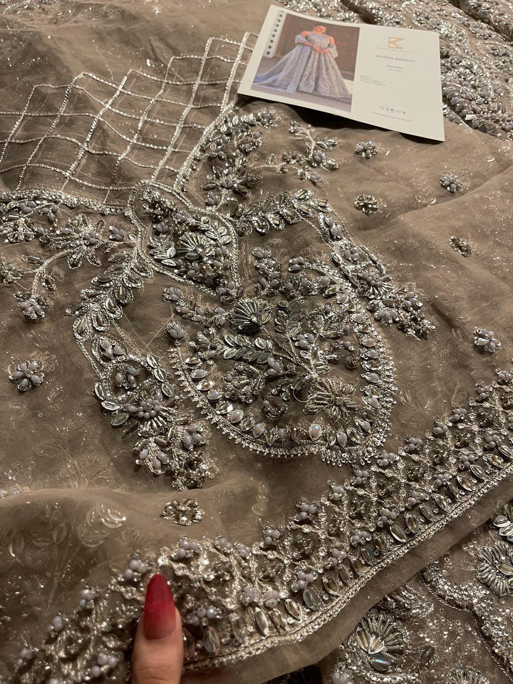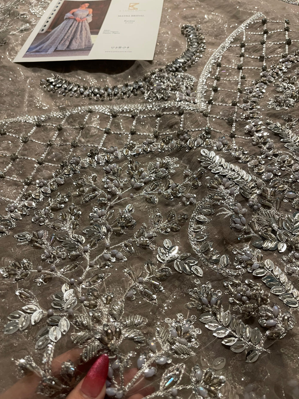 A mesmerising creation crafted in soft, glimmering tones, this ensemble embodies timeless sophistication. The silhouette is adorned with delicate handworked embellishments that flow seamlessly across the fabric, creating an ethereal, light-catching charm. Intricate detailing on the neckline and panels adds a touch of regal finesse, while the paired drape completes the look with effortless grace. Perfect for bridesmaids, wedding guests, and anyone wishing to make a refined yet captivating statement, this design blends luxury craftsmanship with modern elegance.