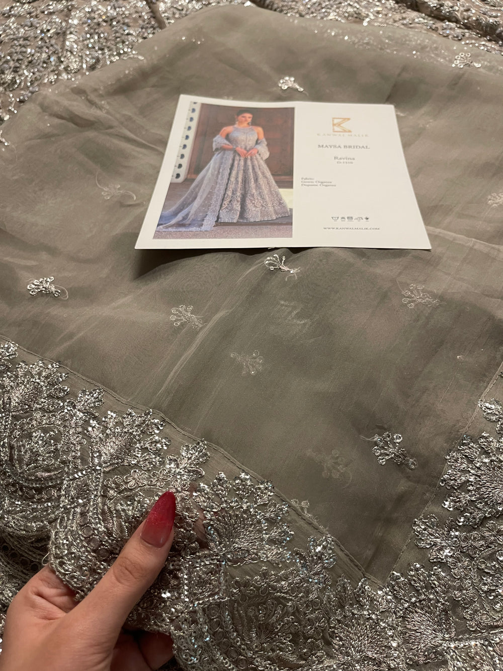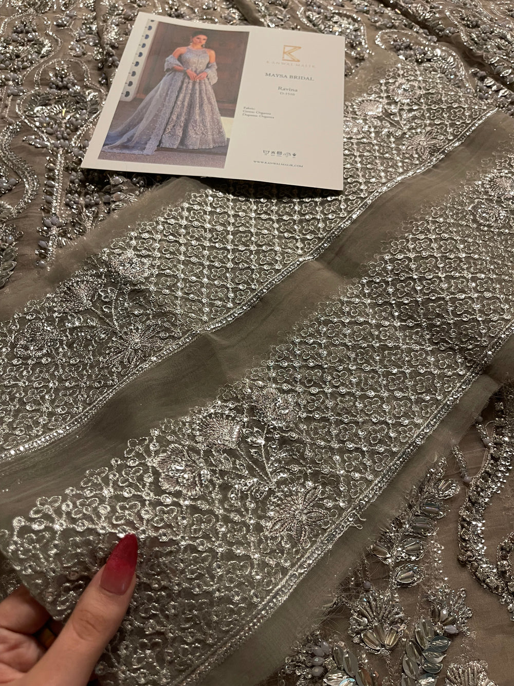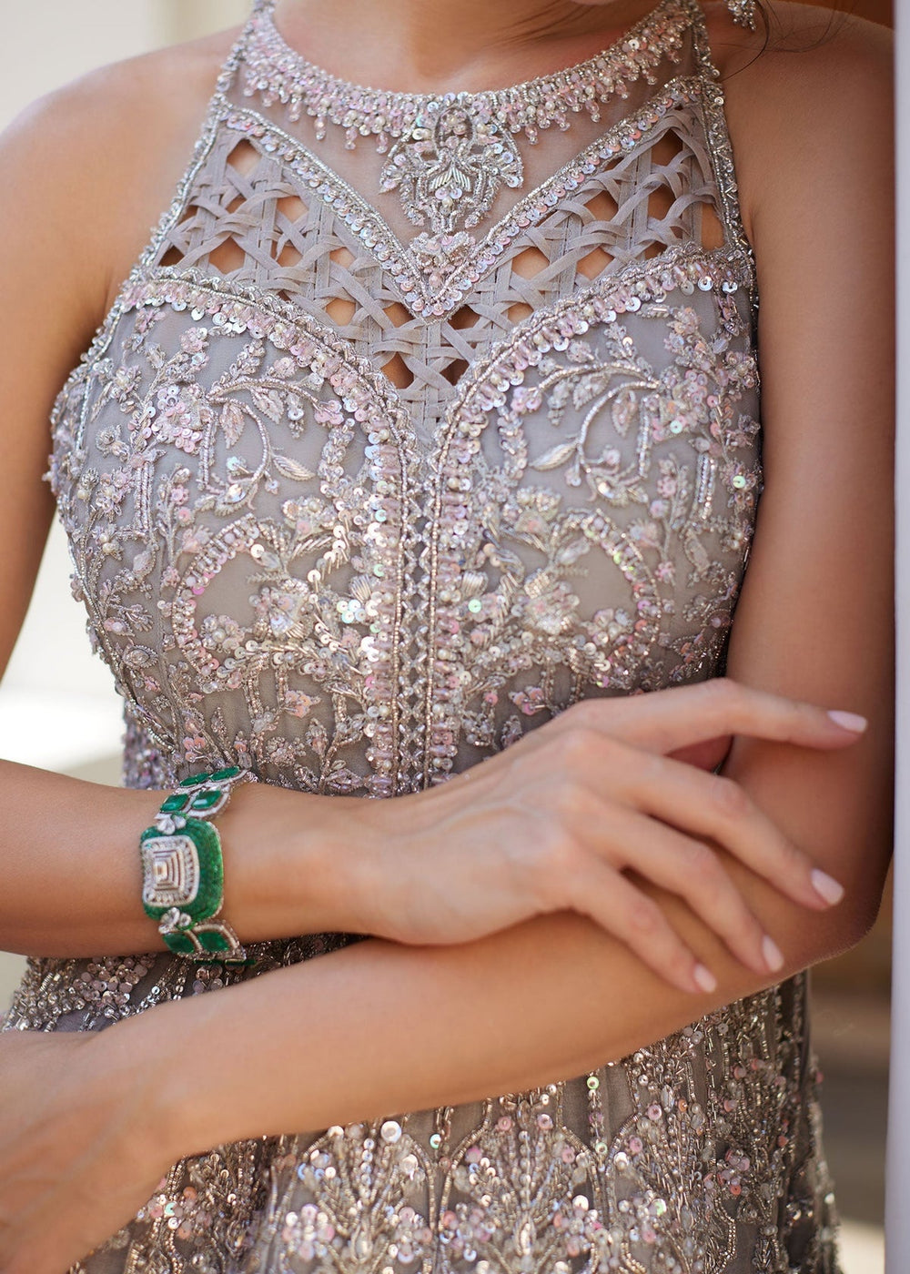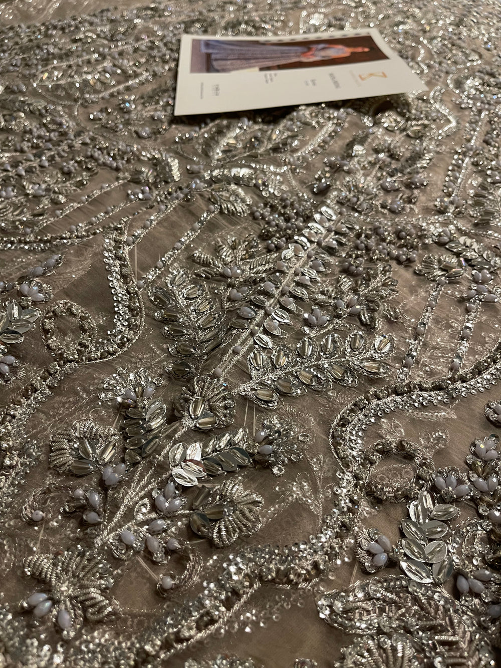 A mesmerising creation crafted in soft, glimmering tones, this ensemble embodies timeless sophistication. The silhouette is adorned with delicate handworked embellishments that flow seamlessly across the fabric, creating an ethereal, light-catching charm. Intricate detailing on the neckline and panels adds a touch of regal finesse, while the paired drape completes the look with effortless grace. Perfect for bridesmaids, wedding guests, and anyone wishing to make a refined yet captivating statement, this design blends luxury craftsmanship with modern elegance.