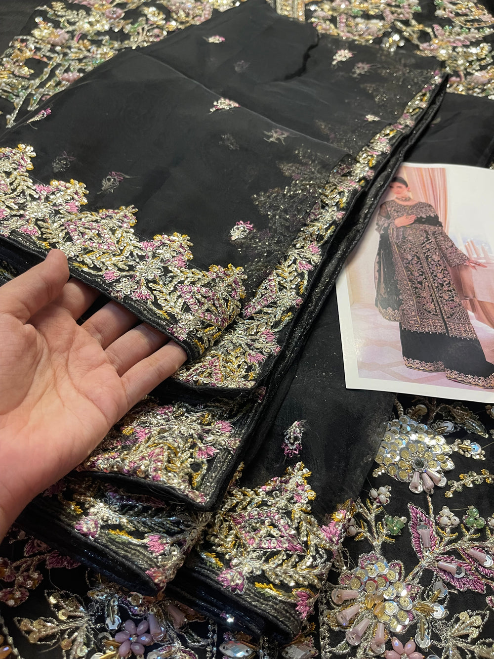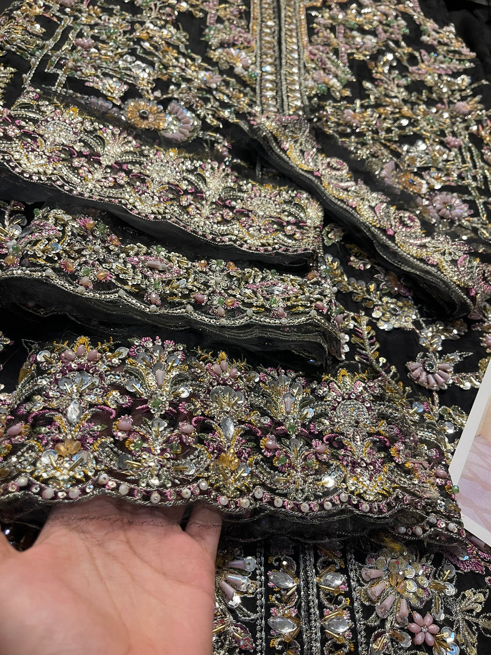 The black front-open gown is a masterpiece of craftsmanship, featuring intricate embroidery and embellishments that adorn its entirety. The rich black organza fabric serves as the perfect canvas for the exquisite detailing, with delicate threadwork, sequins, and beads creating a mesmerizing effect that catches the light with every movement. The front-open design adds a modern twist to the traditional gown, allowing for graceful movement and effortless allure. Complementing the gown with the flare pants, tailored to perfection to ensure a flattering fit. Adorned with a border along the bottom hem, the pants add a touch of sophistication to the ensemble while maintaining a sense of understated elegance.