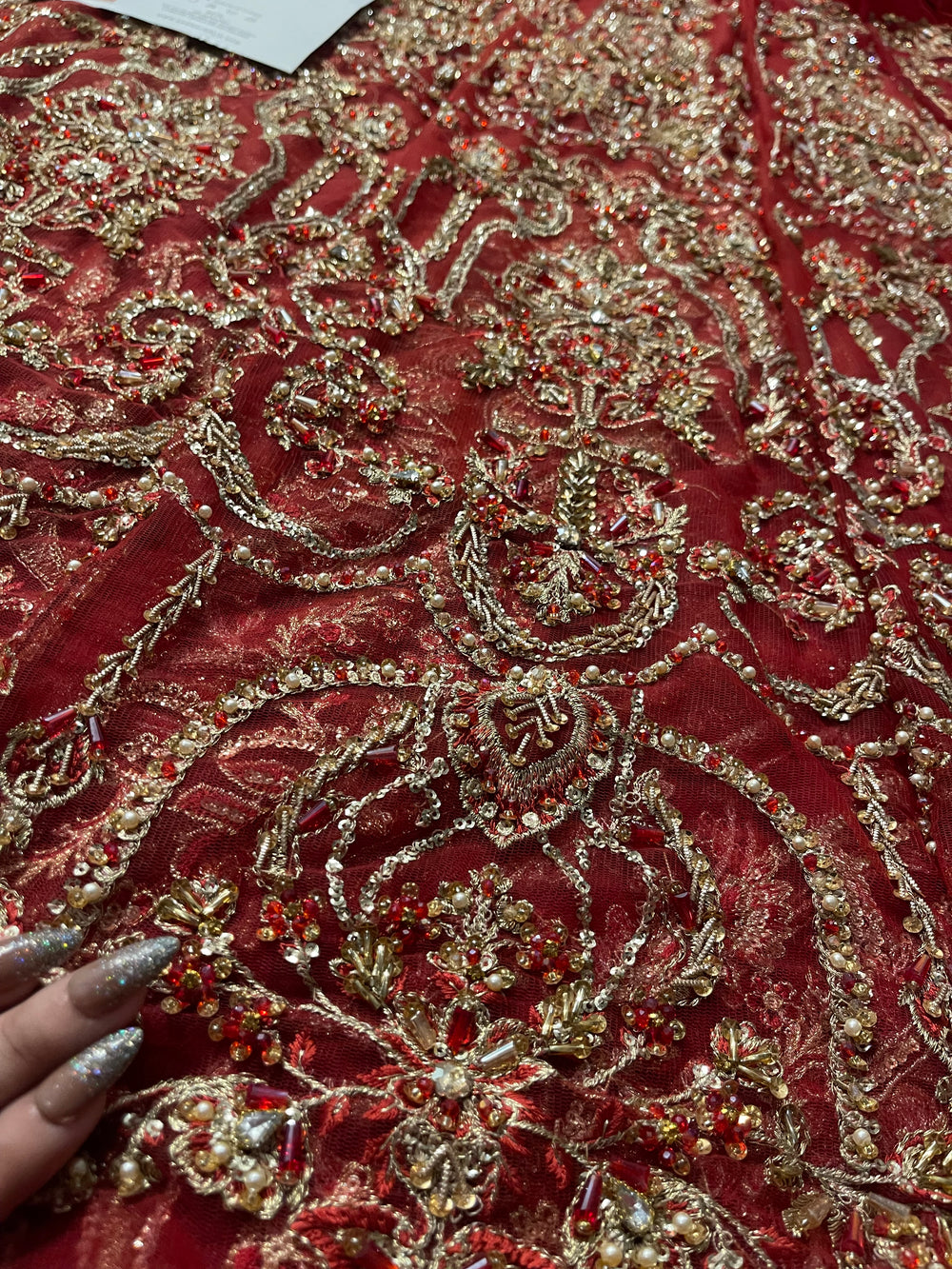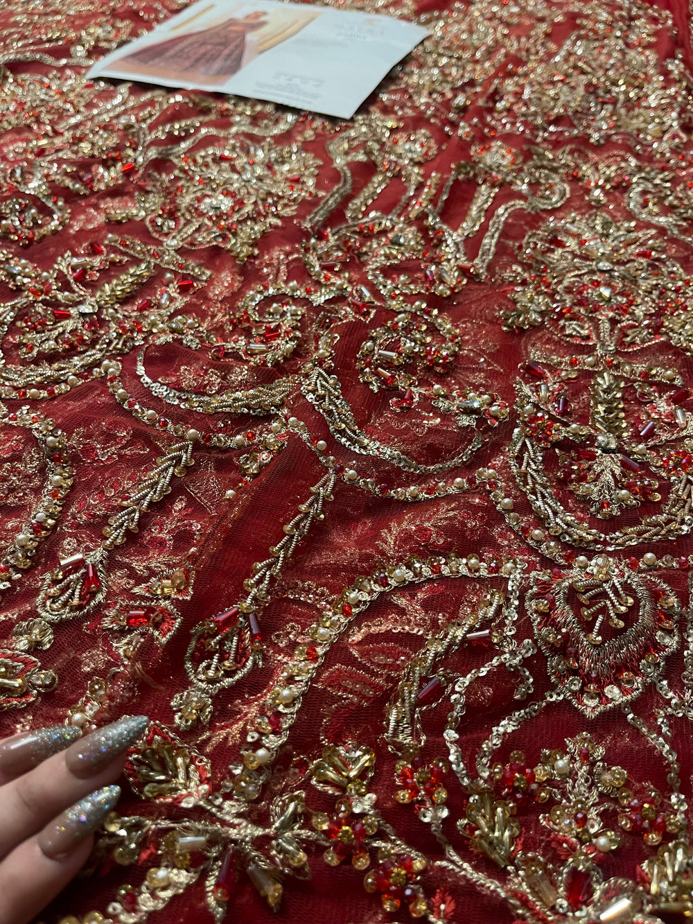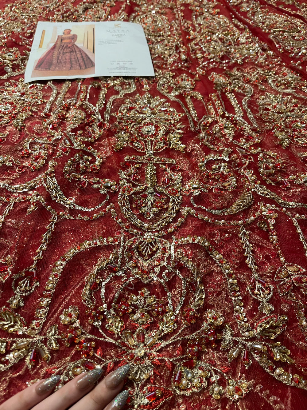 A vision of timeless allure, Zarwa by Kanwal Malik (ours is an inspired piece) speaks in shades of deep scarlet red and gold — a masterpiece where intricate artistry meets quiet regality. The ensemble flows with ornate craftsmanship, subtle shimmer, and that ethereal charm Kanwal Malik designs are known for. Perfect for the bride who dreams in elegance and tradition.