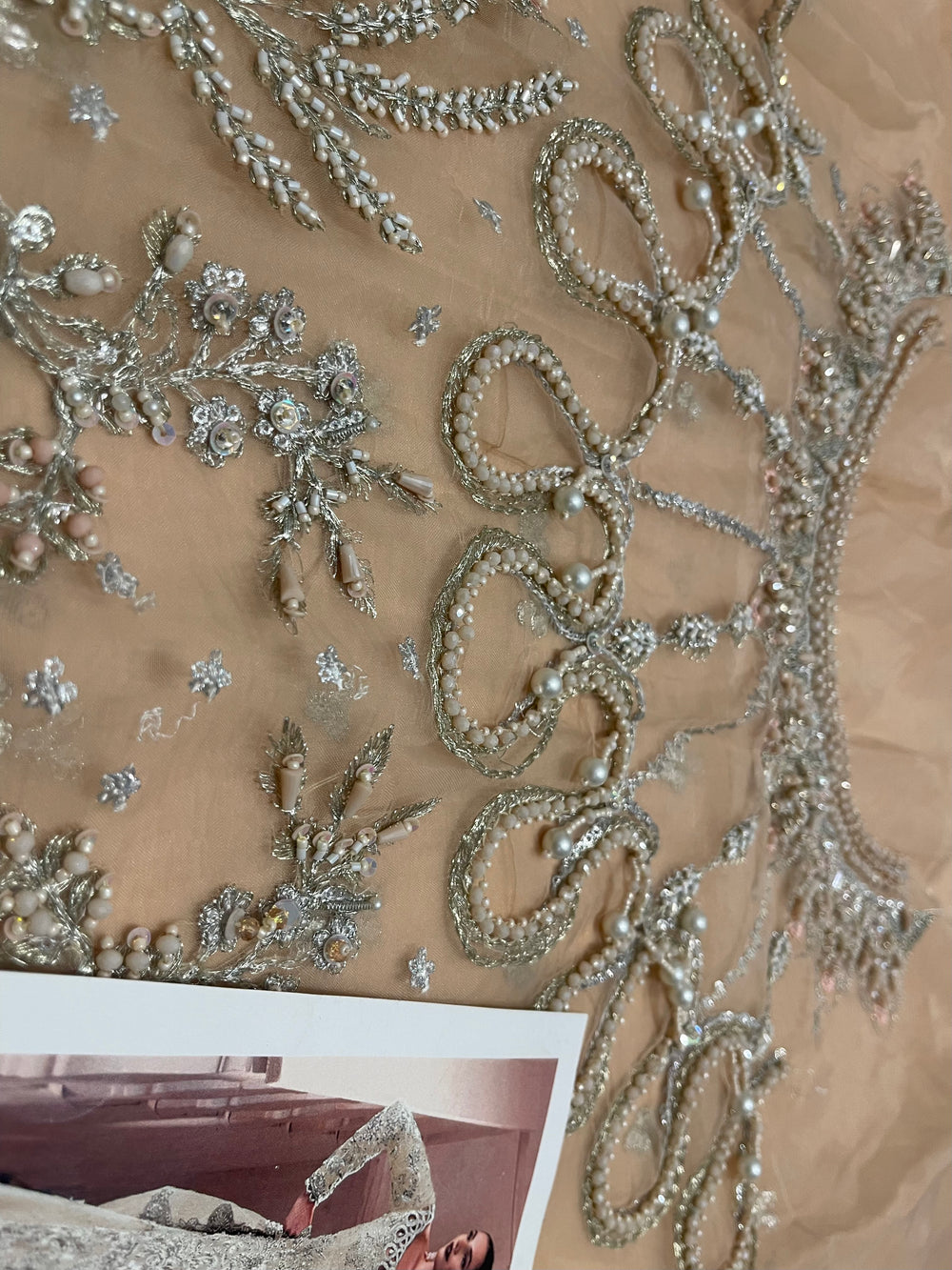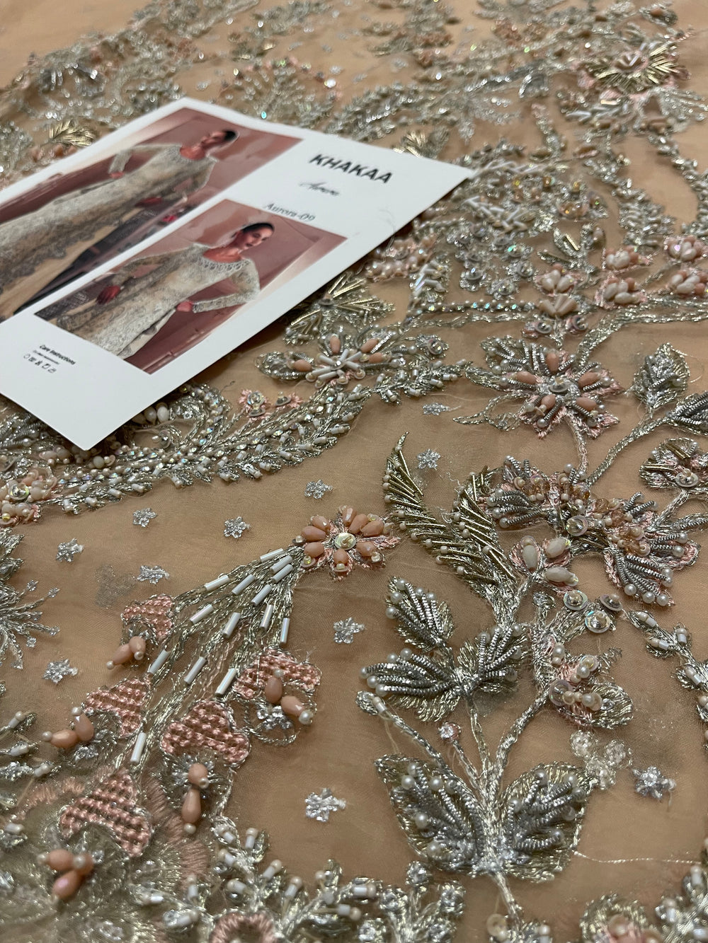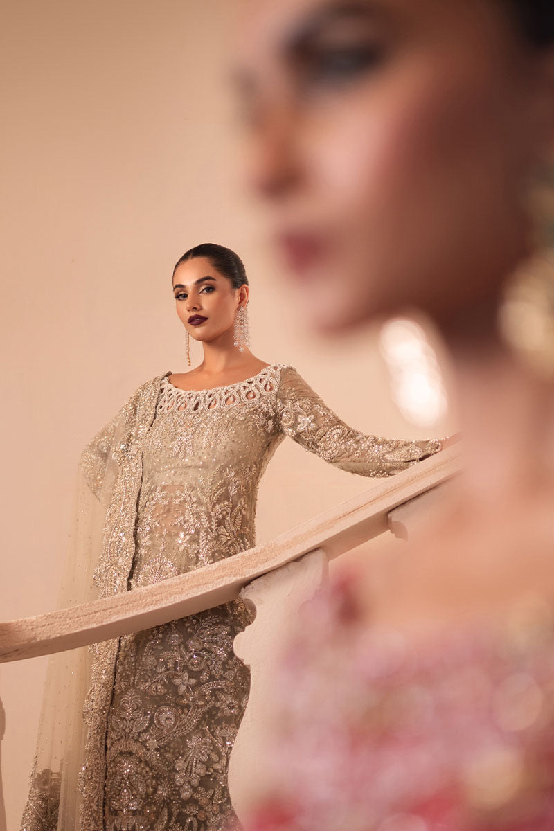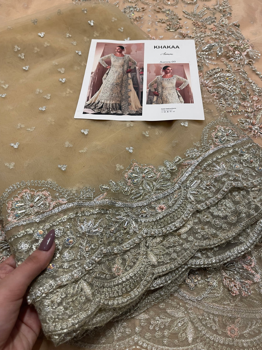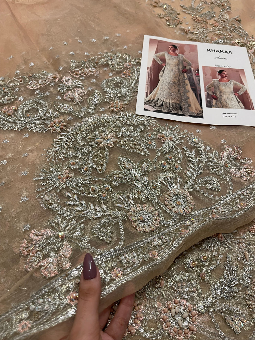 The "Aurora" dress exudes elegance with its intricate embroidery and delicate detailing. The long, flowing silhouette is adorned with sparkling beadwork, creating a luxurious look perfect for special occasions. The neckline features a unique cut-out design, adding a modern twist to the traditional ensemble. Paired with a sheer dupatta that complements the dress's ornate embroidery, the overall look is timeless and sophisticated, ideal for weddings or formal events.