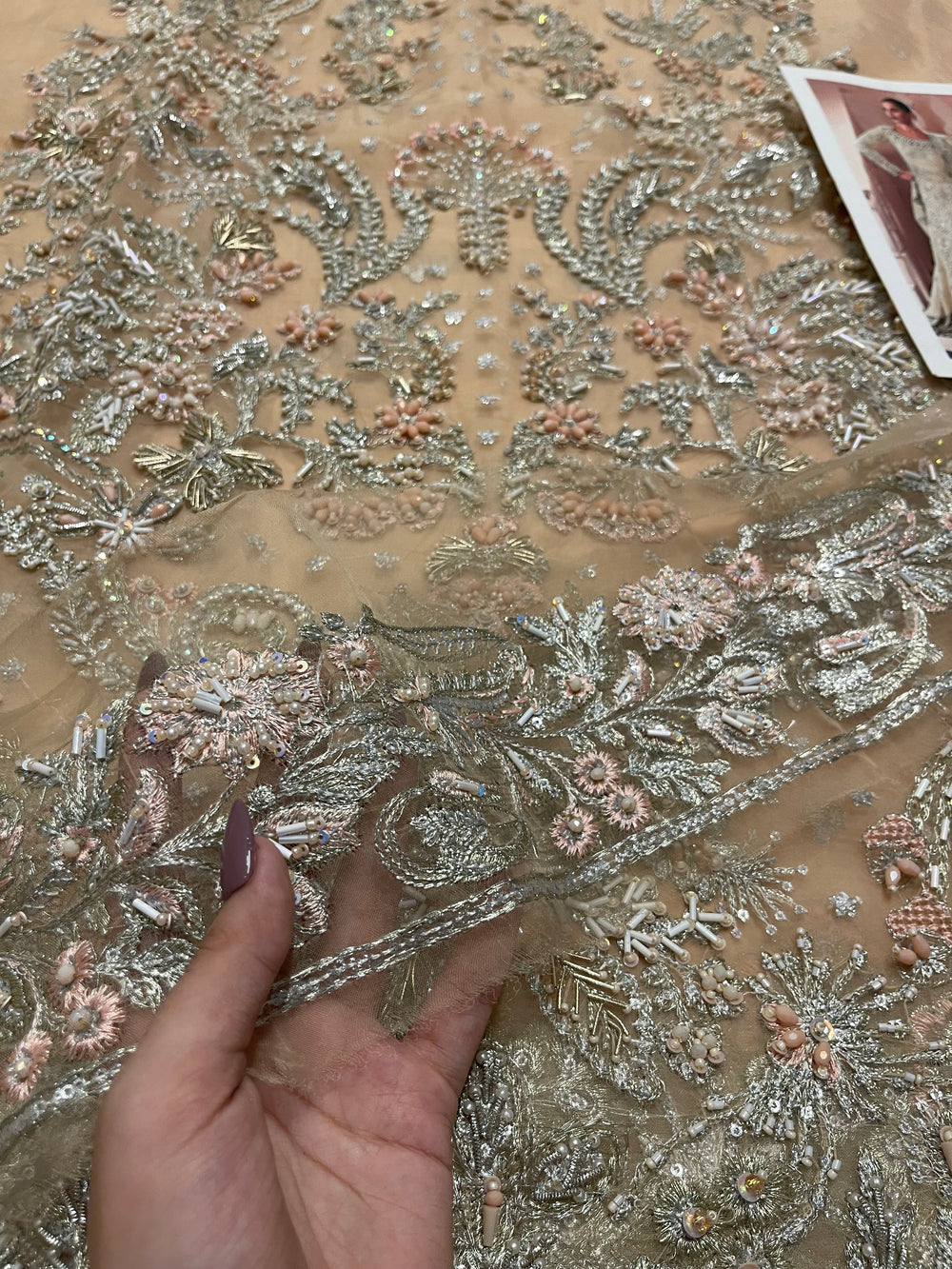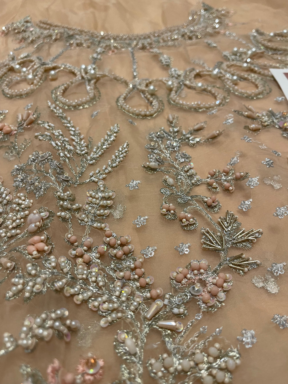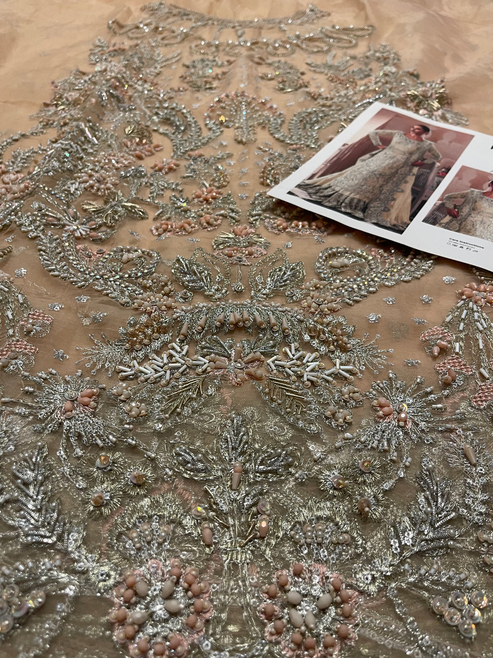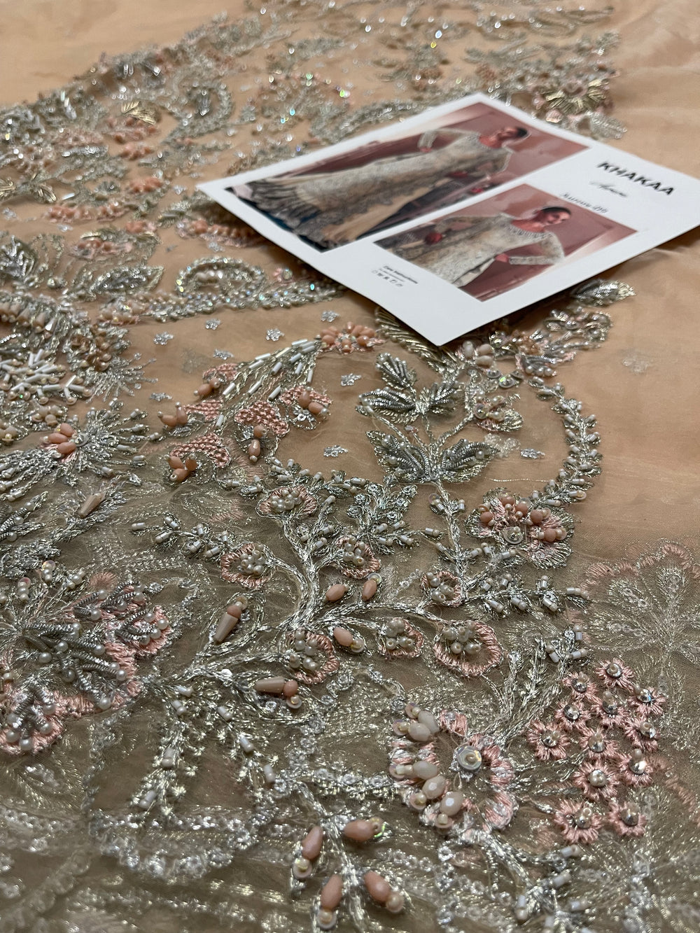 The "Aurora" dress exudes elegance with its intricate embroidery and delicate detailing. The long, flowing silhouette is adorned with sparkling beadwork, creating a luxurious look perfect for special occasions. The neckline features a unique cut-out design, adding a modern twist to the traditional ensemble. Paired with a sheer dupatta that complements the dress's ornate embroidery, the overall look is timeless and sophisticated, ideal for weddings or formal events.