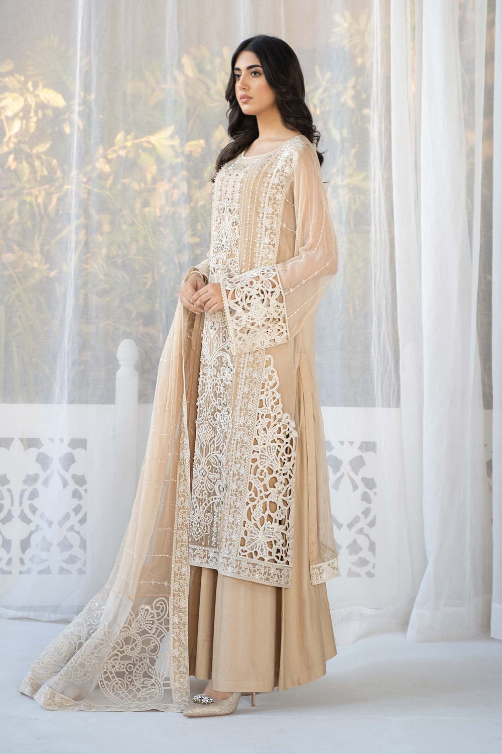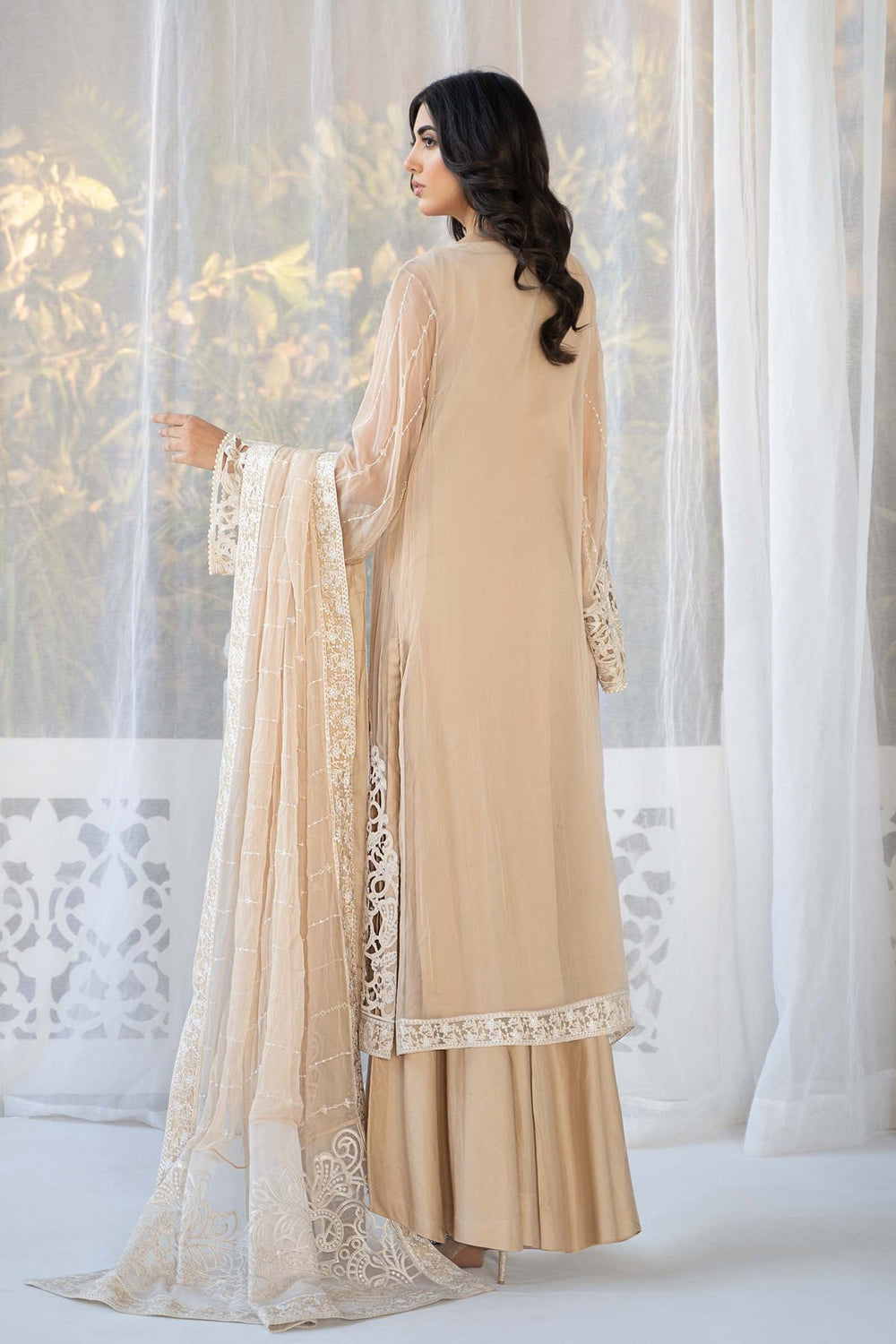 Crafting a stunningly visual composition with pearl beading, cutwork, and thread embroidery for timeless allure; this three-piece embroidered chiffon suit hosts a celestial coffee canvas crafting a captivating fusion with audacious floras and intricate classical elements. The profound design is juxtaposed with dyed wide-leg trousers and an embroidered dupatta elevated with sequins, culminating in a look design to unveil the inner muse within every woman and create an unparalleled statement during the summer soirees.