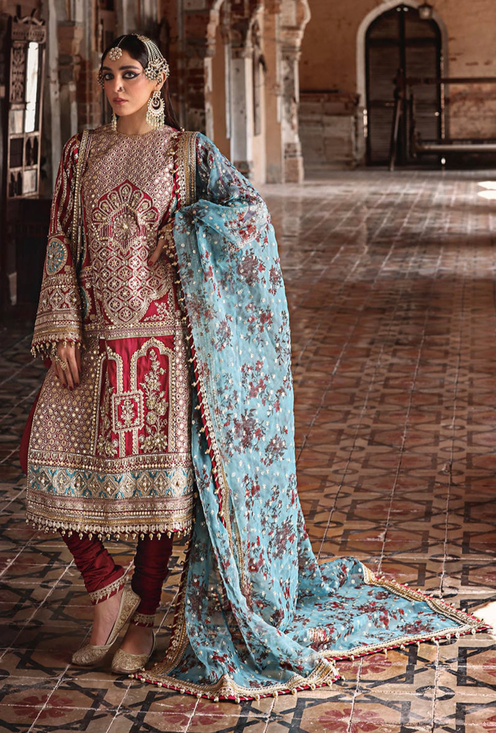 Introducing the 'Bibi Lal' ensemble, a breathtaking masterpiece that combines the regality of a red silk shirt with the serenity of a turquoise blue organza dupatta. The silk shirt is a canvas of intricate craftsmanship, adorned with card mirror, pearls, Tilla work, precious jewels, and ada-work. The satin silk contrast border and side circles patches lend a touch of opulence to the ensemble.Completing this enchanting composition is an organza printed and embroidered dupatta with a four-sided satin silk border, adding a harmonious contrast to the vibrant red. The silk embroidered trouser enhances the allure of 'Bibi Lal' with its rich detailing. This ensemble is a true embodiment of bridal elegance, where tradition meets contemporary splendor