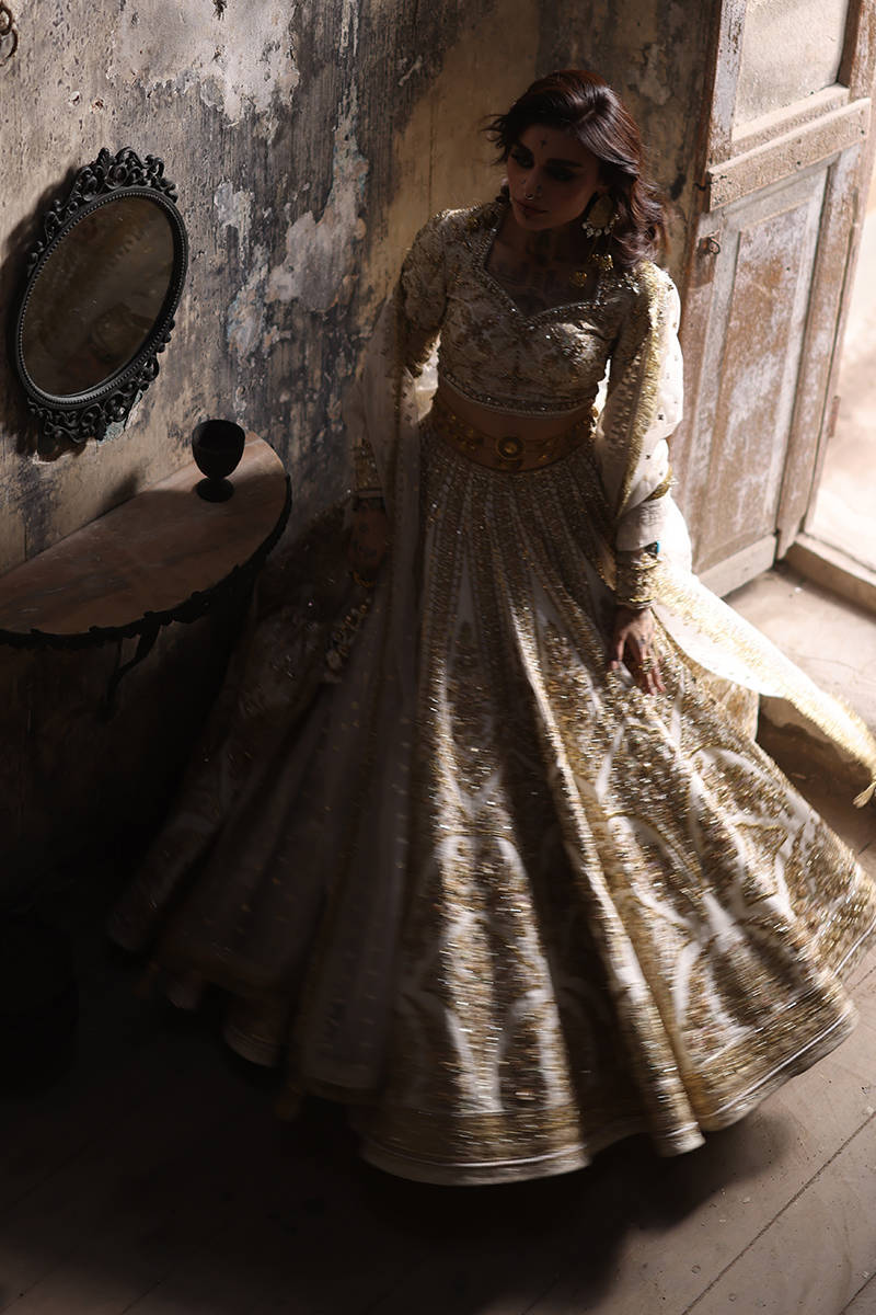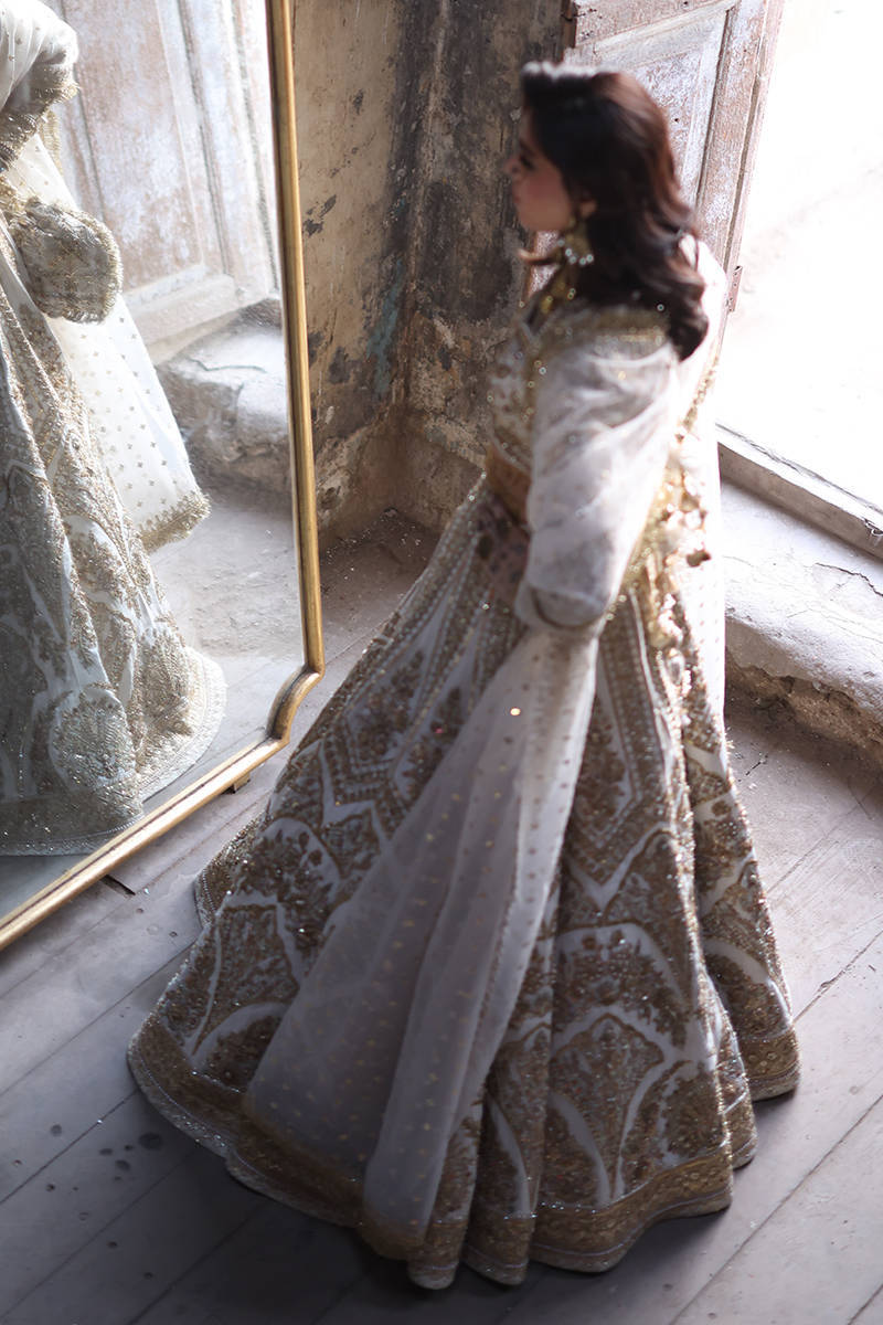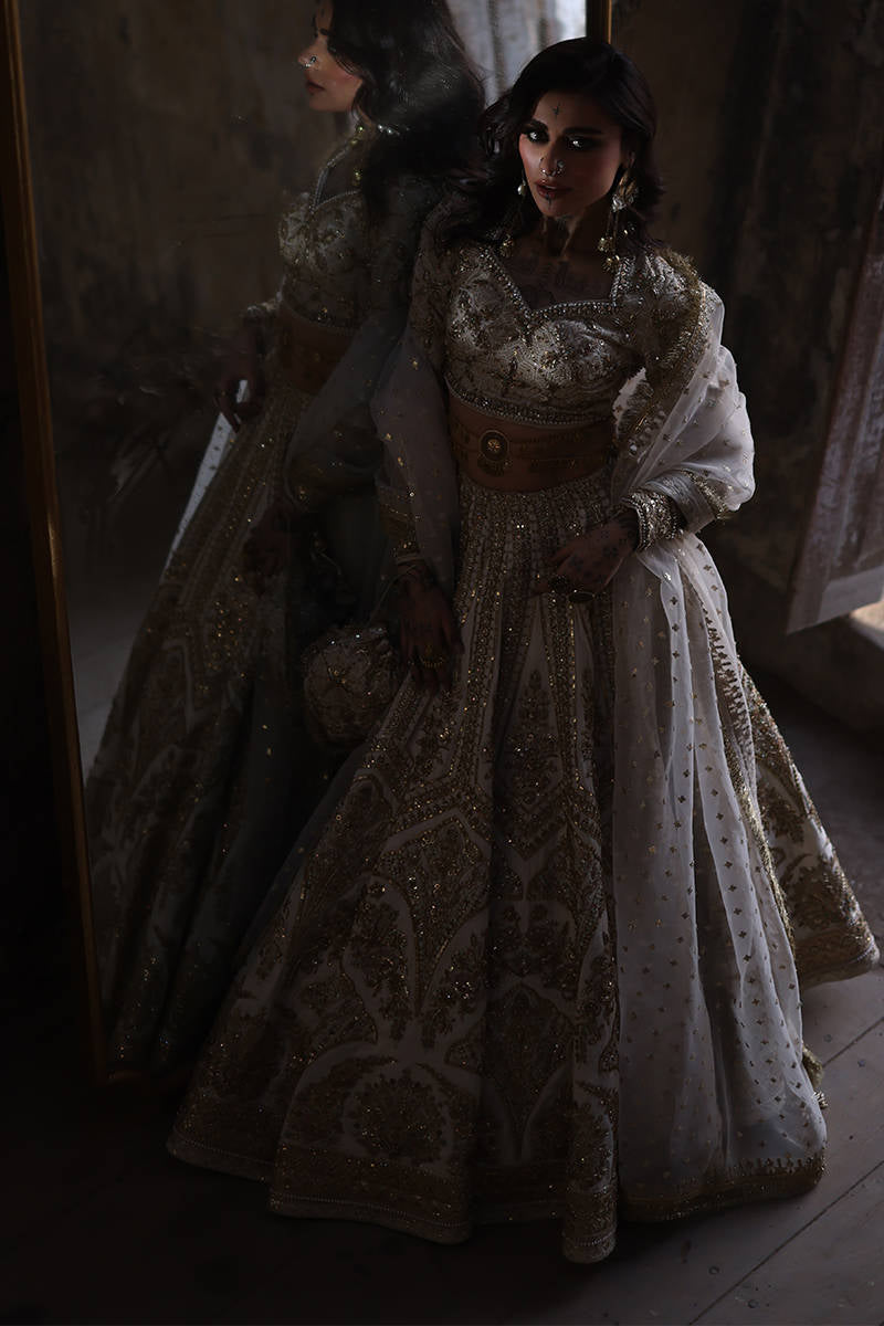 Illuminate the room with "Bibbojaan" in pearl white and gold from the Gold Series Hussan Ara Mansion Collection by Mohsin Naveed Ranjha. The choli, heavily embellished with opulent multihead embroidery on Italian silk, is a vision of timeless elegance, featuring net fabric sleeves adorned with embellished motifs and borders inspired by old Mughal architecture frescos. Paired with a Lehenga featuring intricate multihead embroidery and heavy adda work on an Italian silk base, it's a testament to luxurious craftsmanship. Delight in two divine dupattas: one crafted from organza with heavy embellishments and four-sided embroidered borders, and the other featuring a spray of sequins on diaphanous fabric with four-sided light embellished multihead embroidered borders. The accompanying pouch, adorned with sumptuous embroidery and silk Jamawar accent patches, exudes sophistication.