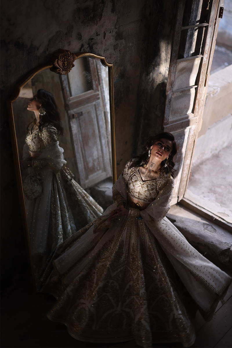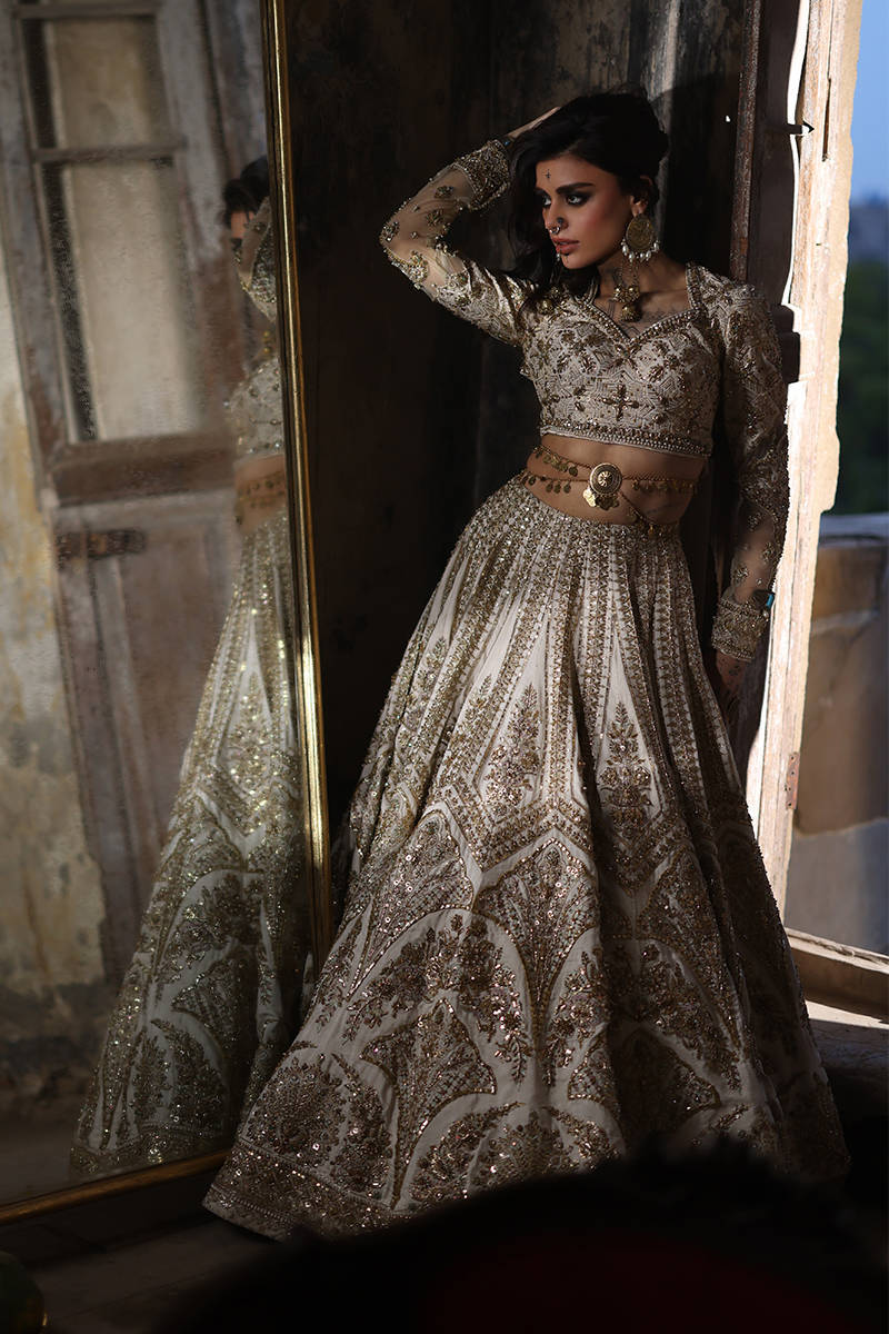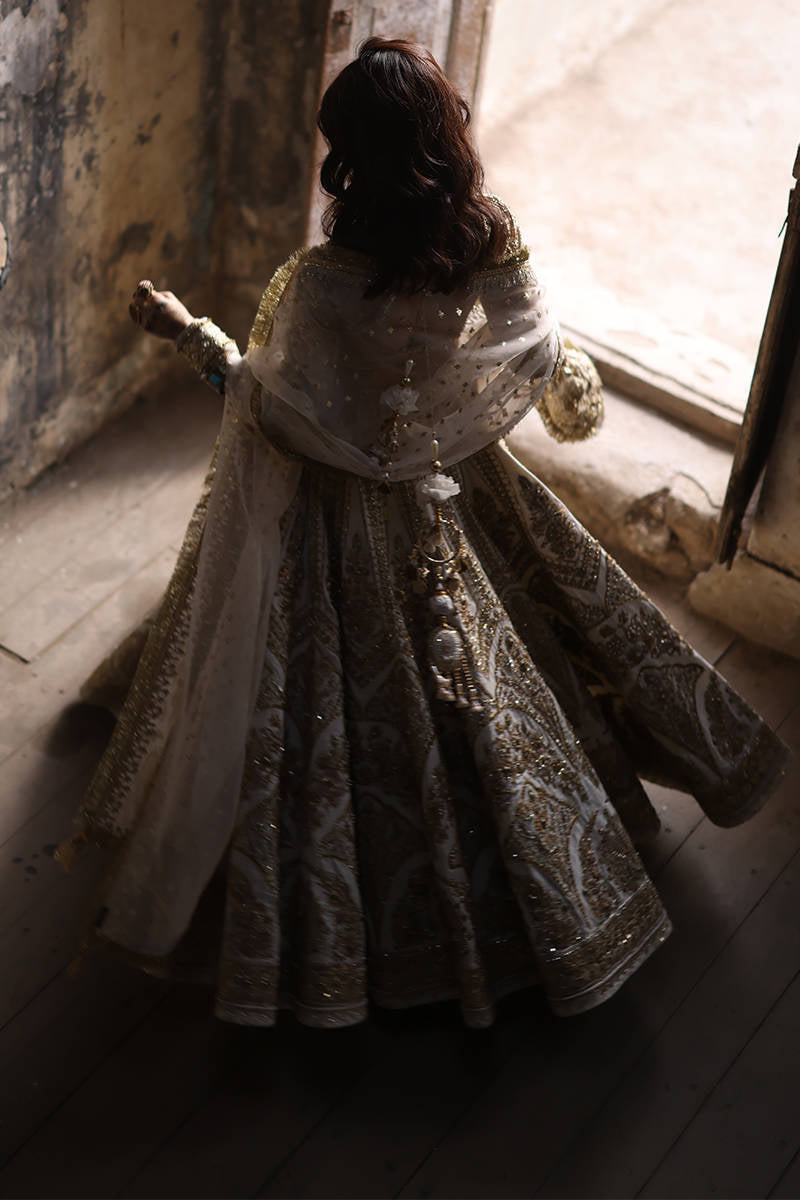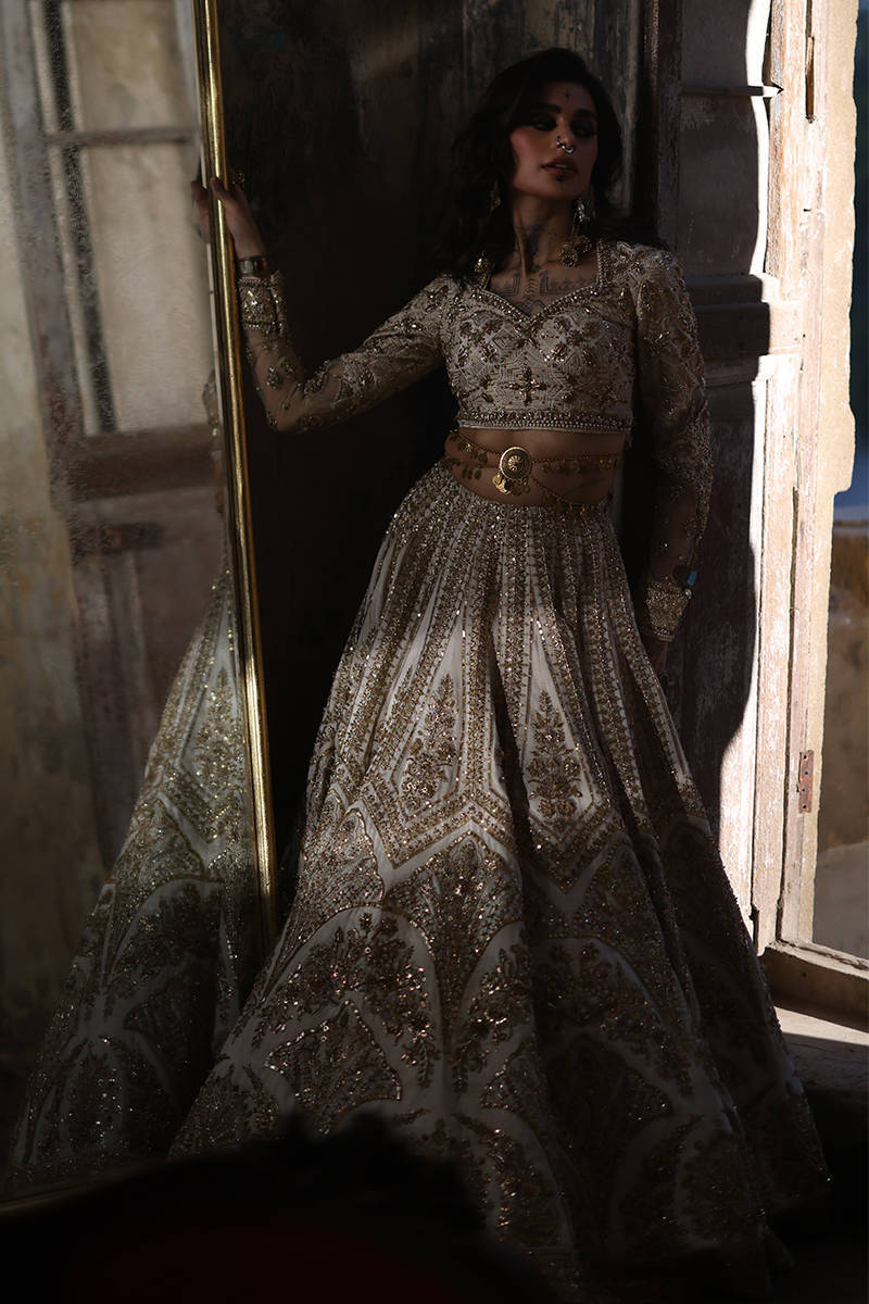 Illuminate the room with "Bibbojaan" in pearl white and gold from the Gold Series Hussan Ara Mansion Collection by Mohsin Naveed Ranjha. The choli, heavily embellished with opulent multihead embroidery on Italian silk, is a vision of timeless elegance, featuring net fabric sleeves adorned with embellished motifs and borders inspired by old Mughal architecture frescos. Paired with a Lehenga featuring intricate multihead embroidery and heavy adda work on an Italian silk base, it's a testament to luxurious craftsmanship. Delight in two divine dupattas: one crafted from organza with heavy embellishments and four-sided embroidered borders, and the other featuring a spray of sequins on diaphanous fabric with four-sided light embellished multihead embroidered borders. The accompanying pouch, adorned with sumptuous embroidery and silk Jamawar accent patches, exudes sophistication.