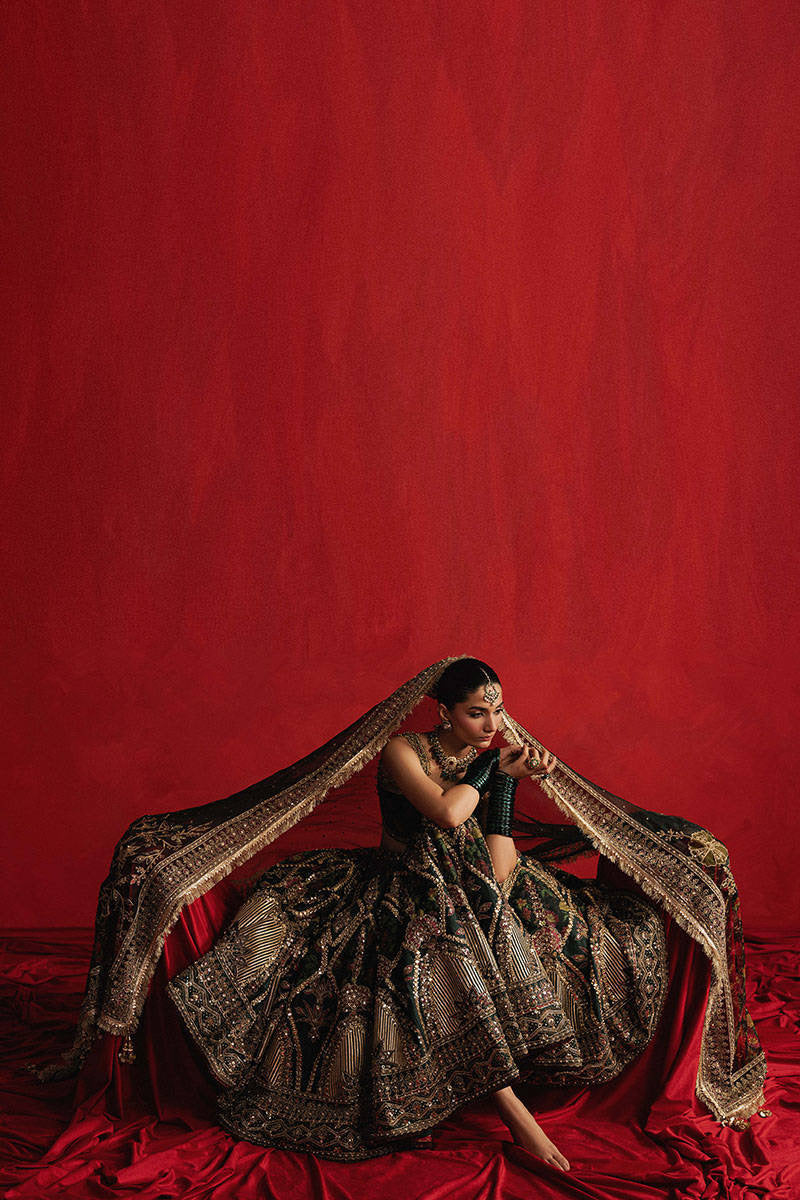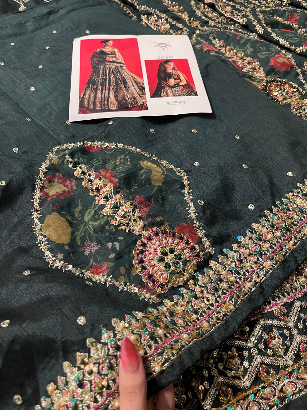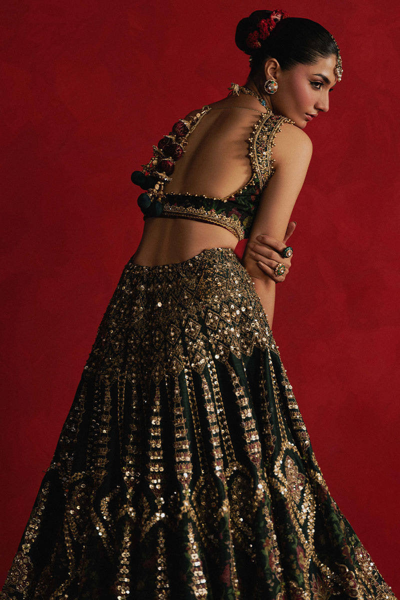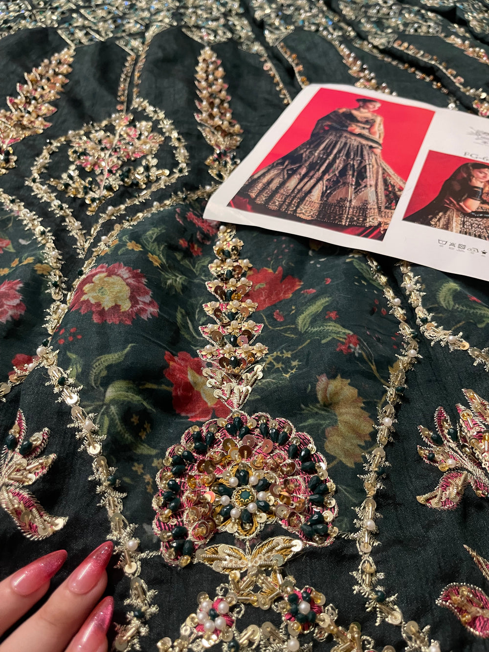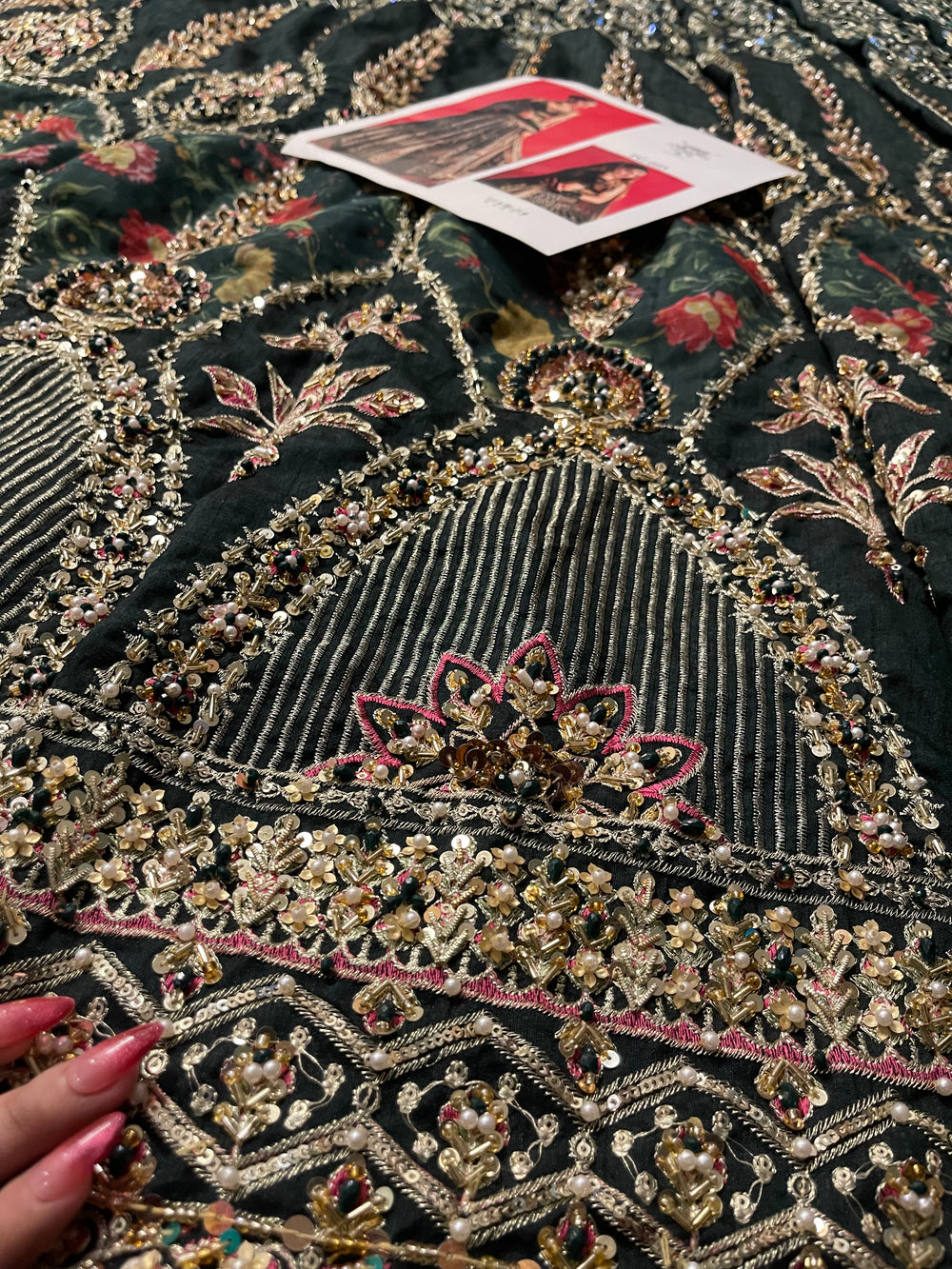 A regal creation that captures the essence of timeless grandeur. This exquisite lehenga is adorned with intricate embroidery, delicate floral detailing, and opulent embellishments that glisten with every movement. The deep hues, paired with rich gold accents, evoke an aura of royal sophistication — perfect for a bride or festive soirée. A masterpiece that celebrates heritage craftsmanship with a modern, enchanting charm.