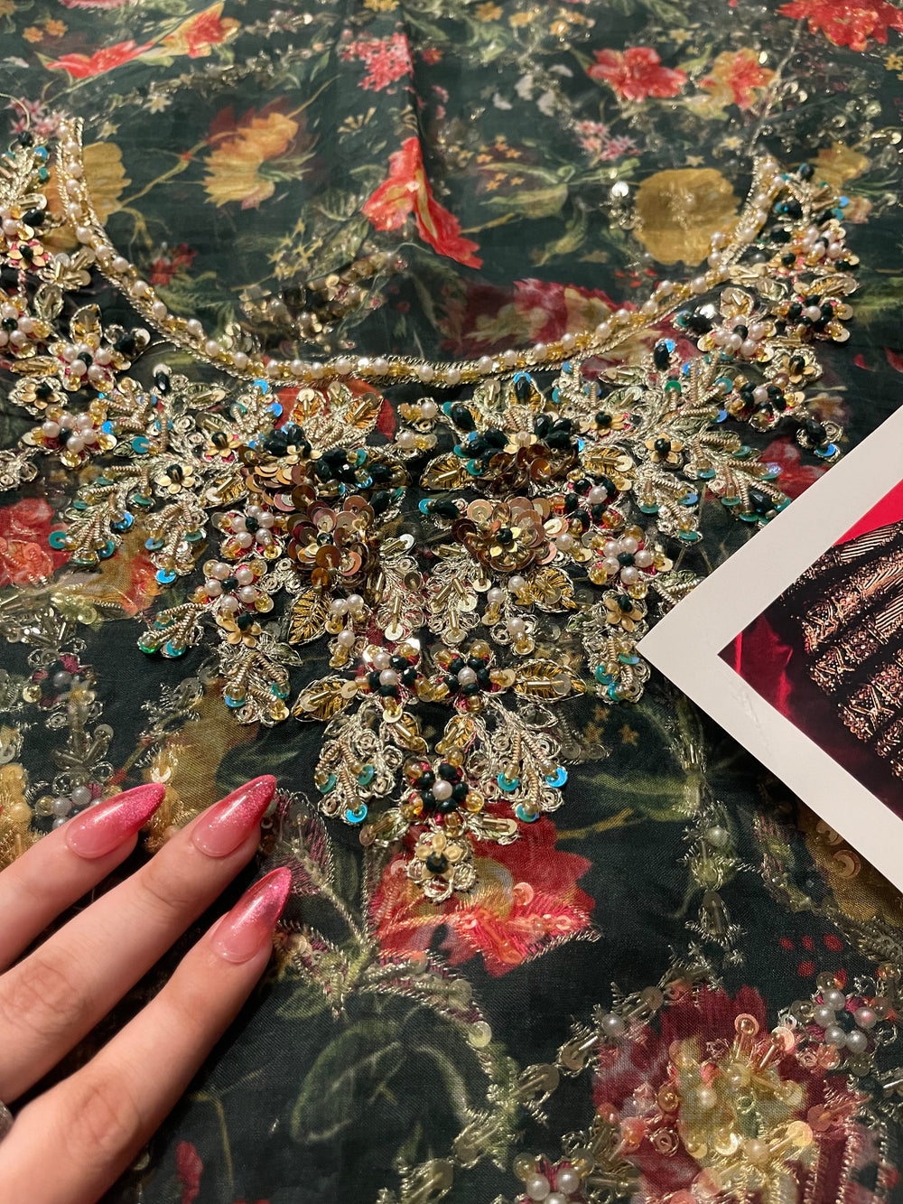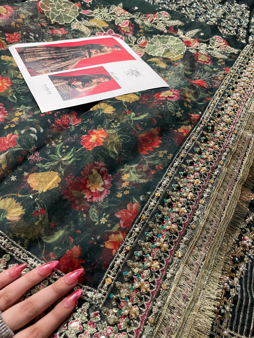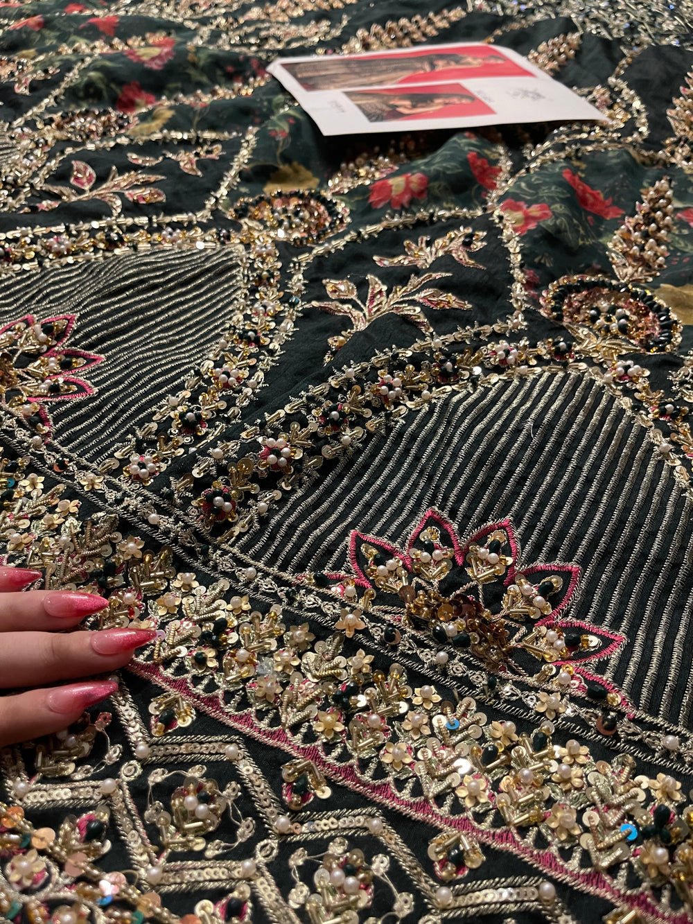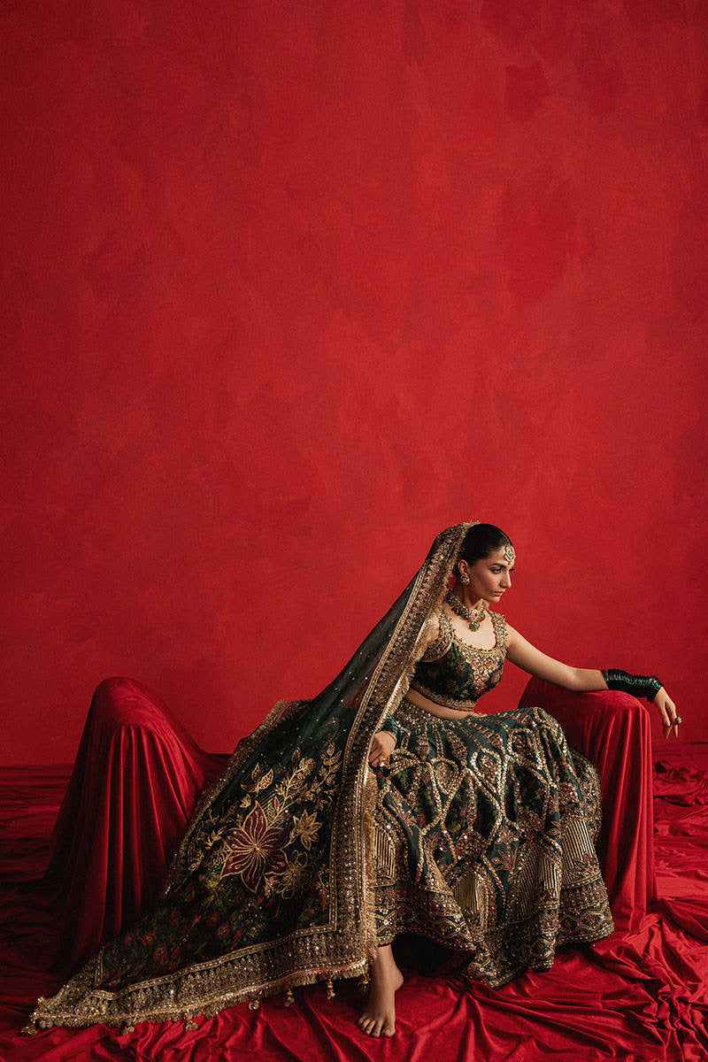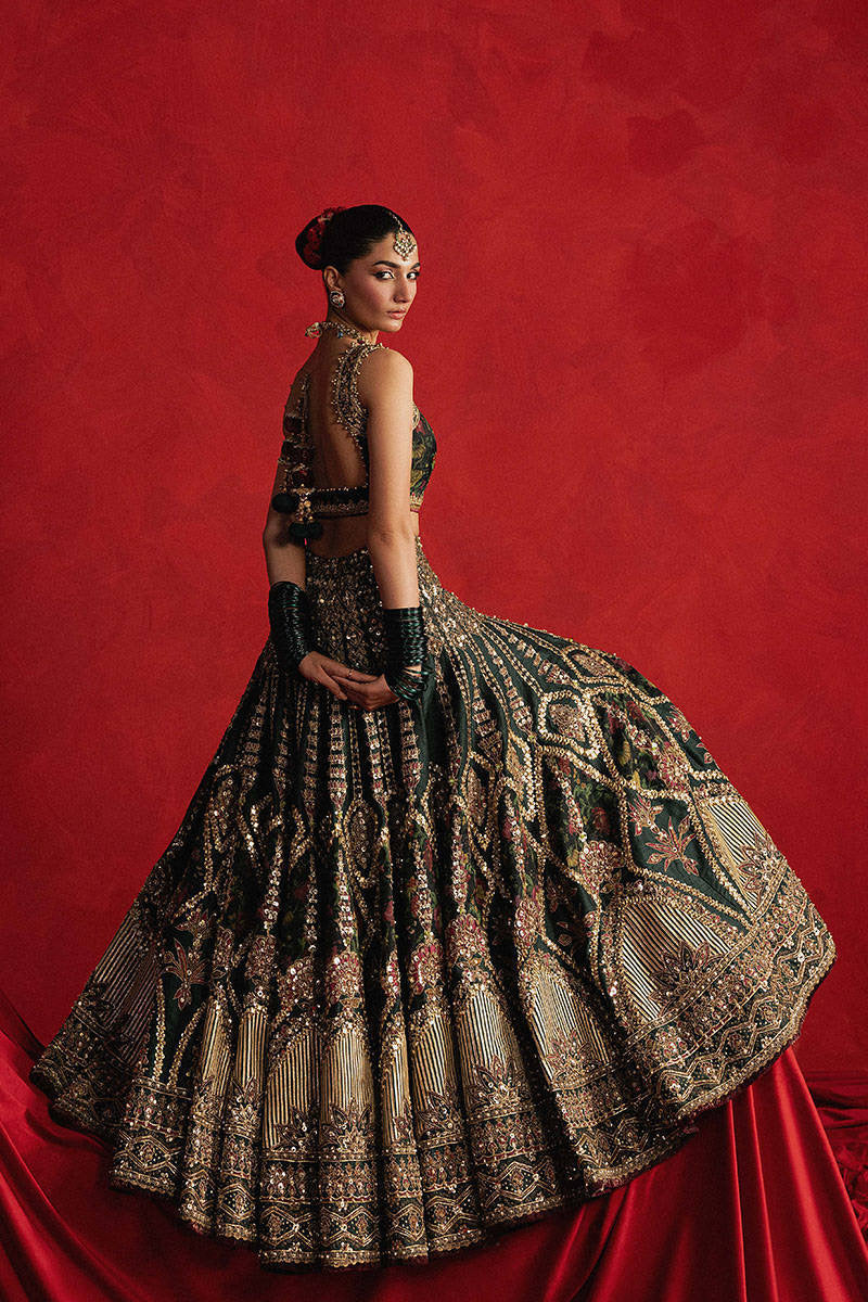A regal creation that captures the essence of timeless grandeur. This exquisite lehenga is adorned with intricate embroidery, delicate floral detailing, and opulent embellishments that glisten with every movement. The deep hues, paired with rich gold accents, evoke an aura of royal sophistication — perfect for a bride or festive soirée. A masterpiece that celebrates heritage craftsmanship with a modern, enchanting charm.