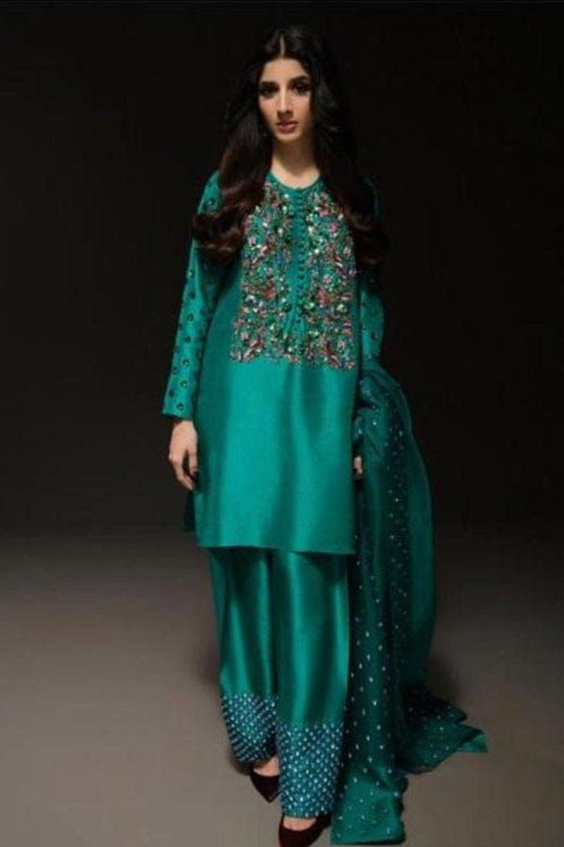 This luxury unstitched 3-piece suit by Muse in sea green highlights intricate hand-embroidery and delicate embellishments. The fabric offers endless possibilities for tailoring, paired with a beautifully detailed dupatta. Perfect for creating a refined, custom look for special occasions.