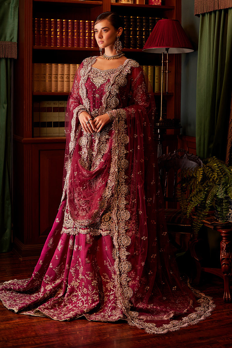 Discover Elysia, a bridal outfit that captures the spirit of nature's beauty. The shirt is embellished with intricate motifs, handcrafted from delicate beadwork, sequins and naqshi detailing. The ensemble is adorned with cascading vines and blooming flowers thus creating a sense of enchantment and grace. Elysia a perfect choice for the bride who wants to embrace her love for nature on her special day.