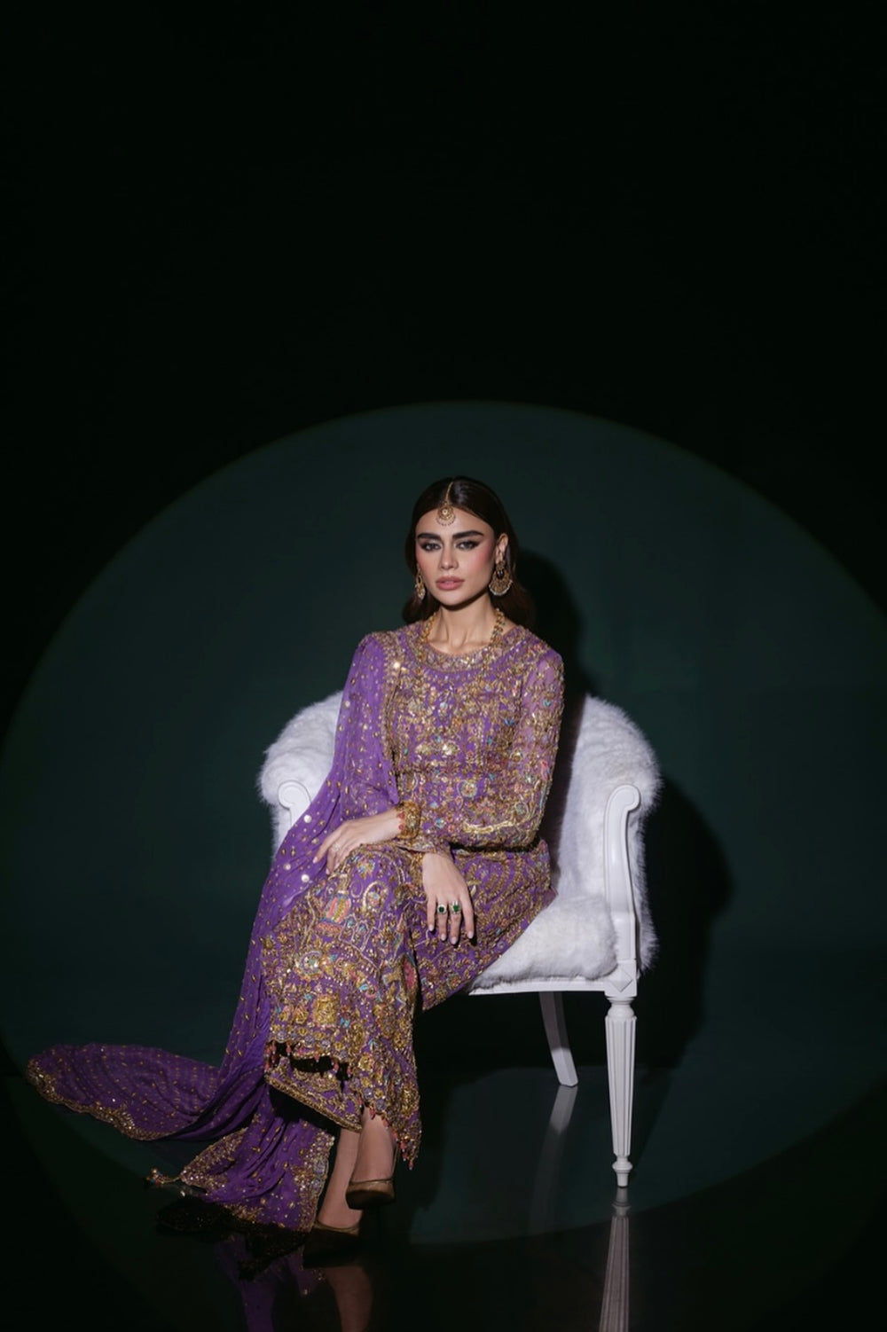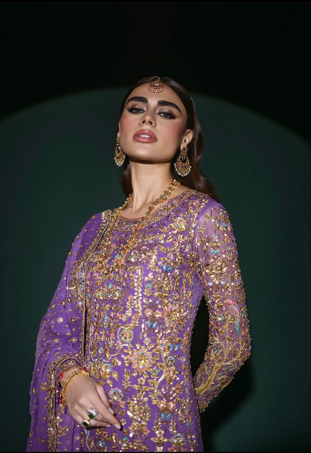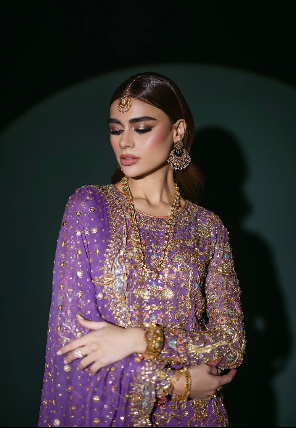 A striking creation by Nomi Ansari, this deep purple ensemble radiates opulence and grandeur. The outfit is richly adorned with intricate detailing in gold, accented by hints of vibrant colors that add depth and character to the look. Paired with a complementing dupatta that adds an effortless touch of elegance, this look is perfect for festive occasions, capturing the essence of timeless style with a bold, royal touch.