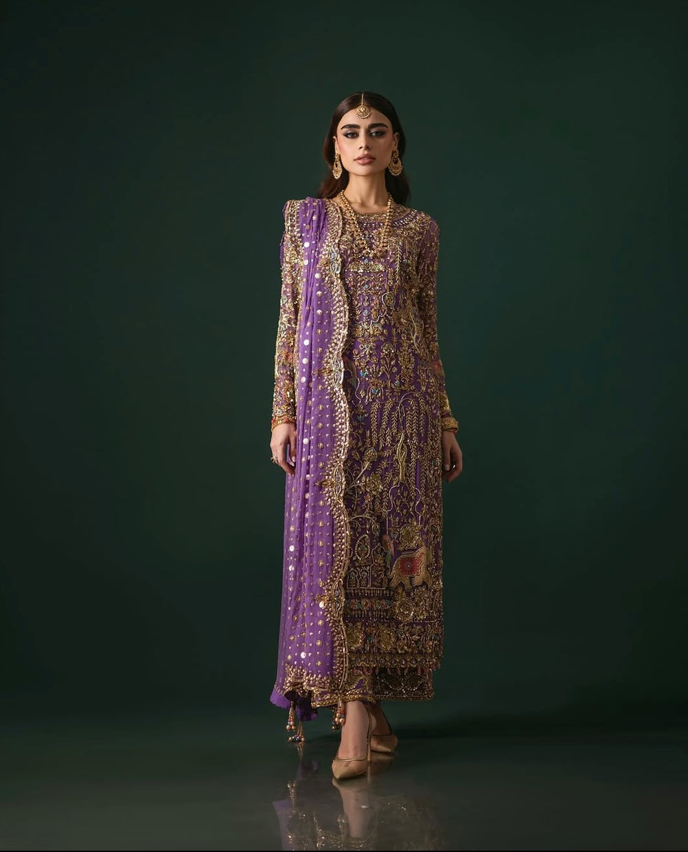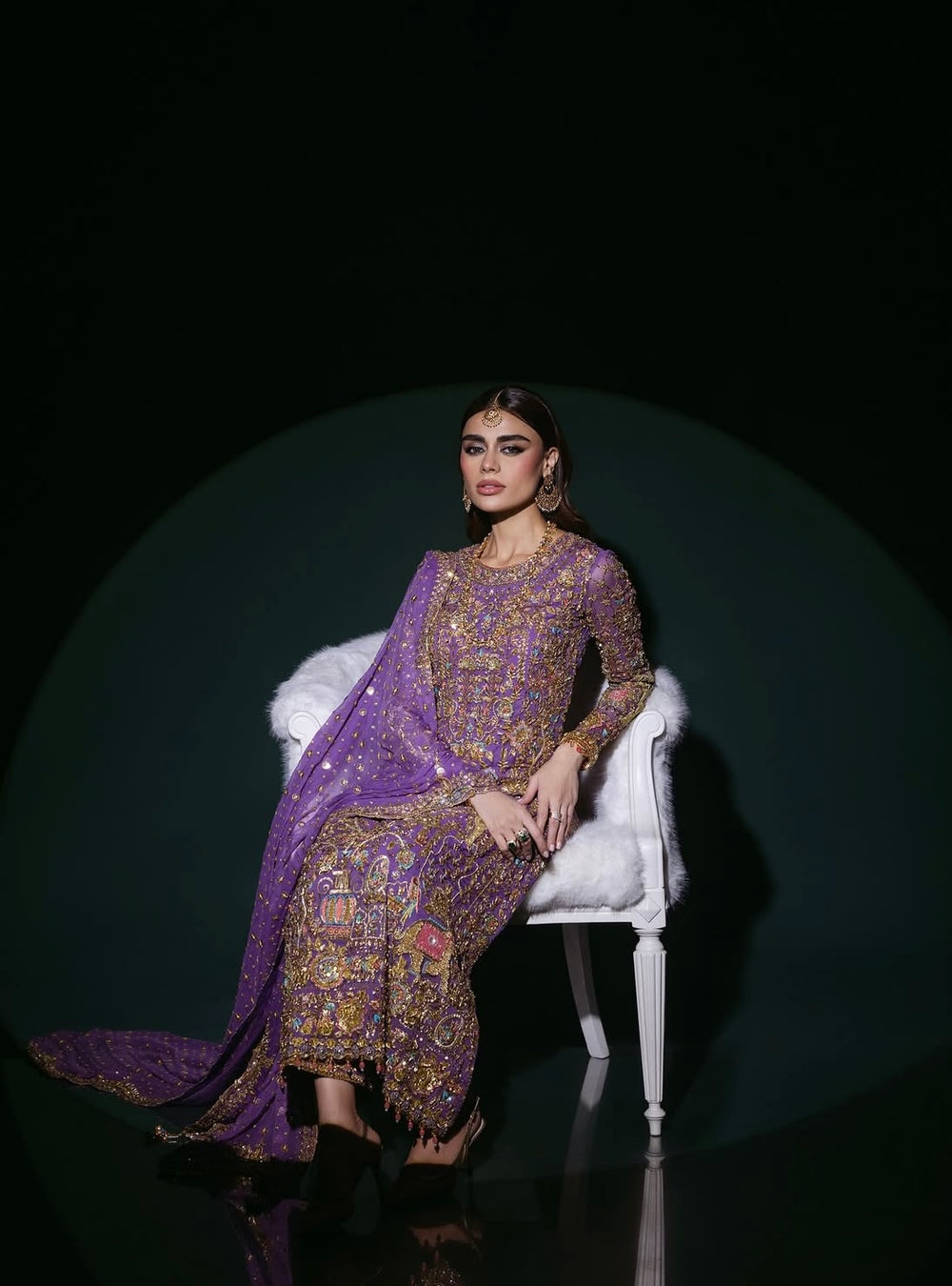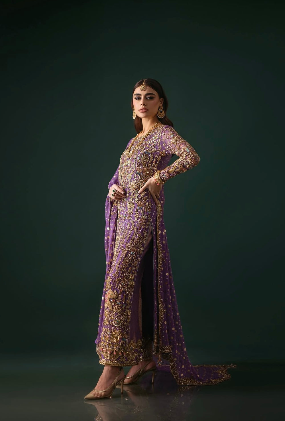 A striking creation by Nomi Ansari, this deep purple ensemble radiates opulence and grandeur. The outfit is richly adorned with intricate detailing in gold, accented by hints of vibrant colors that add depth and character to the look. Paired with a complementing dupatta that adds an effortless touch of elegance, this look is perfect for festive occasions, capturing the essence of timeless style with a bold, royal touch.