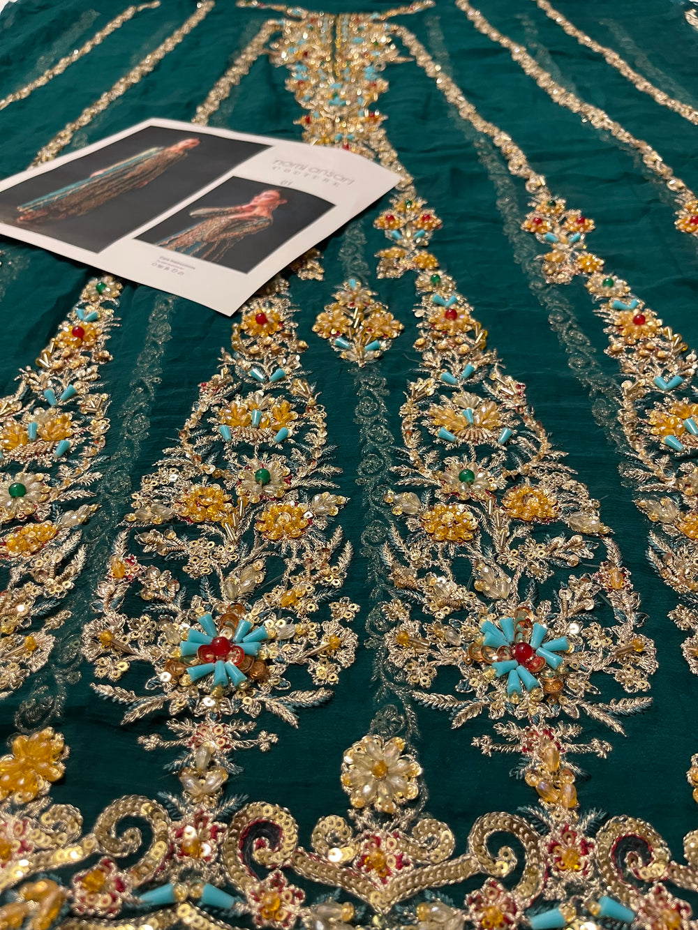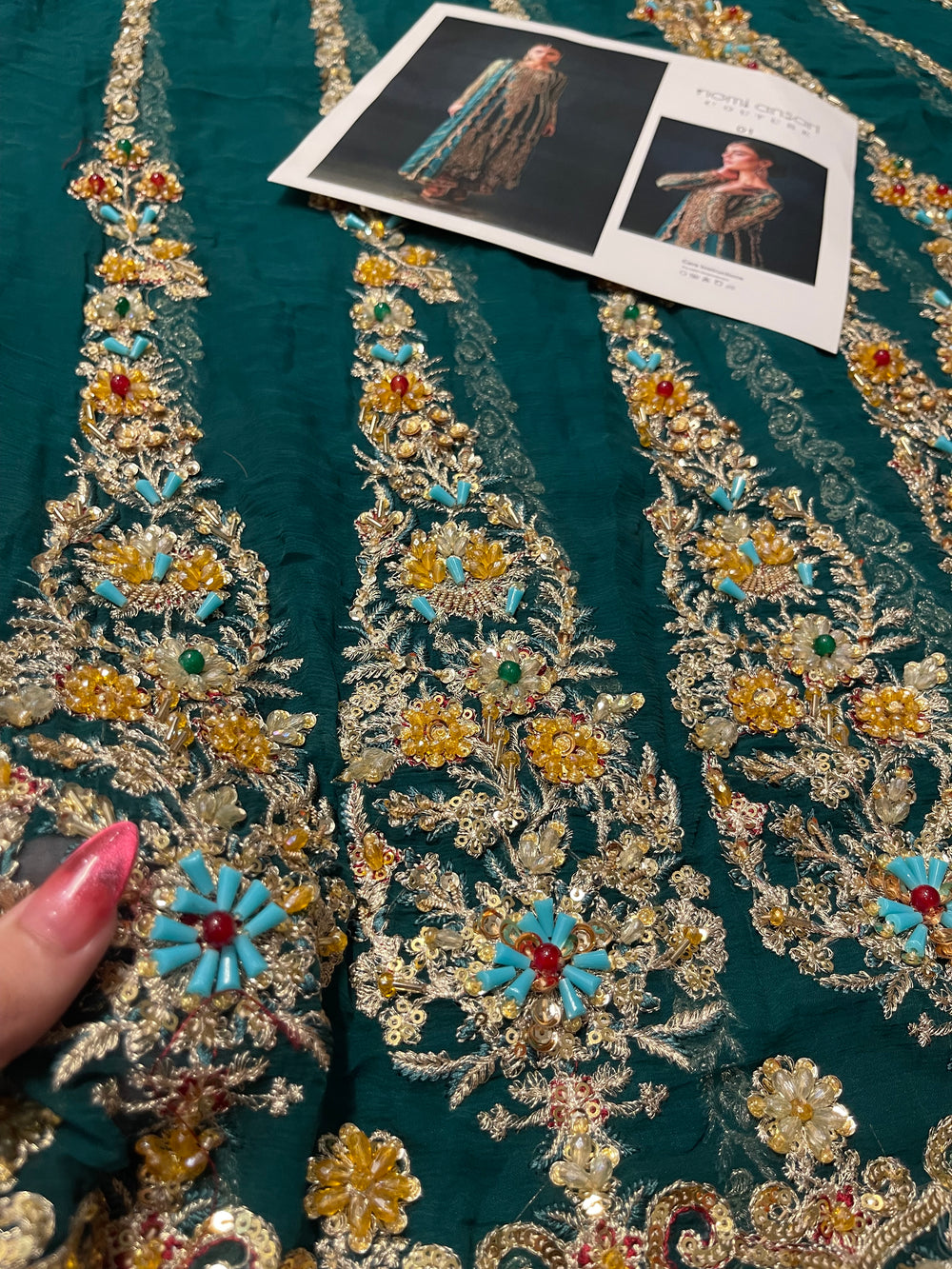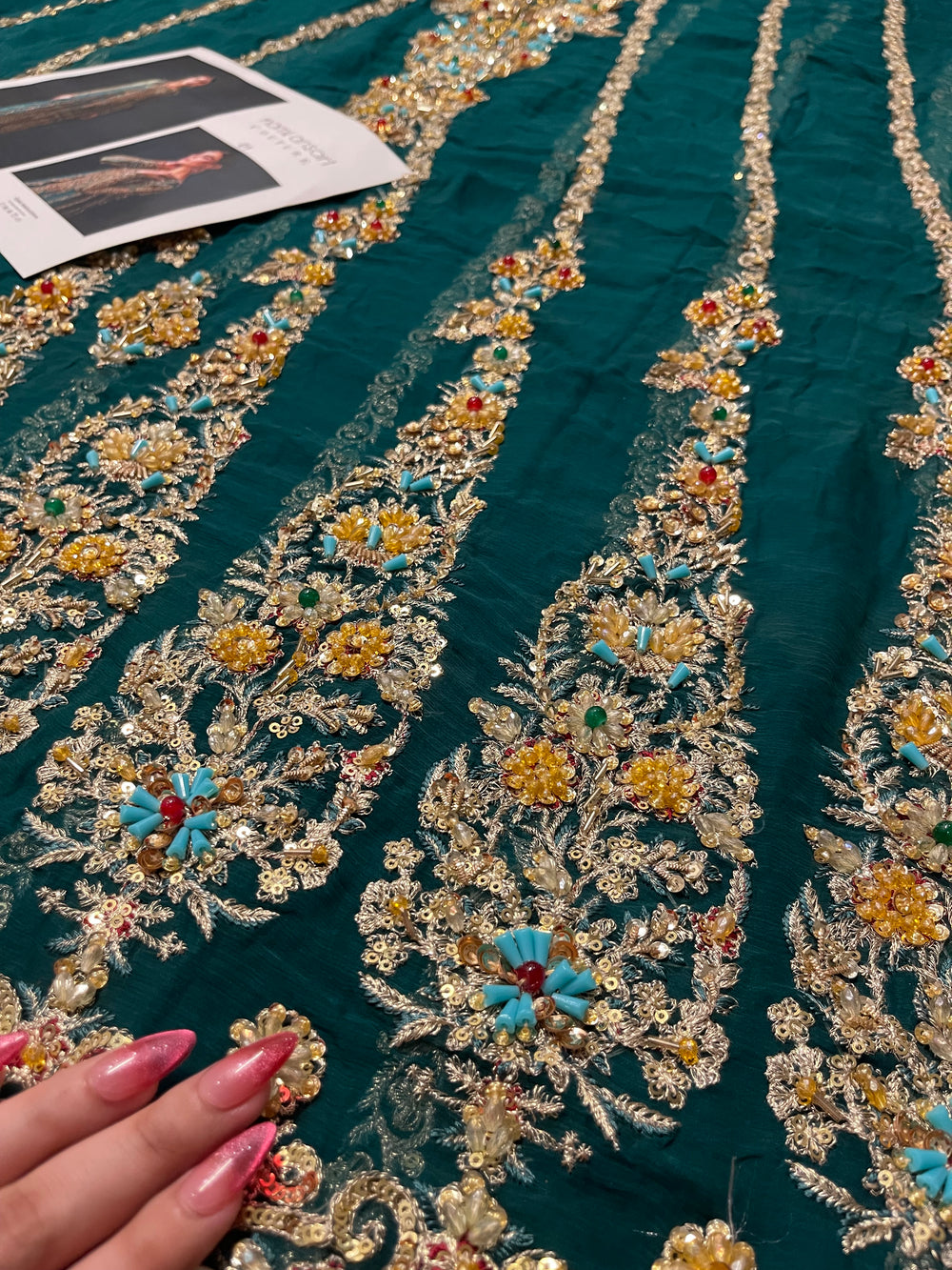 An ethereal creation featuring delicate handwork and ornate detailing, this ensemble is crafted with flowing elegance and timeless charm. The intricate embellishments enhance its regal silhouette, while the sheer drape adds a graceful touch, making it perfect for grand occasions.