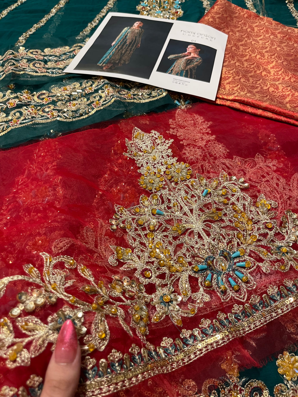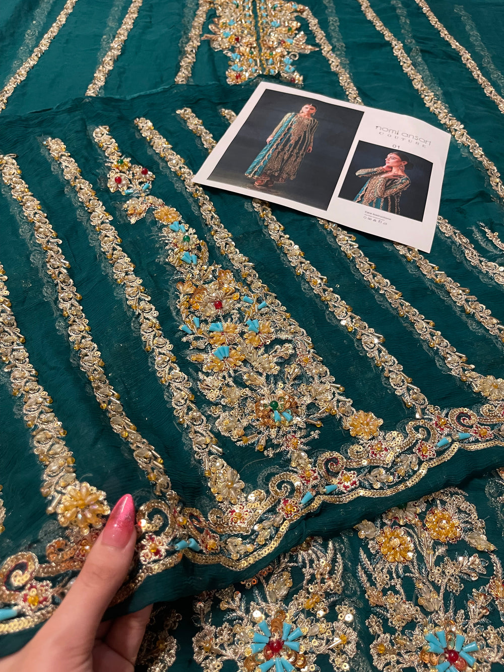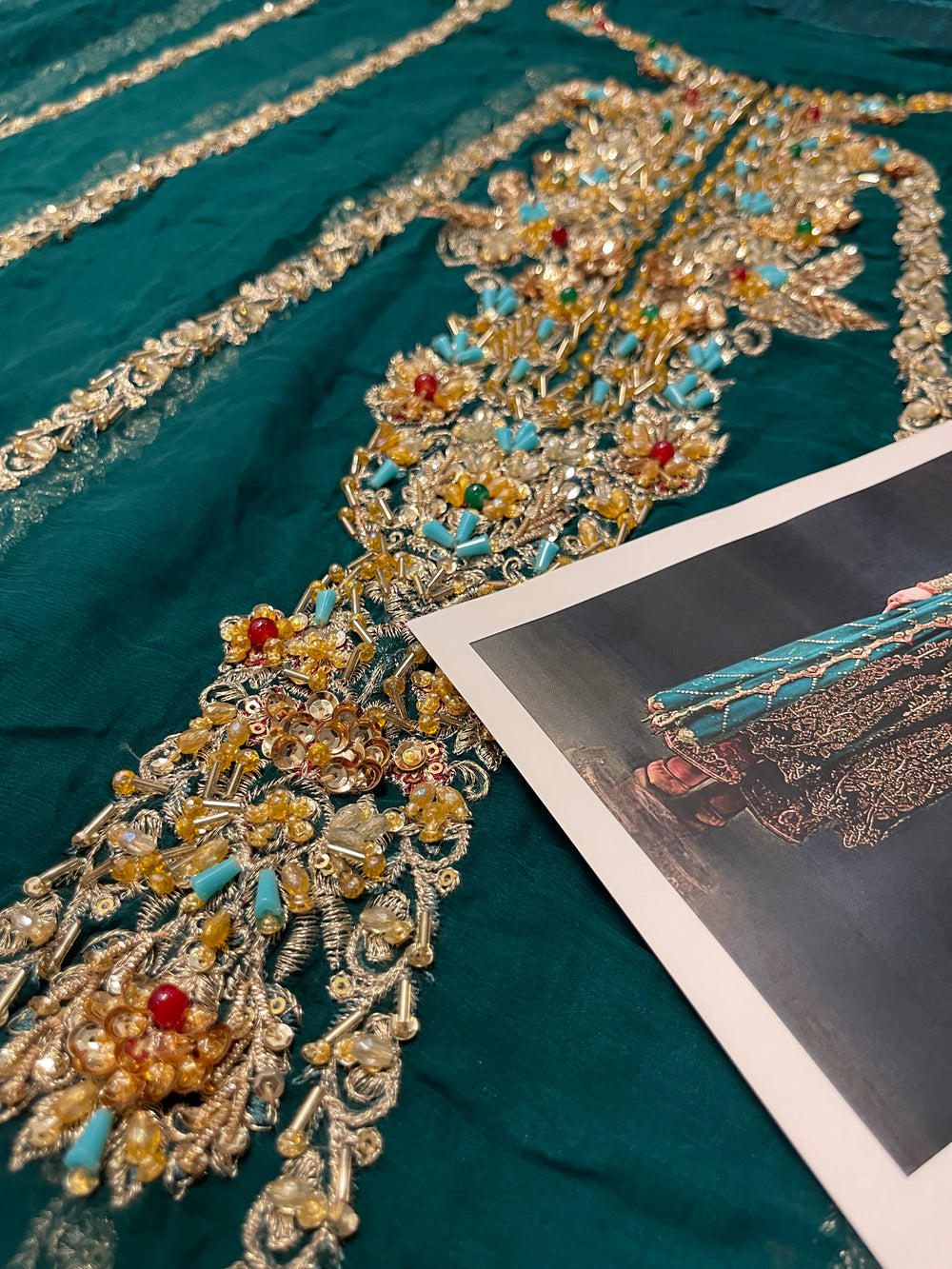 An ethereal creation featuring delicate handwork and ornate detailing, this ensemble is crafted with flowing elegance and timeless charm. The intricate embellishments enhance its regal silhouette, while the sheer drape adds a graceful touch, making it perfect for grand occasions.