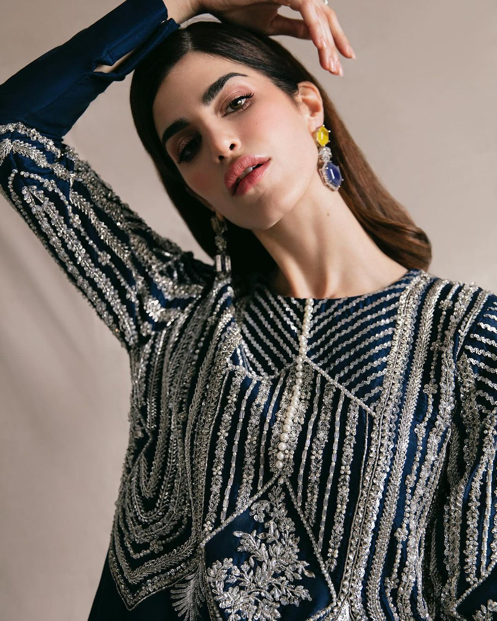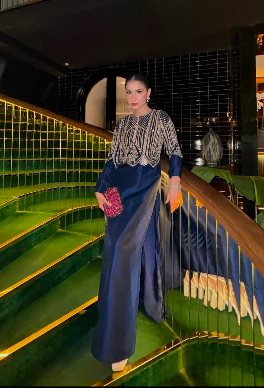 Embrace the essence of your impeccable taste and unwavering sense of style in our navy blue ensemble. In the rich hue of navy blue, this outfit effortlessly captures the essence of refined allure. The floor-length straight shirt is tailored to perfection in the finest raw silk fabric and is meticulously adorned with silver hand embellishments on the bodice and sleeves, optimising timeless elegance and artistry. Harmoniously paired with silk cigarette pants, this creation is a masterpiece that transcends boundaries.
