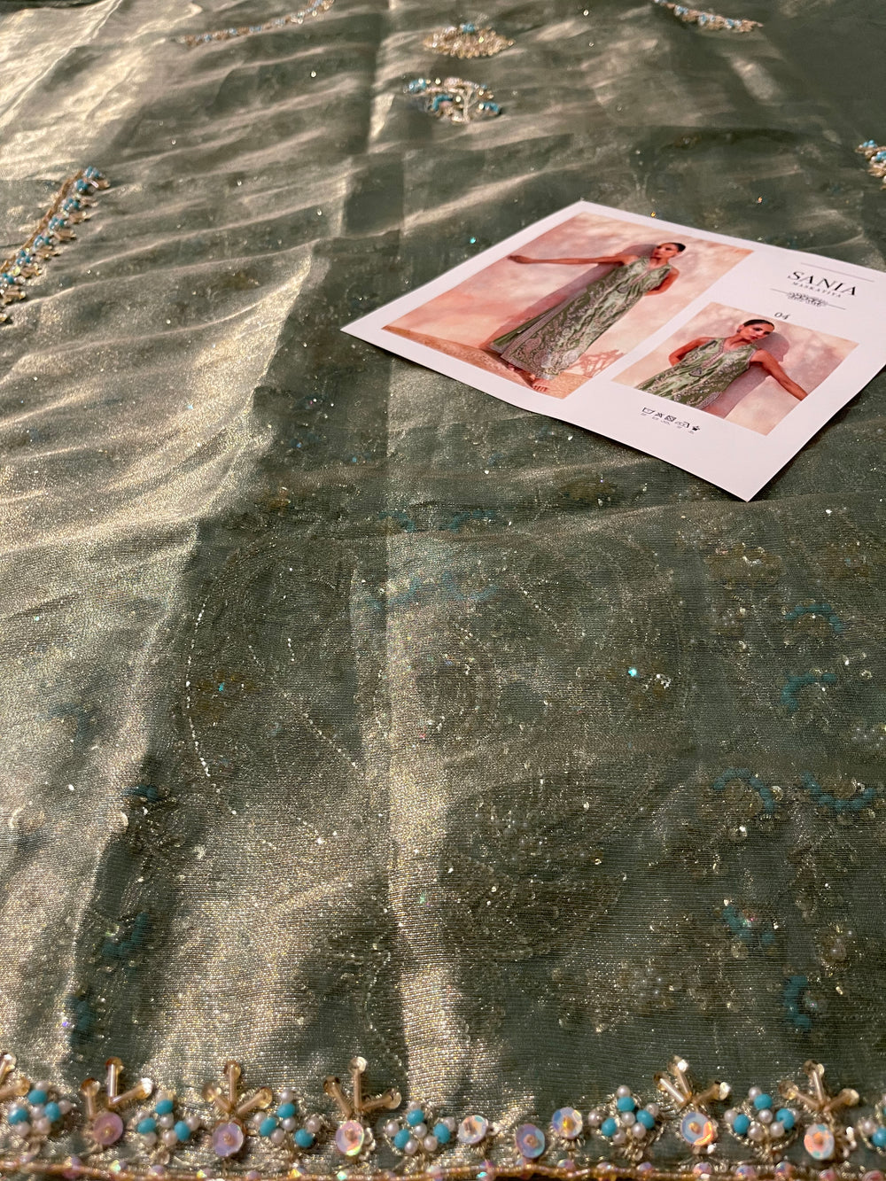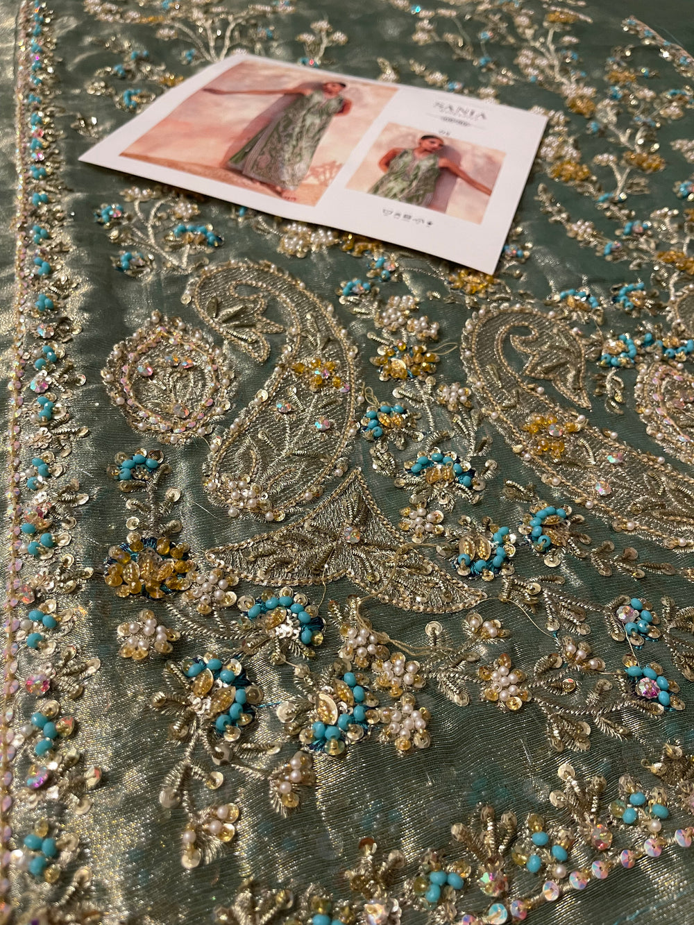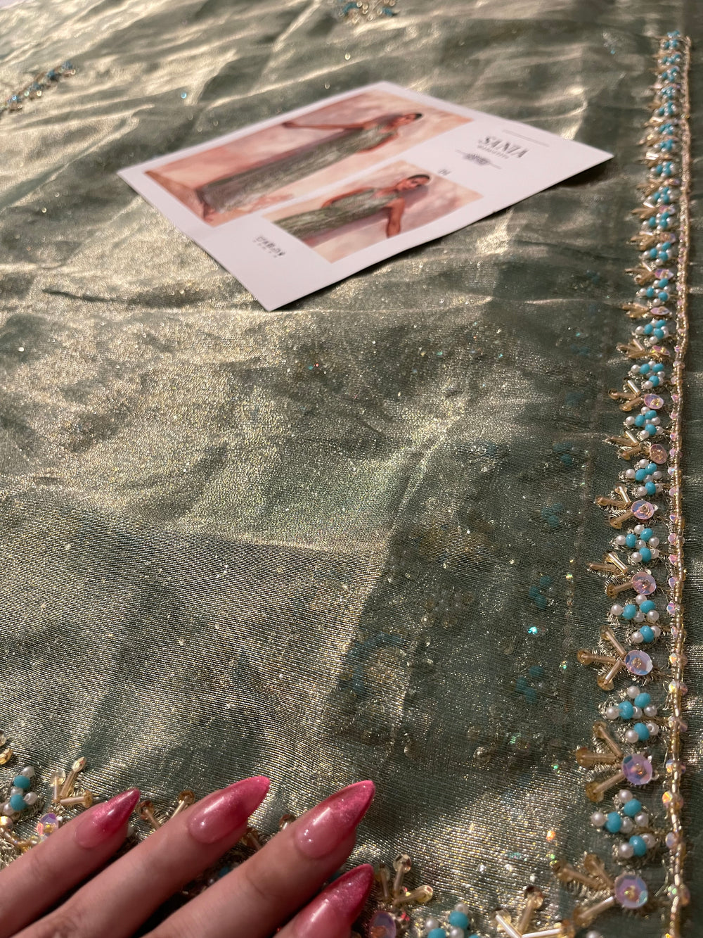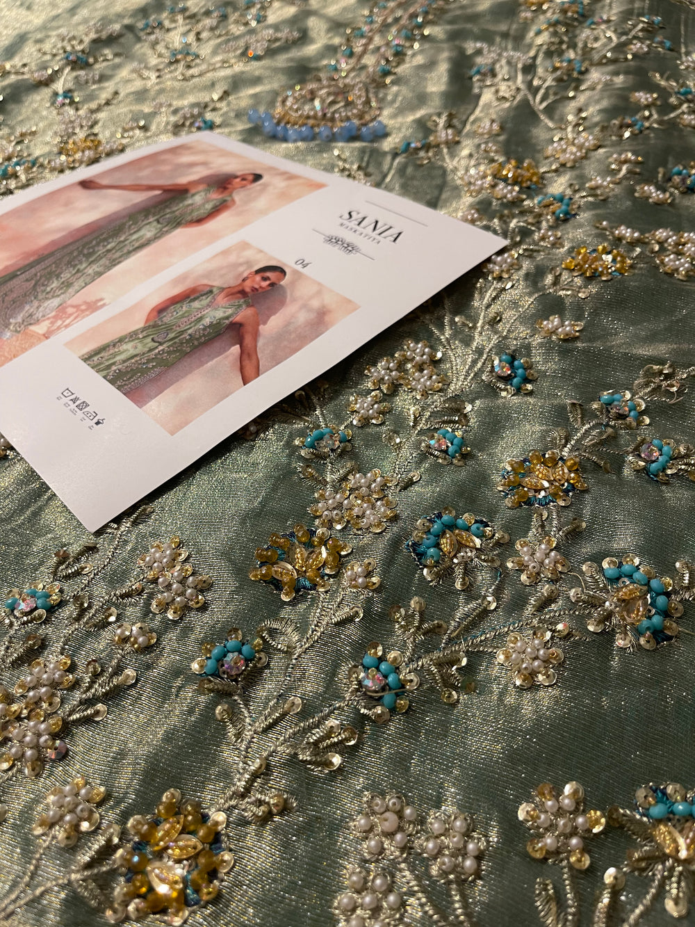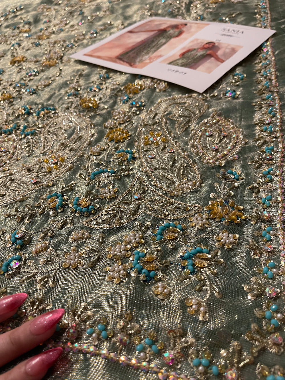 An inspired take on Sania Maskatiya’s classic Yusra ensemble, beautifully reimagined in a soothing pistachio tone. The gentle color brings a refreshing charm, while the refined silhouette and delicate detailing exude understated elegance. A graceful blend of tradition and modern flair, crafted for those who appreciate subtle sophistication.