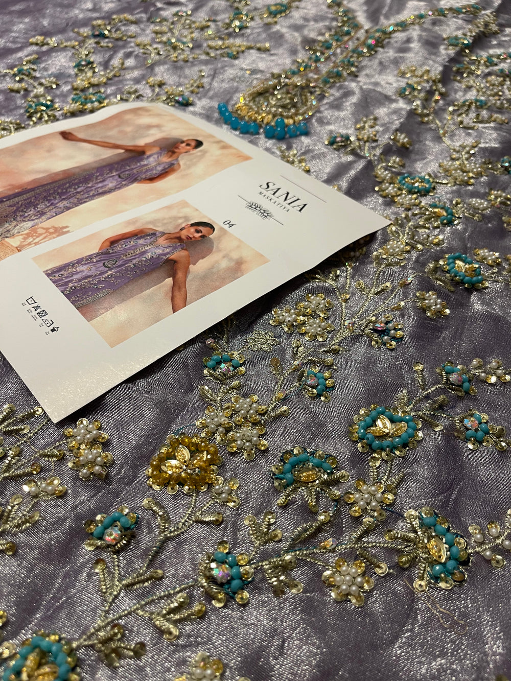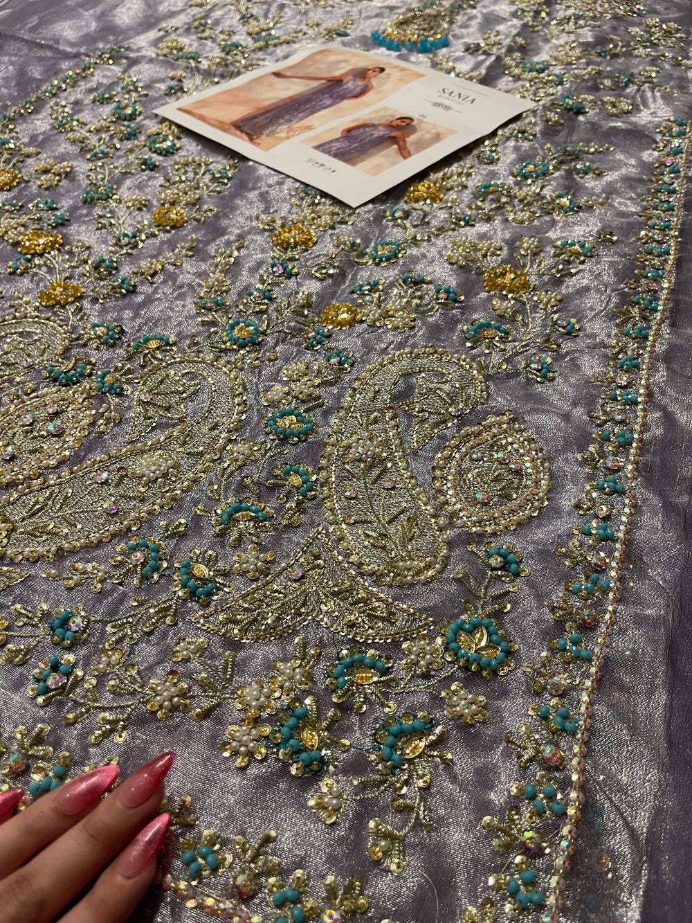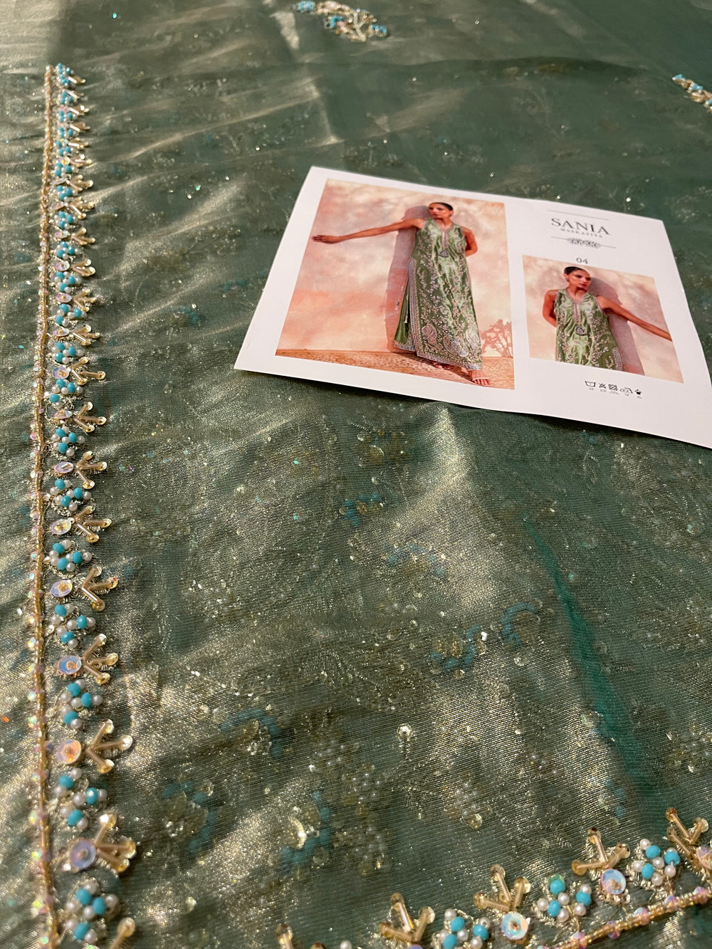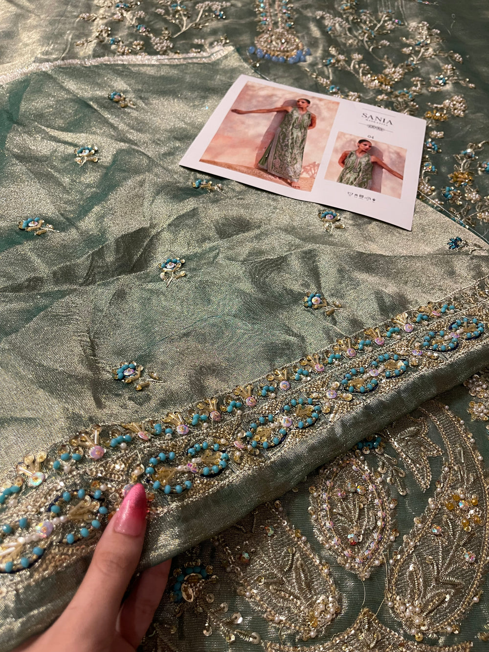 An inspired take on Sania Maskatiya’s classic Yusra ensemble, beautifully reimagined in a soothing pistachio tone. The gentle color brings a refreshing charm, while the refined silhouette and delicate detailing exude understated elegance. A graceful blend of tradition and modern flair, crafted for those who appreciate subtle sophistication.