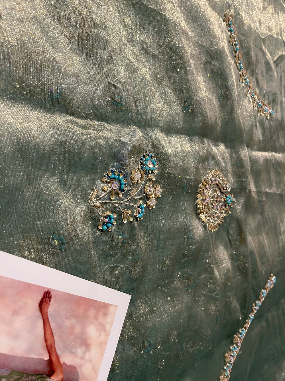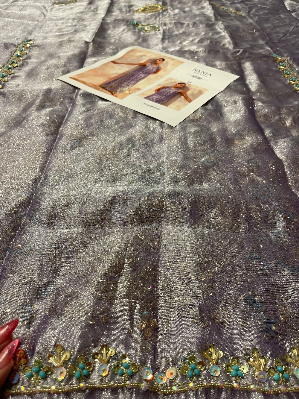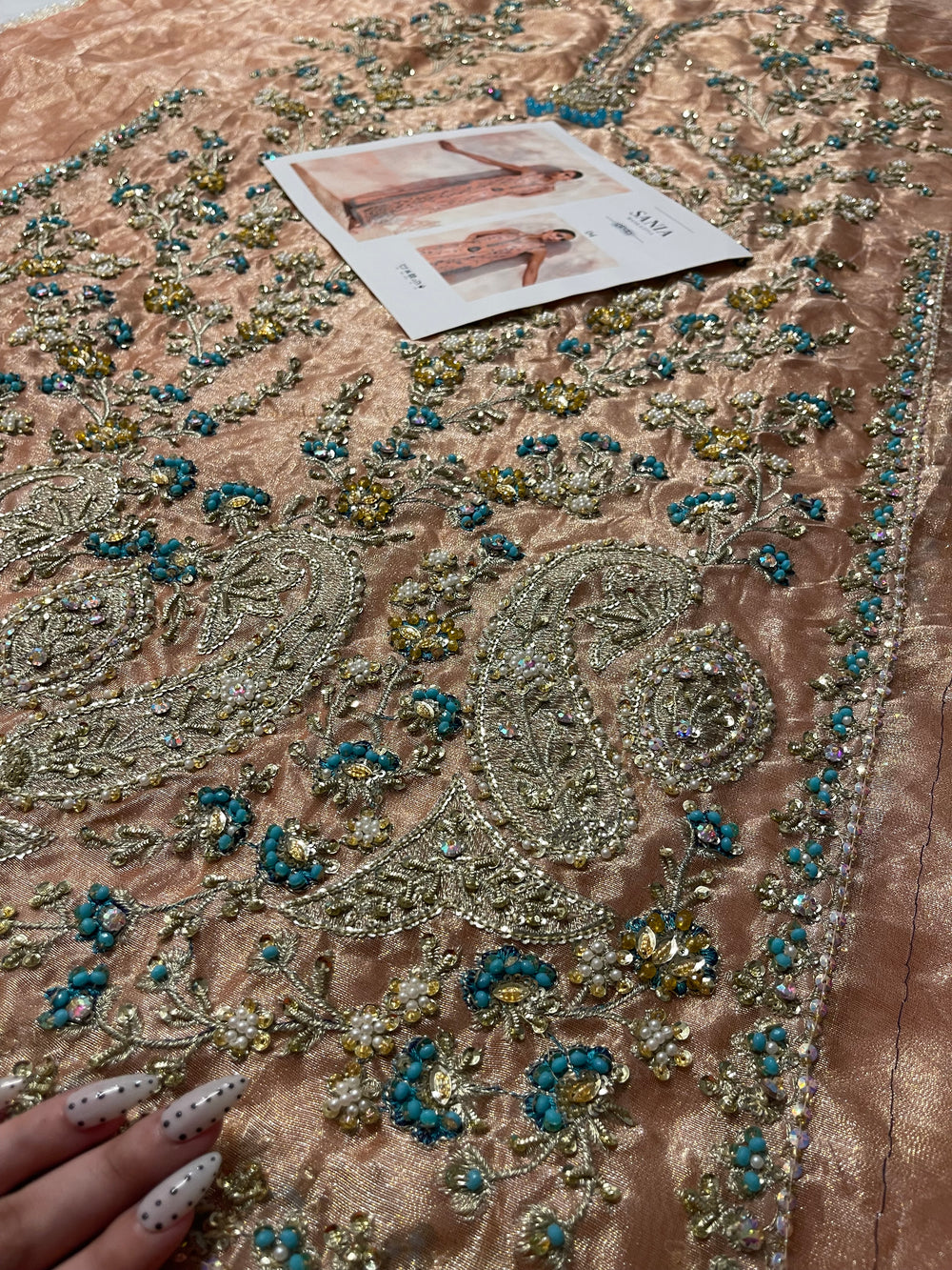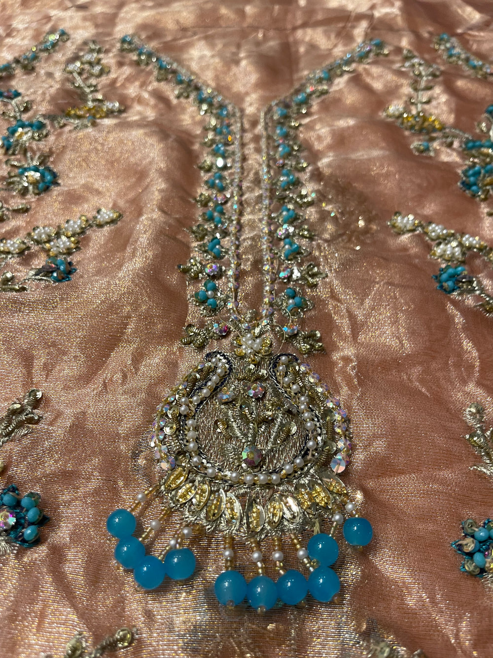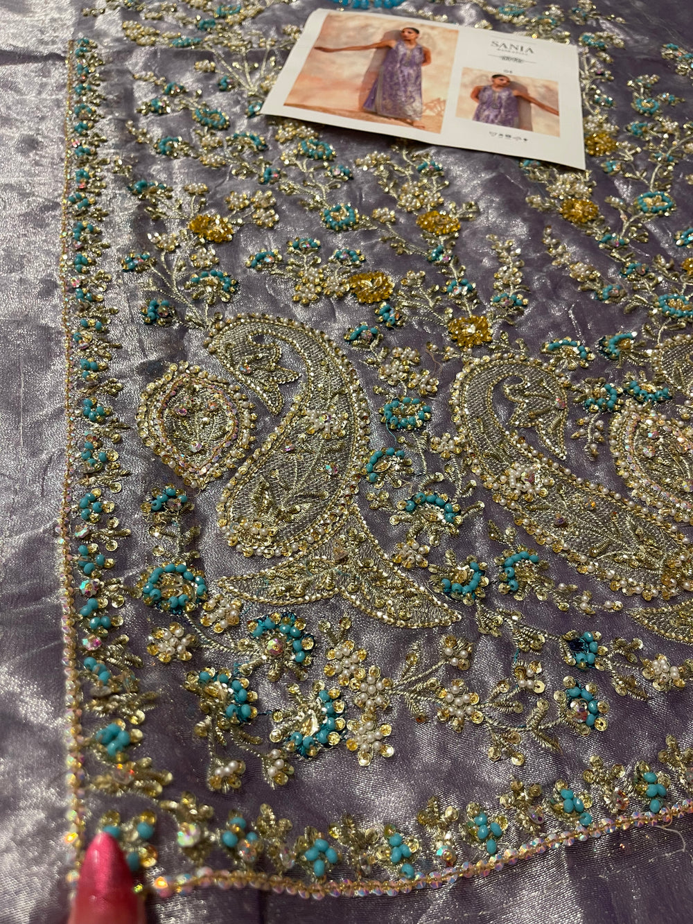 An inspired take on Sania Maskatiya’s classic Yusra ensemble, beautifully reimagined in a soothing pistachio tone. The gentle color brings a refreshing charm, while the refined silhouette and delicate detailing exude understated elegance. A graceful blend of tradition and modern flair, crafted for those who appreciate subtle sophistication.