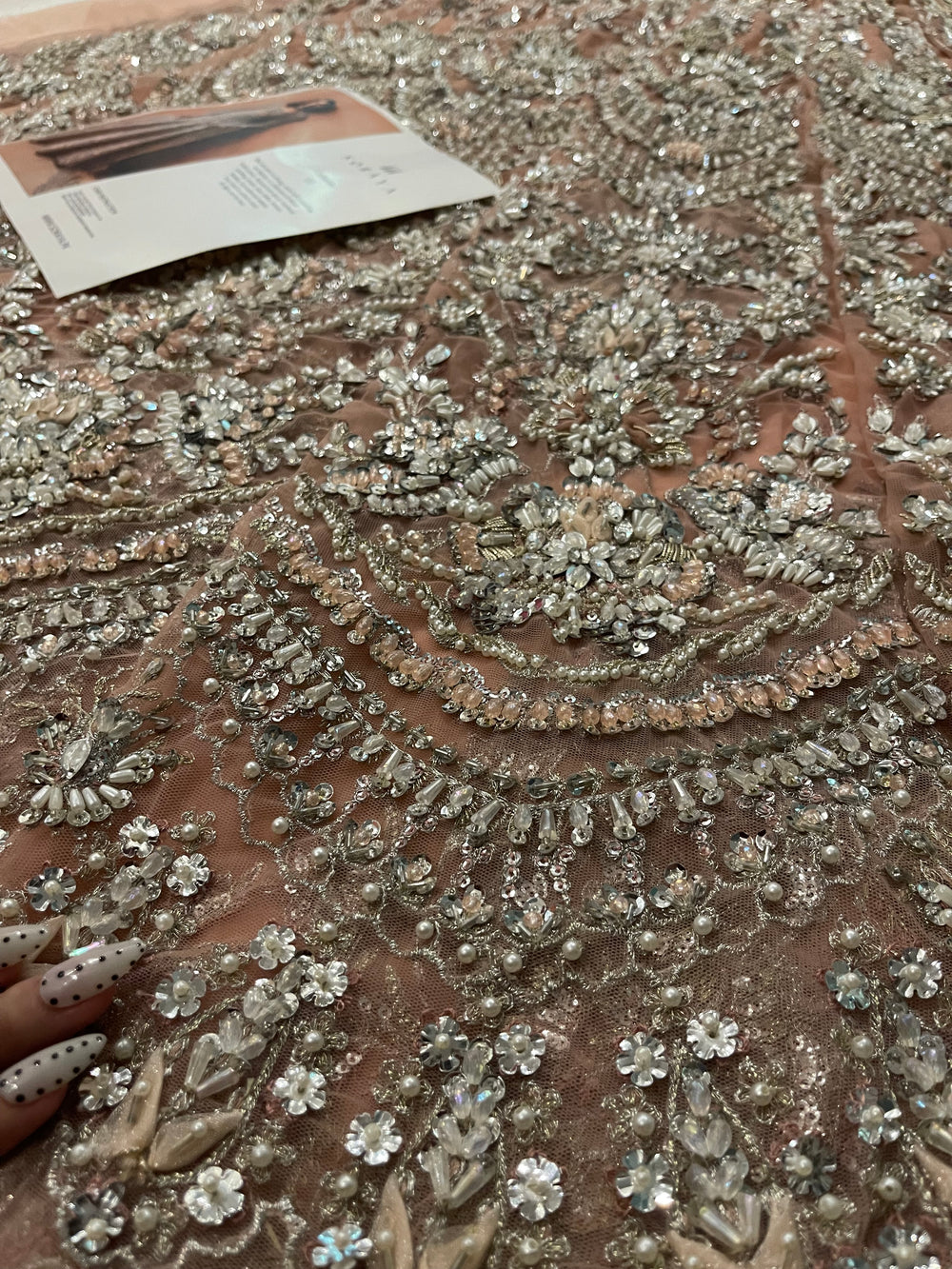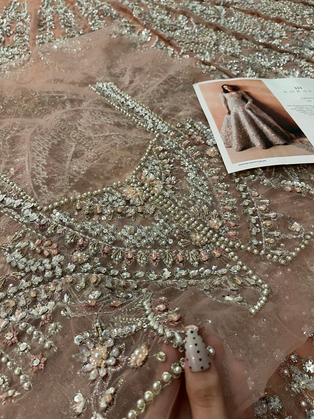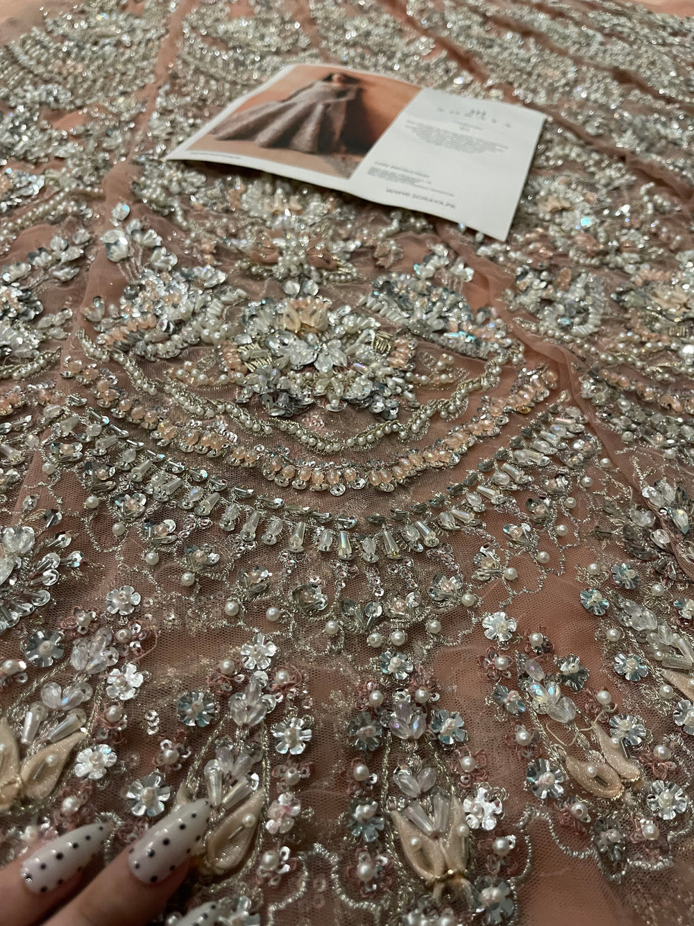 The Catherine ensemble whispers of timeless elegance — a delicate play of intricate handwork, luminous embellishments, and a silhouette that feels both regal and modern. With its soft champagne hues catching the light at every turn, it carries the charm of old-world romance while holding a statement of strength and grace. It’s the kind of look that doesn’t just enter a room — it lingers long after.
