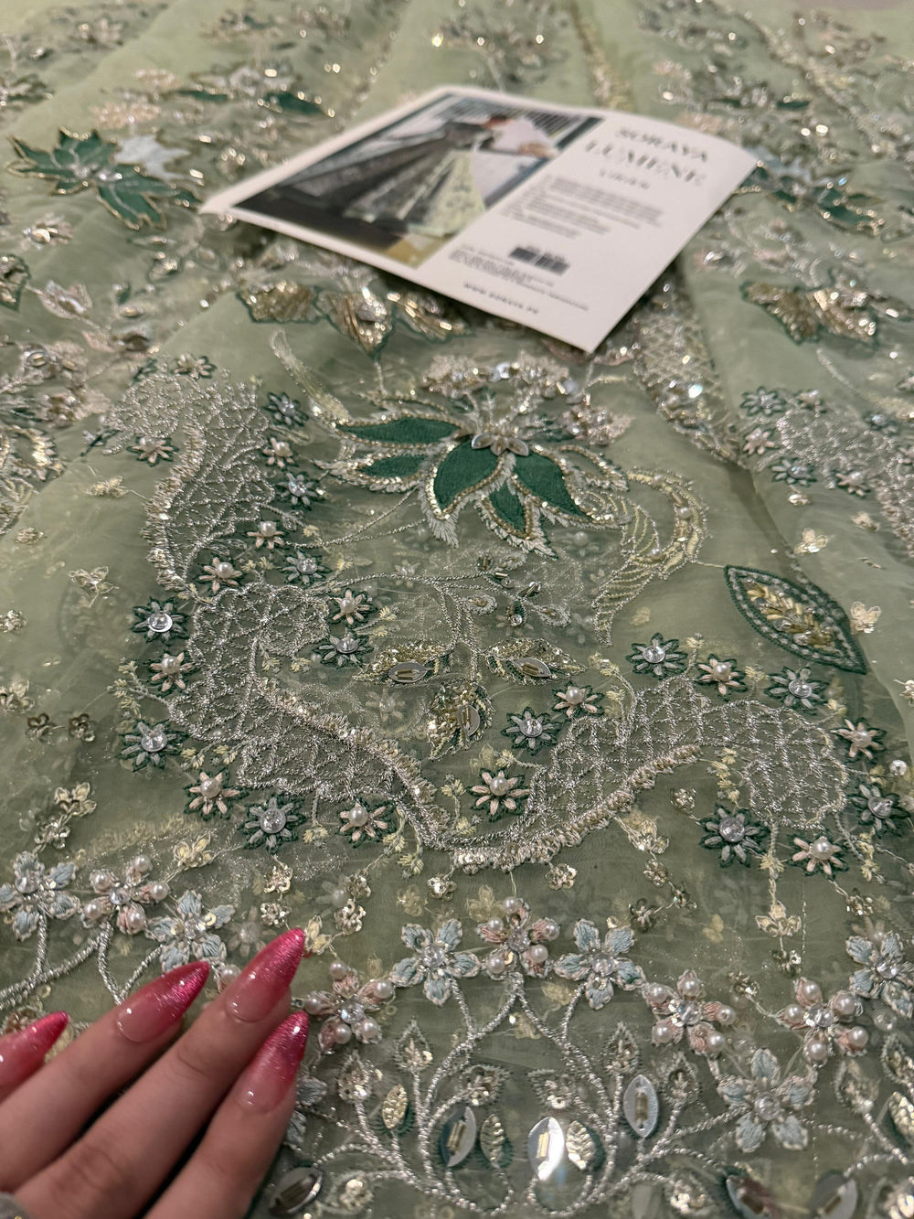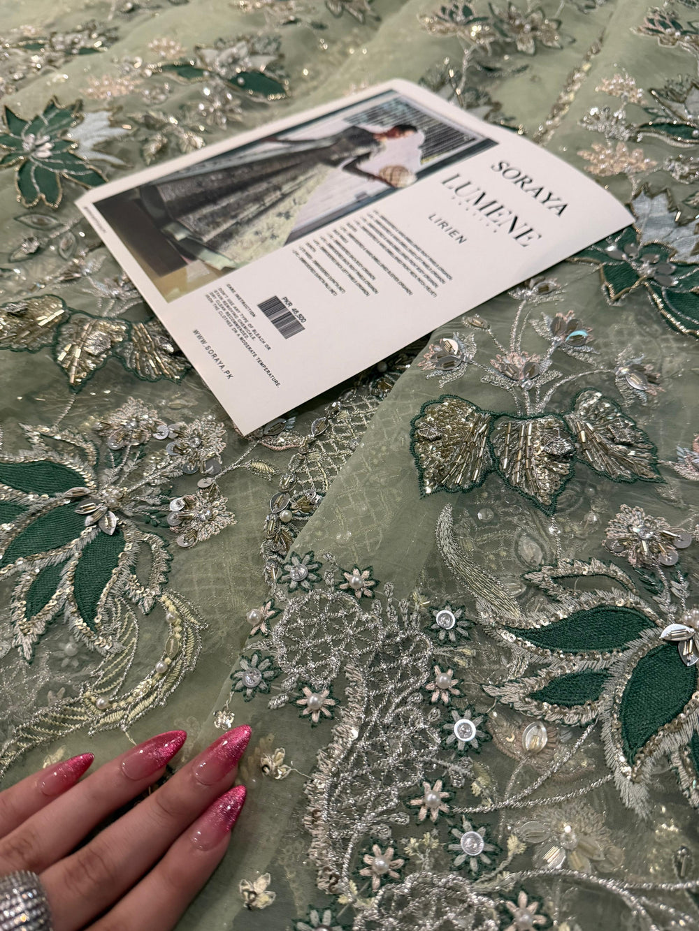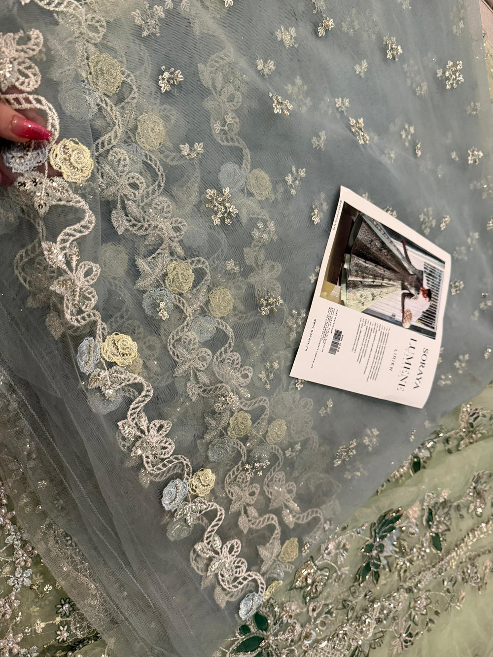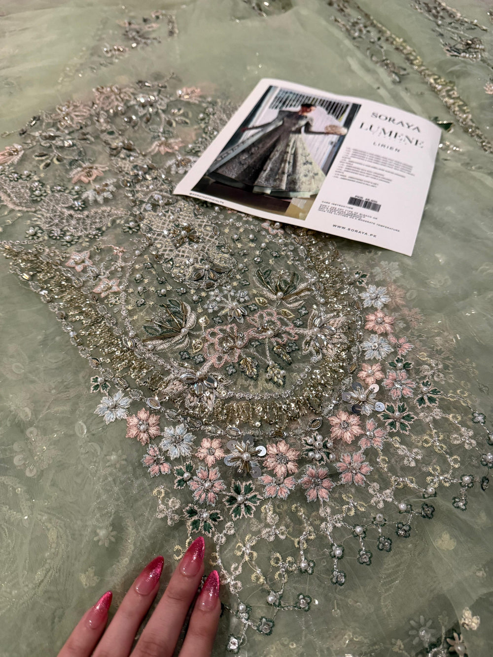 Introducing our Soraya – Lirien Inspired Couture Pishwas, a vision of dreamy elegance crafted for the woman who embraces grace and grandeur. Rendered in a soft sage-mint palette, the pishwas is adorned with intricate floral handwork, shimmering sequins, cut dana, and tilla thread detailing that create a breathtaking tapestry across the flare.The delicately embellished bodice features signature velvet - organza combo which adds a modern touch to this otherwise regal silhouette. A gossamer-light dupatta with embroidered sprays and a refined border completes the ensemble, creating an ethereal, floating effect with every step.