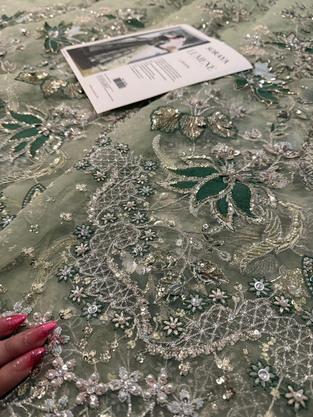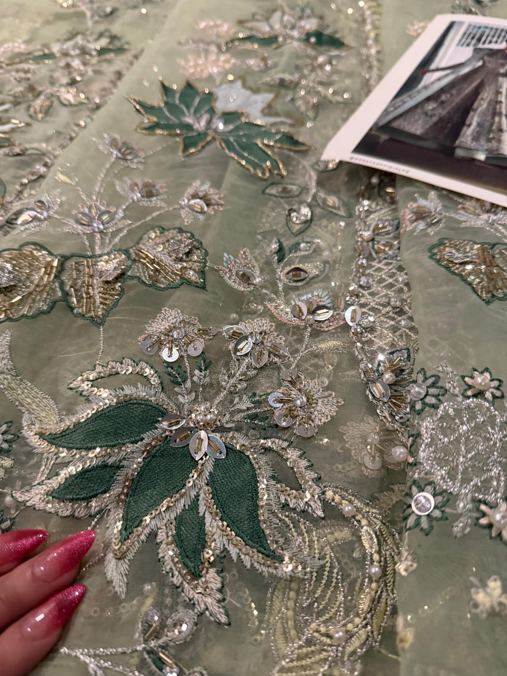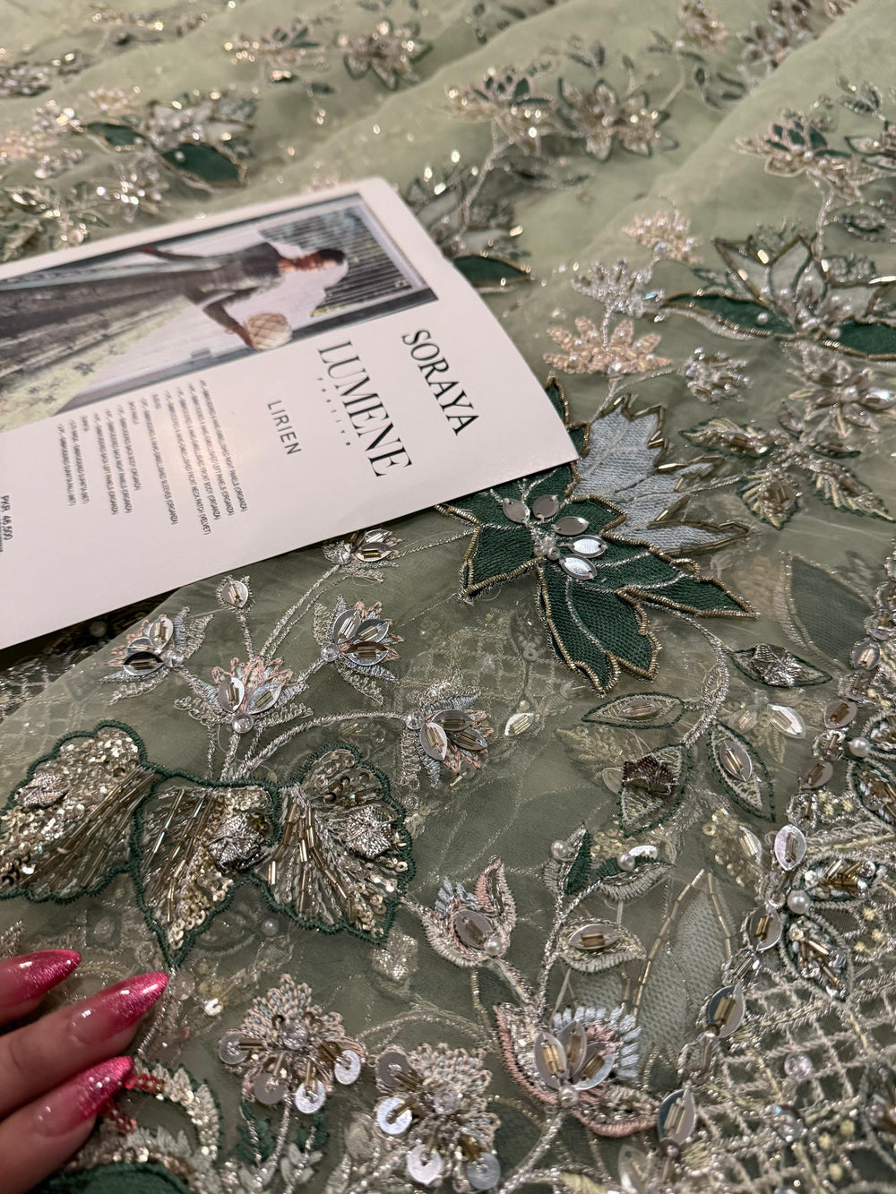 Introducing our Soraya – Lirien Inspired Couture Pishwas, a vision of dreamy elegance crafted for the woman who embraces grace and grandeur. Rendered in a soft sage-mint palette, the pishwas is adorned with intricate floral handwork, shimmering sequins, cut dana, and tilla thread detailing that create a breathtaking tapestry across the flare.The delicately embellished bodice features signature velvet - organza combo which adds a modern touch to this otherwise regal silhouette. A gossamer-light dupatta with embroidered sprays and a refined border completes the ensemble, creating an ethereal, floating effect with every step.