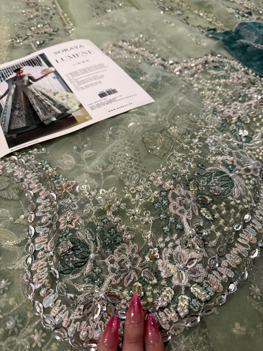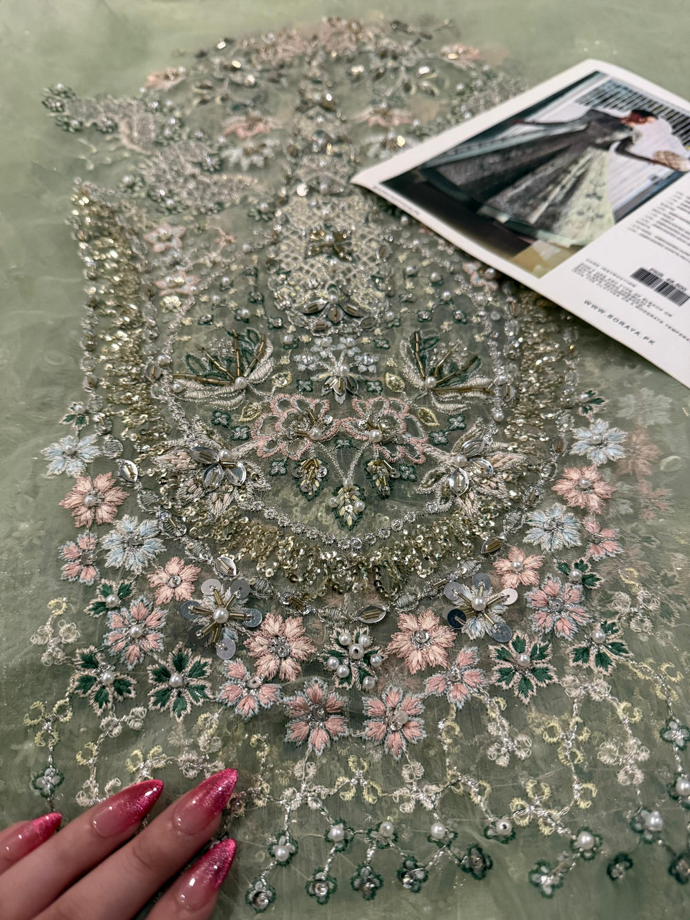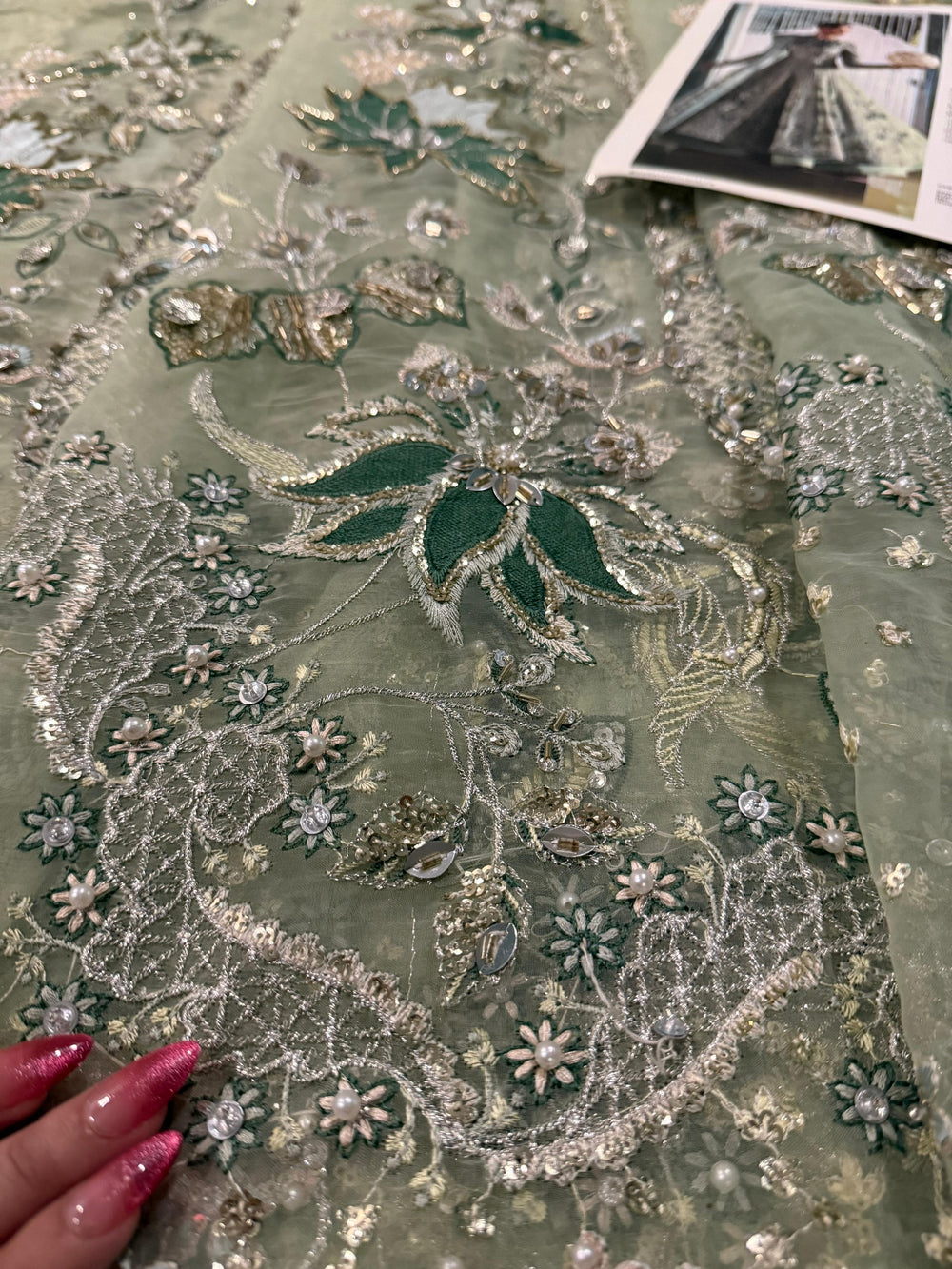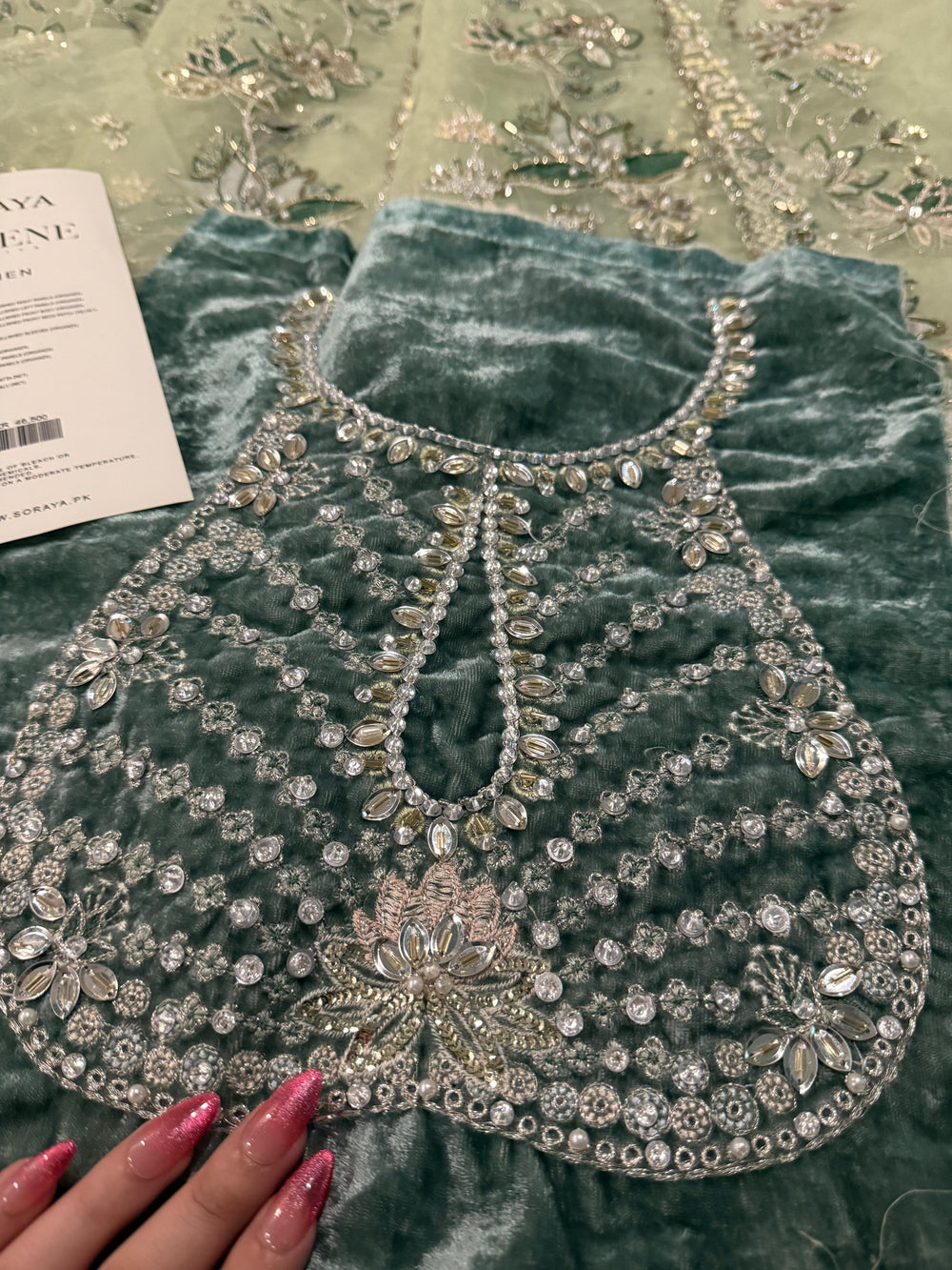 Introducing our Soraya – Lirien Inspired Couture Pishwas, a vision of dreamy elegance crafted for the woman who embraces grace and grandeur. Rendered in a soft sage-mint palette, the pishwas is adorned with intricate floral handwork, shimmering sequins, cut dana, and tilla thread detailing that create a breathtaking tapestry across the flare.The delicately embellished bodice features signature velvet - organza combo which adds a modern touch to this otherwise regal silhouette. A gossamer-light dupatta with embroidered sprays and a refined border completes the ensemble, creating an ethereal, floating effect with every step.