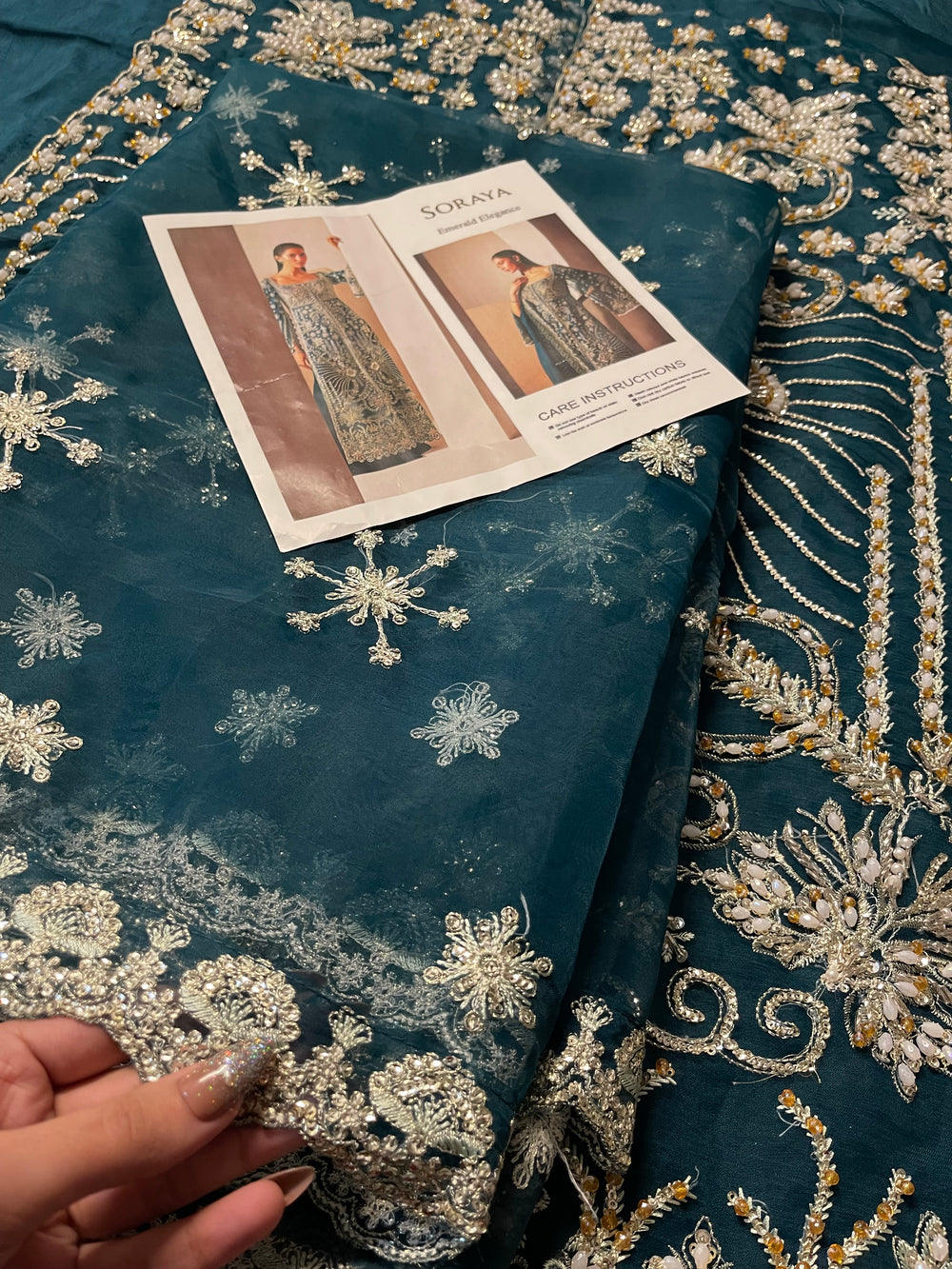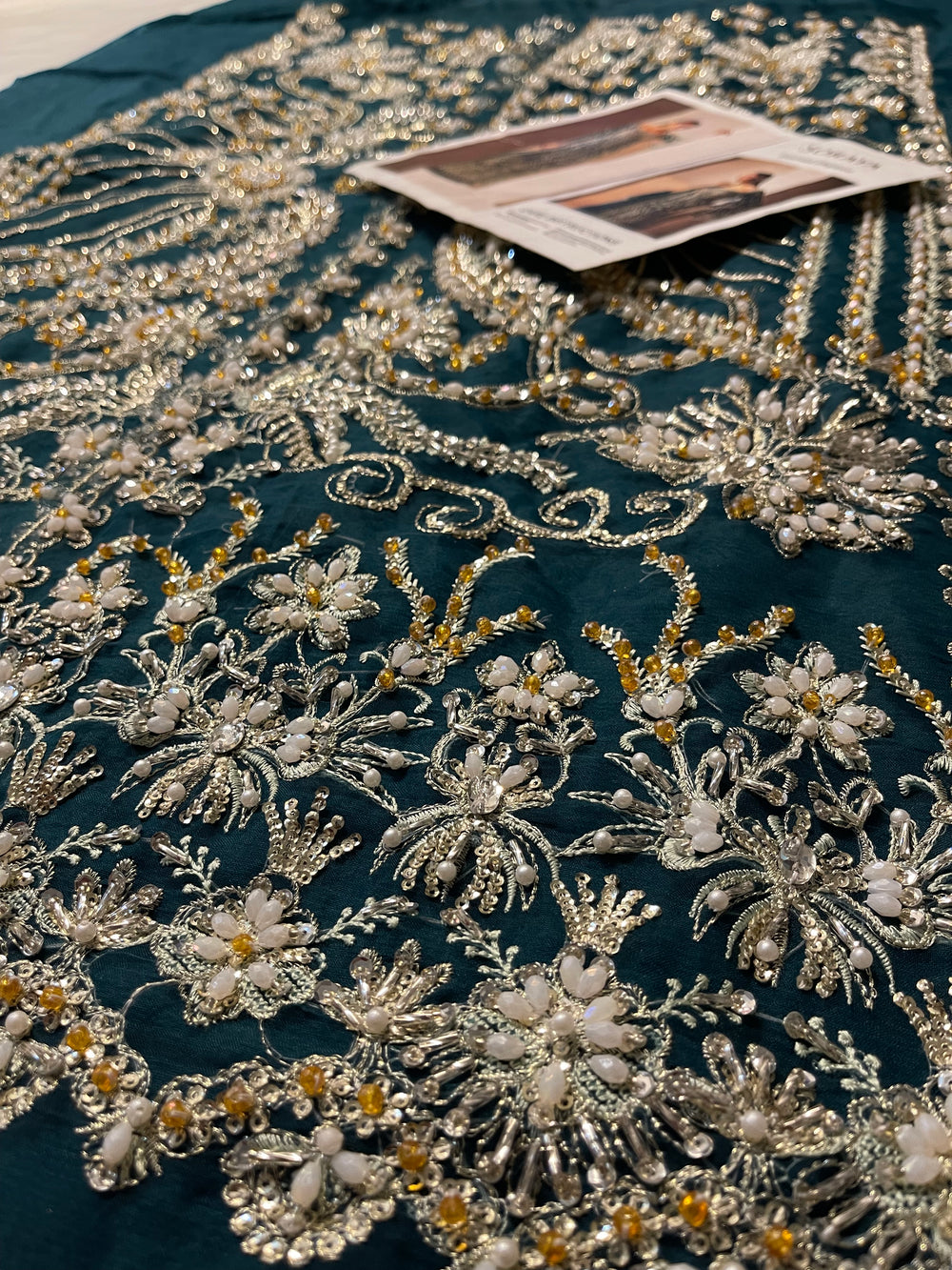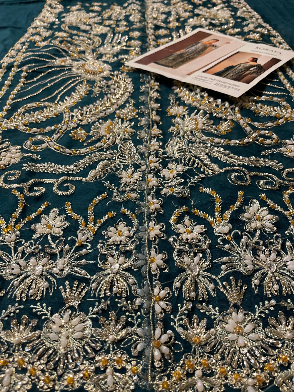 Luxe is a mesmerizing viridescent emerald organza flared gown, adorned with modern, rich silver dhabka, hand beaded details and captivating cape sleeves, elegantly finished with hanging beads paired beautifully with organza duppata heavily embroidered on borders. The ensemble is perfectly complemented by sleek raw silk trousers.